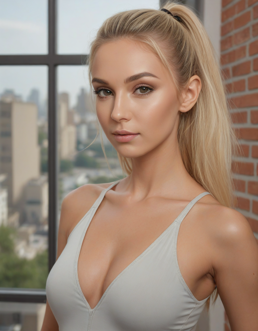 wearing sleeveless leotard, wearing one peice clothing, leotard, sleeveless, , brick wall -> great window view, excessive cleavage, low neckline, revealing chest, revealing cleavage, cleavage-baring, revealing, excessively revealing, very revealing, lowcut, lowrise, , Lip fillers, thick full lips, enhanced lip volume, accented cupid's bow, Rhinoplasty, refined nose shape, straightened nasal profile, facial symmetry, Botox injections, smoothed facial lines, reduced wrinkles, youthful appearance, Cheek fillers, pronounced cheekbones, sculpted contours, lifted cheeks, brightened eyes, reduced under-eye bags, rejuvenated area, Liposuction contoured shape, reduced excess fat, sculpted physique, Dermal fillers, restored volume, smoothed texture, diminished lines, strengthened definition, balanced proportions, enhanced jawline, Facelift, tightened skin, reduced sagging, improved skin tone, reduced imperfections, enhanced clarity, Blepharoplasty, Reduced puffiness, restored youthful eye contour, Enhanced chin shape, improves facial harmony, strengthened jawline definition, symmetry facial features, golden_ratio
