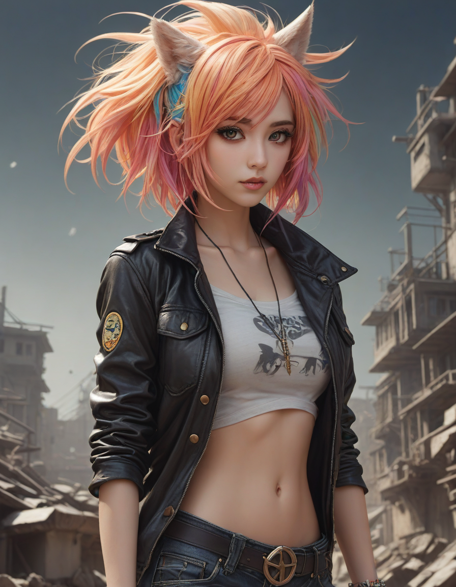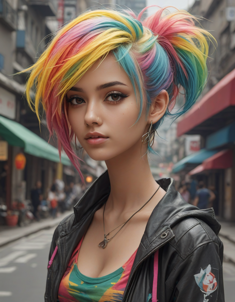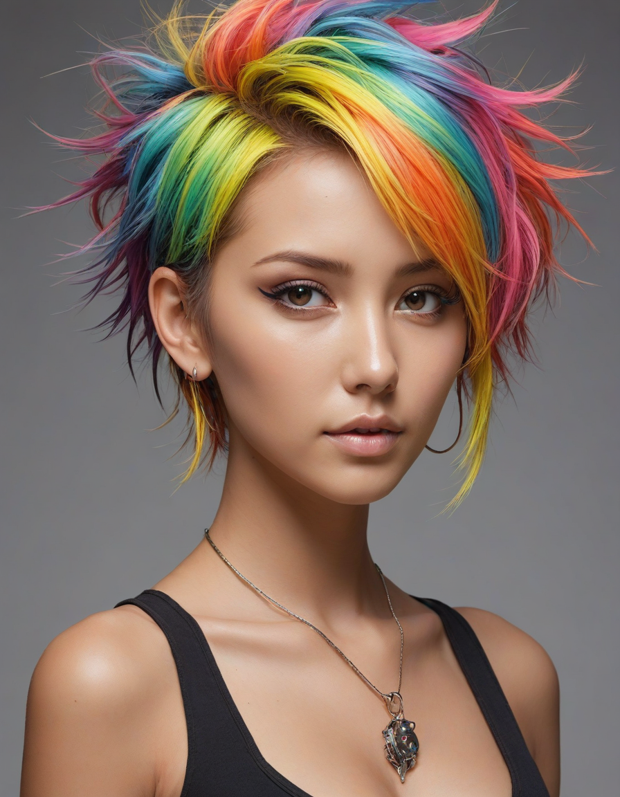 short, spiky, rainbow-colored punk hair, kitsune, hot, model, messy hair, Anime-style hourglass figure, attractive