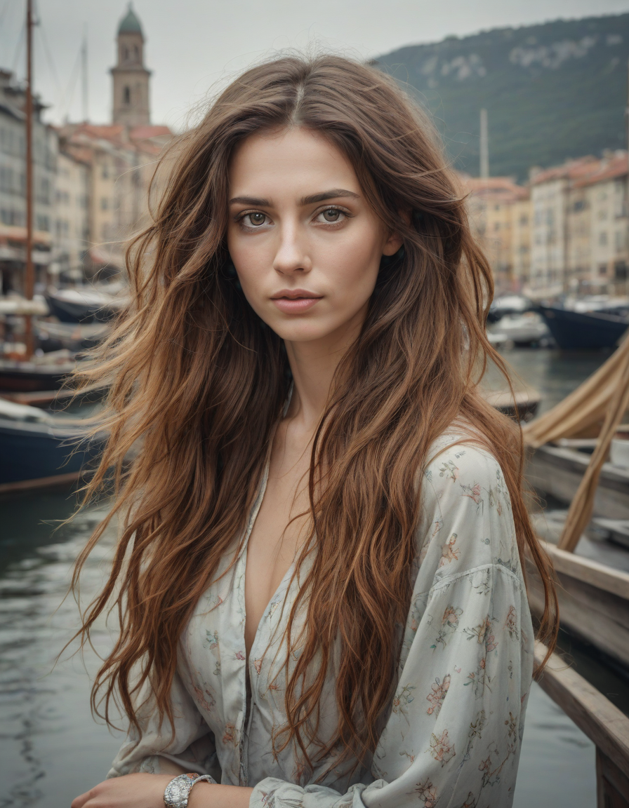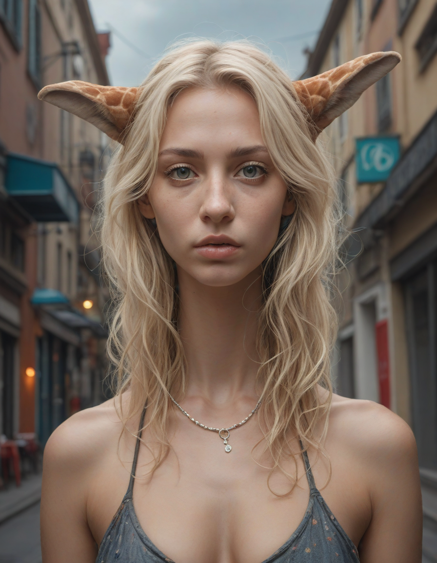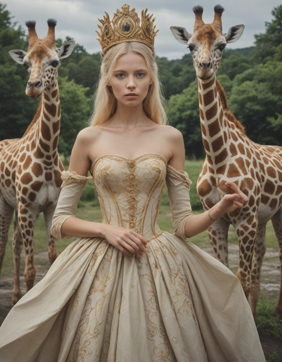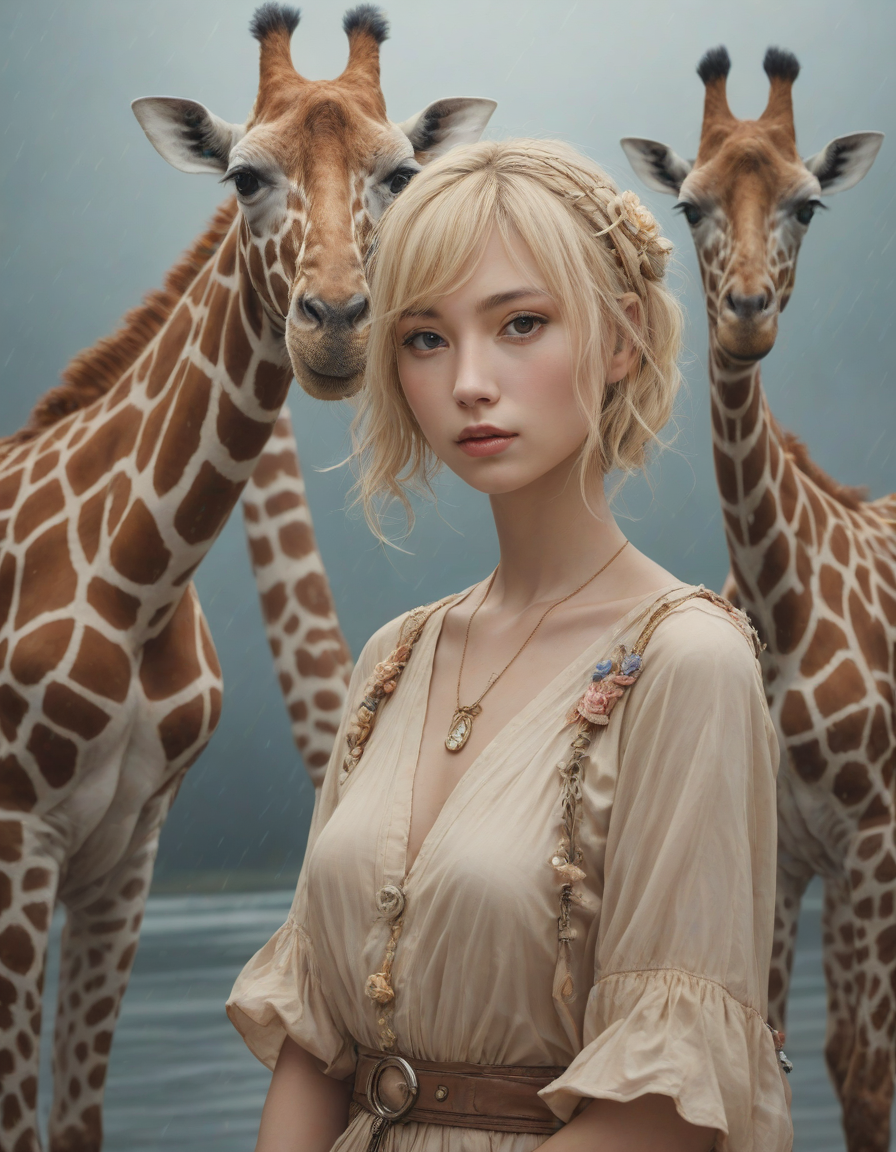 flood, nice hands, melancholic, Prismatic renaissance, whimsical fairytale, Eyes glint with mischief, a head tilting, a question asked without words, Gargantuan giraffes, hair flowing in the wind