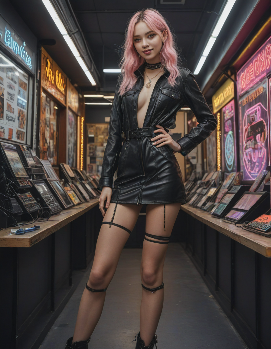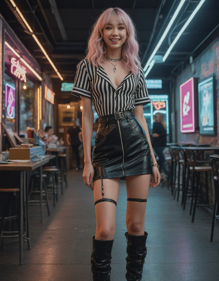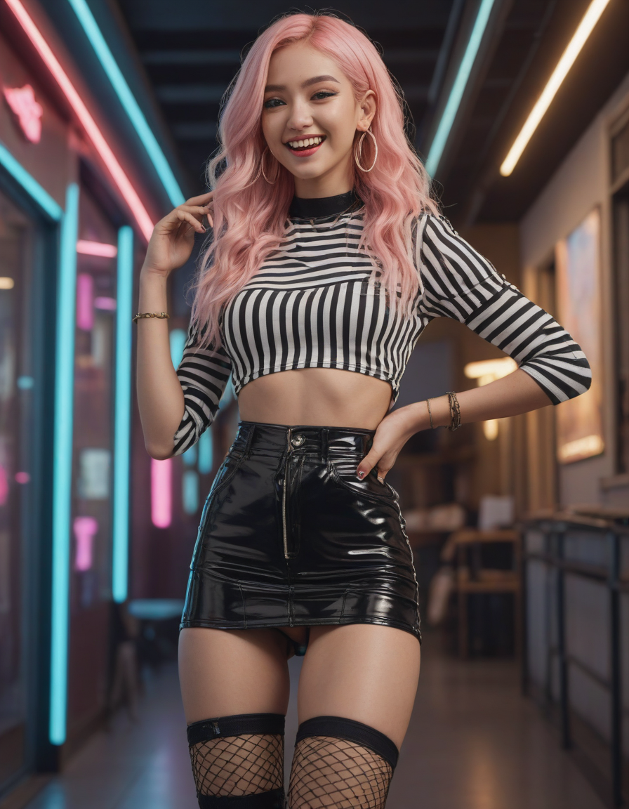 laughing, elegant, high waist tight overknee stiletto boots, looking at viewer, tall woman, Visualize a photorealistic portrayal of an 18-year-old high school senior girl, epitomizing the e-girl aesthetic with a blend of internet culture's vibrancy and personal audacity. Clad in an oversized striped shirt under a black graphic t-shirt dress, her style is a testament to e-girl fashion's layered intricacy, complemented by fishnet tights and chunky boots. Her makeup features dramatic winged eyeliner, neon eyeshadow, and dark lipstick, with blush bringing her face to life. Accessories like silver chains and a heart pendant choker, along with pastel or neon hair streaks, enhance her playful rebellion. Standing hands-on-hips, she exudes confidence and individuality against a backdrop suggestive of e-girl life, with neon signs and string lights. This scene captures her bold identity and expressive spirit at this pivotal moment.
