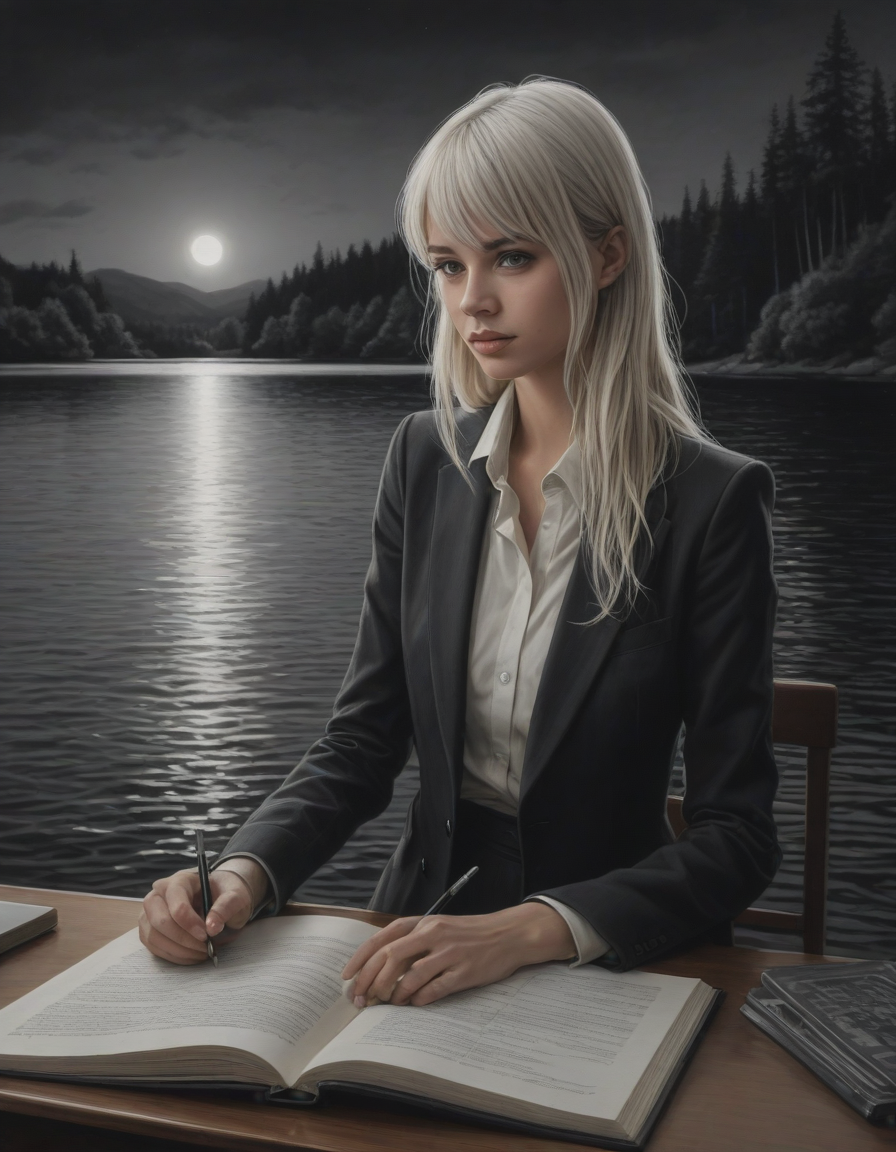 is pretty, tranquil lake, Glistening blade reflecting the wavering torchlight, vibrant dream, charcoal sketches on textured paper, in a suit, glow in the dark, tense