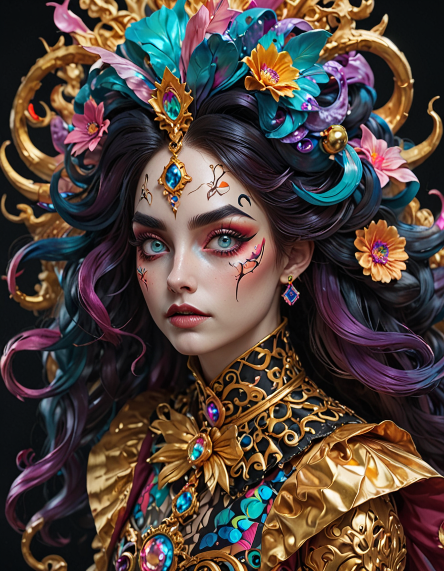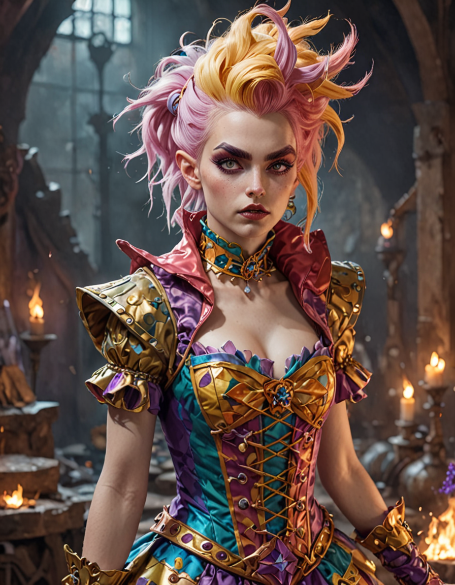 generic businessman, plain black fedora, drab grey suit→Wonderland mad hatter, tall patterned top hat, eccentric colorful suit