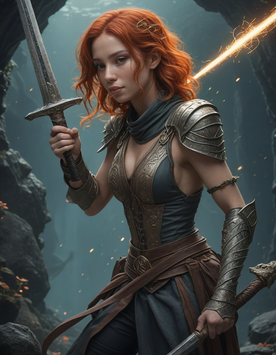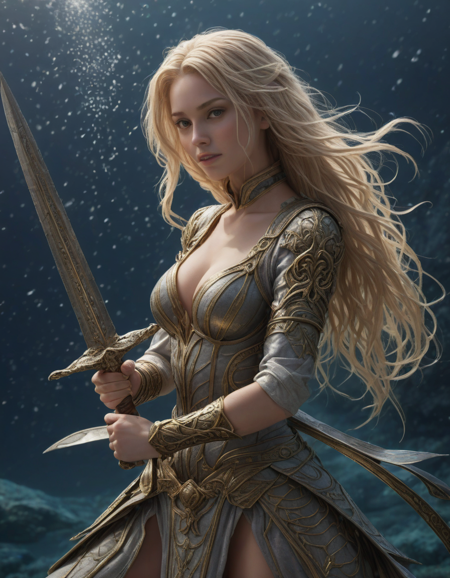 Holding a sword in both hands in a confident pose, detailed grip, detailed fuller, detailed pommel, detailed blade, detailed edge, , speechless in awe, hugs embracing tightly, lizardperson, fireworks, underwater, Serenely, courage