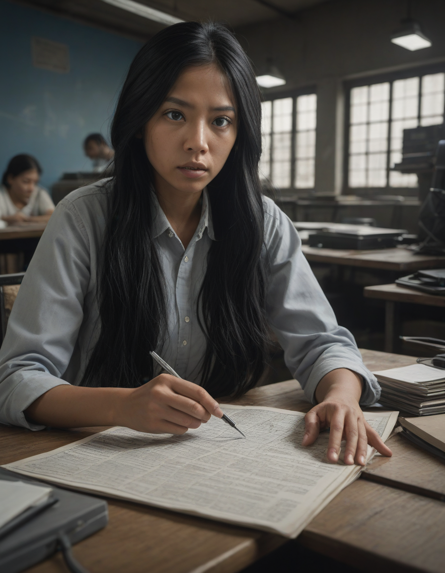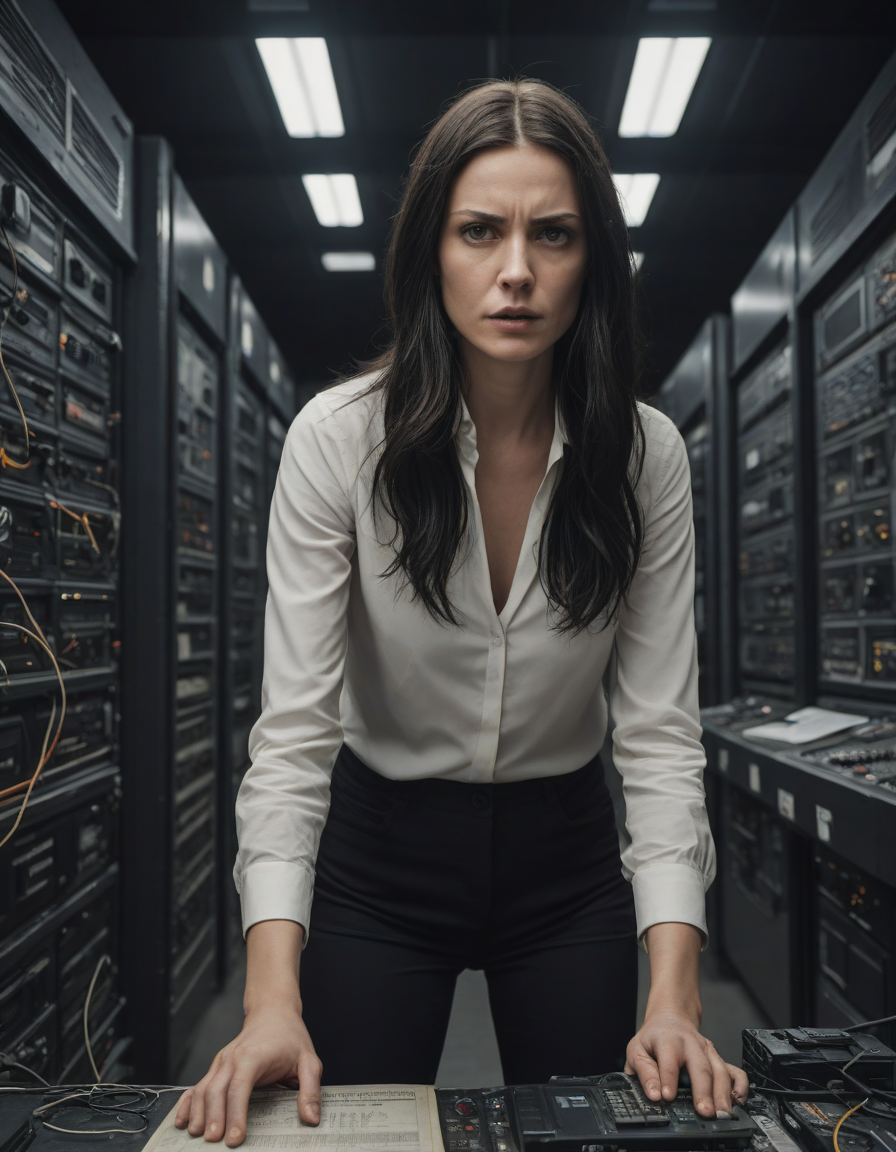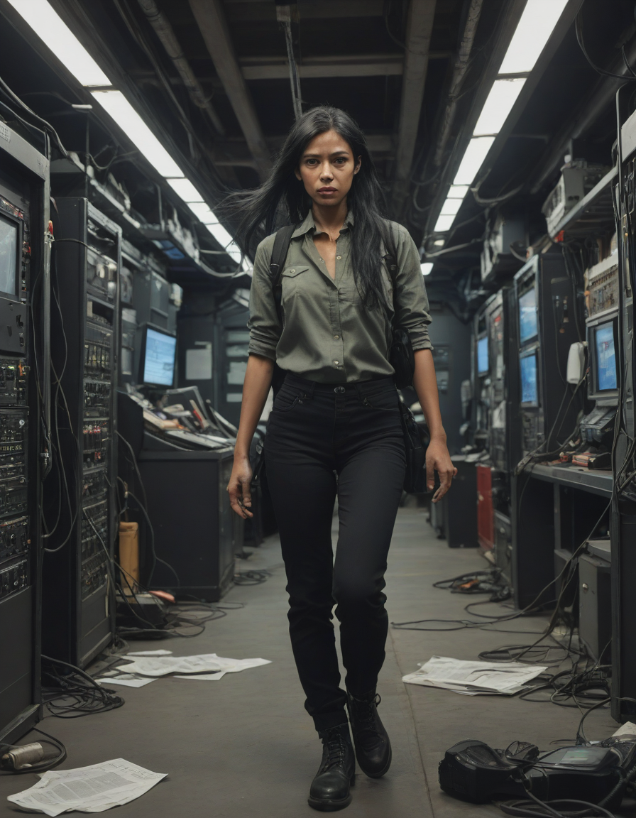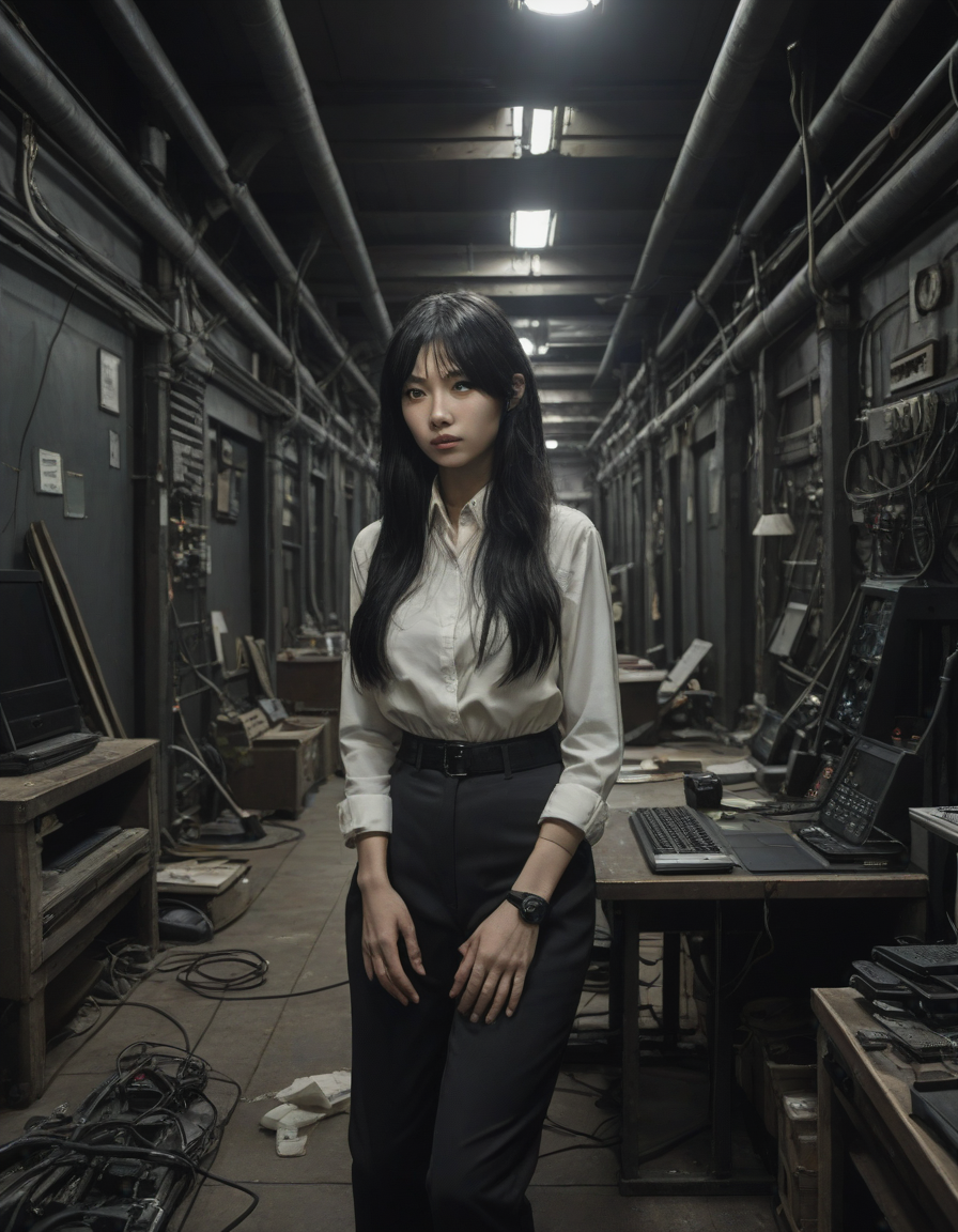 newspaper editorial photography, suspenseful chase scene, long black hair, Gear-filled tech-lair in an underground chamber, Grunting for control