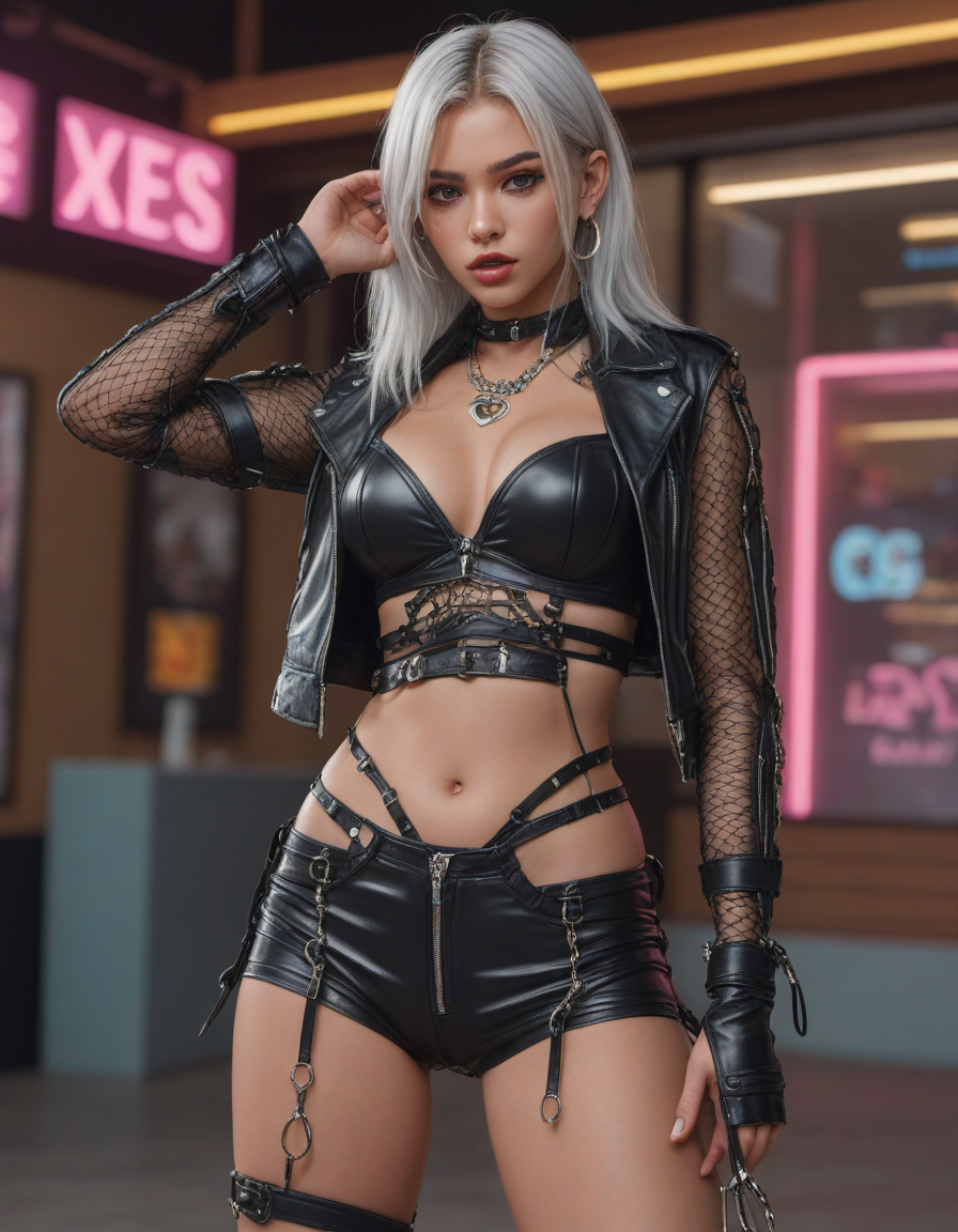Her makeup is a canvas of e-girl artistry, with dramatic winged eyeliner that stretches towards her temples in a bold statement, eyeshadow in neon hues that electrify her gaze, and dark, matte lipstick that draws all eyes to her. A generous application of blush adds life and vibrancy to her cheeks, complemented by creatively designed nails that are both dark and daring. Accessories—silver chains, a heart pendant choker, and a collection of rings—add layers of personality and depth. Her hair, possibly featuring pastel or neon streaks, is styled in a way that balances edge with elegance, with temporary tattoos or stickers adorning her face to accentuate her playful rebellion.