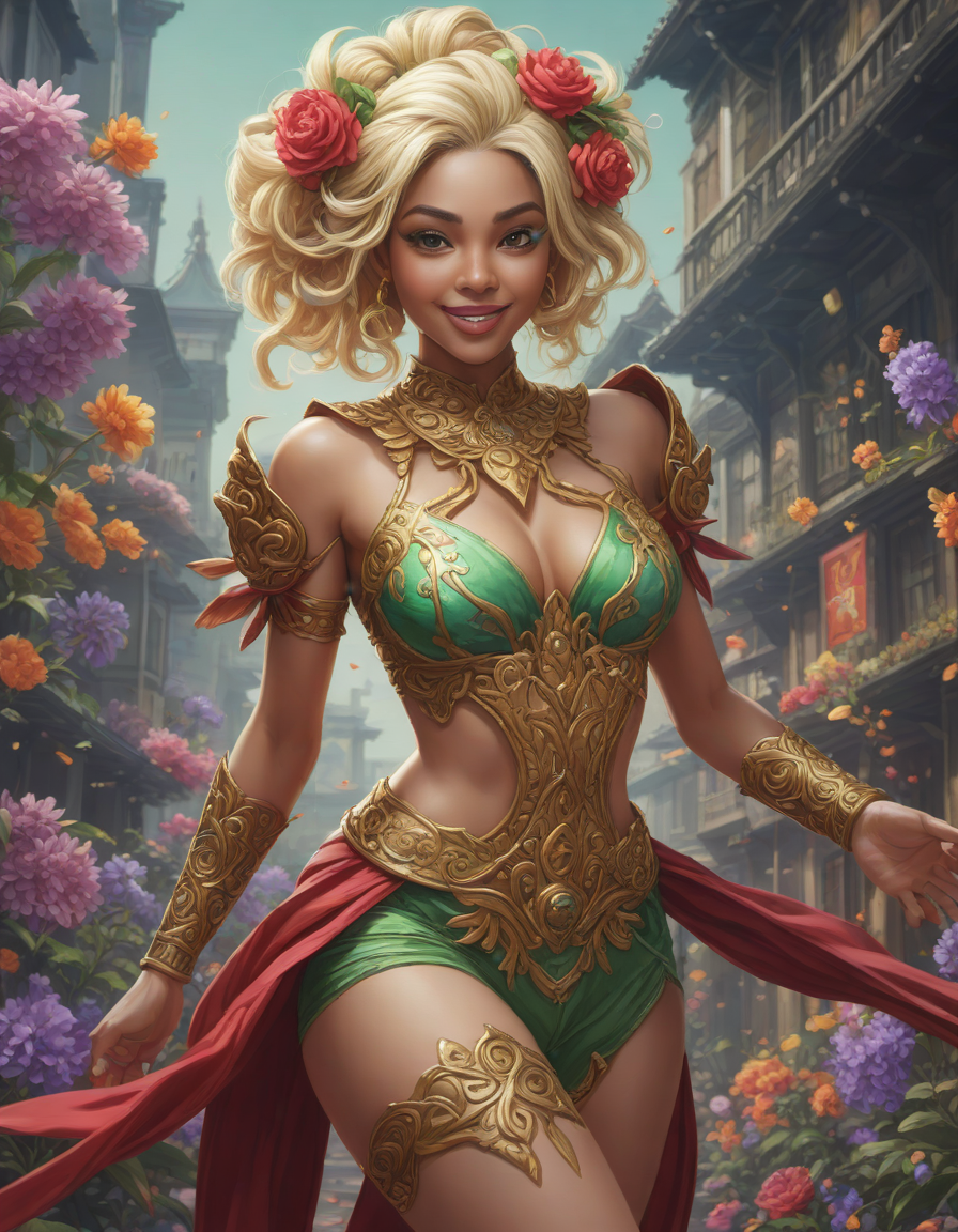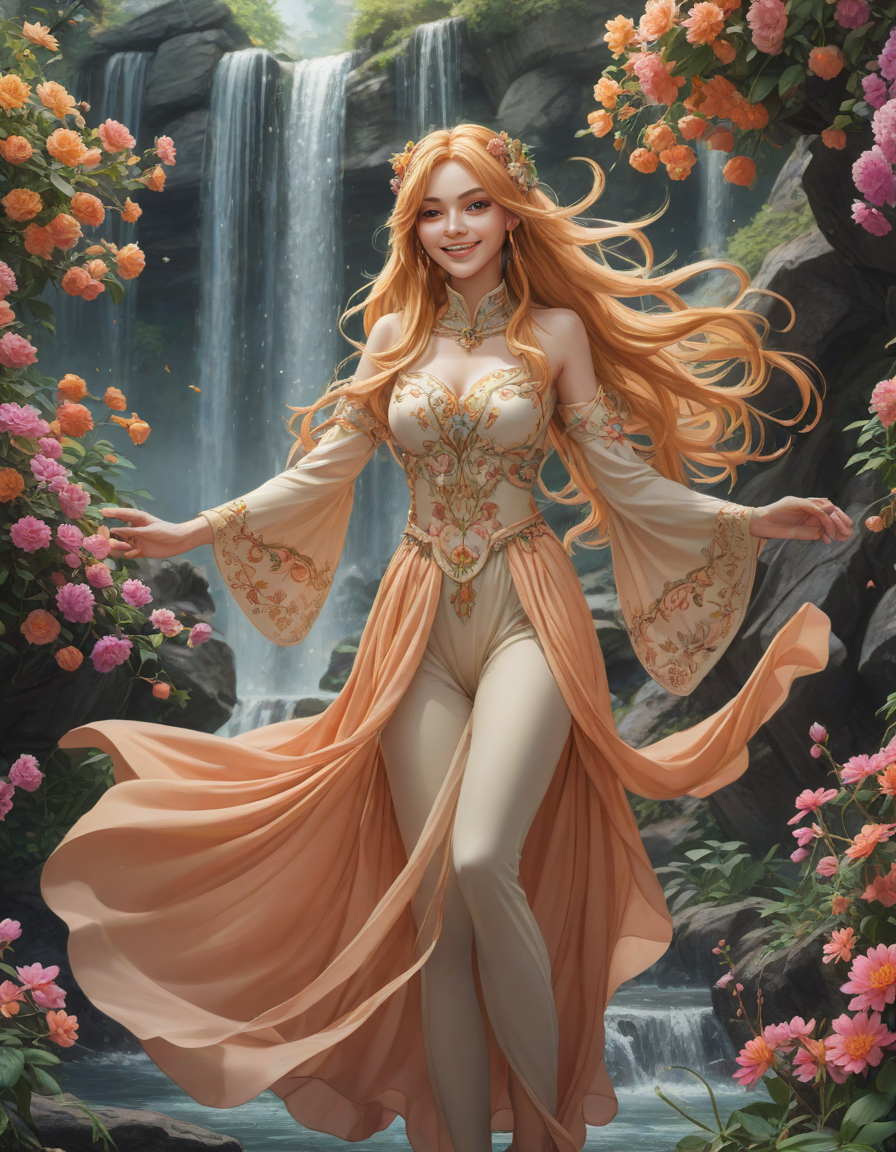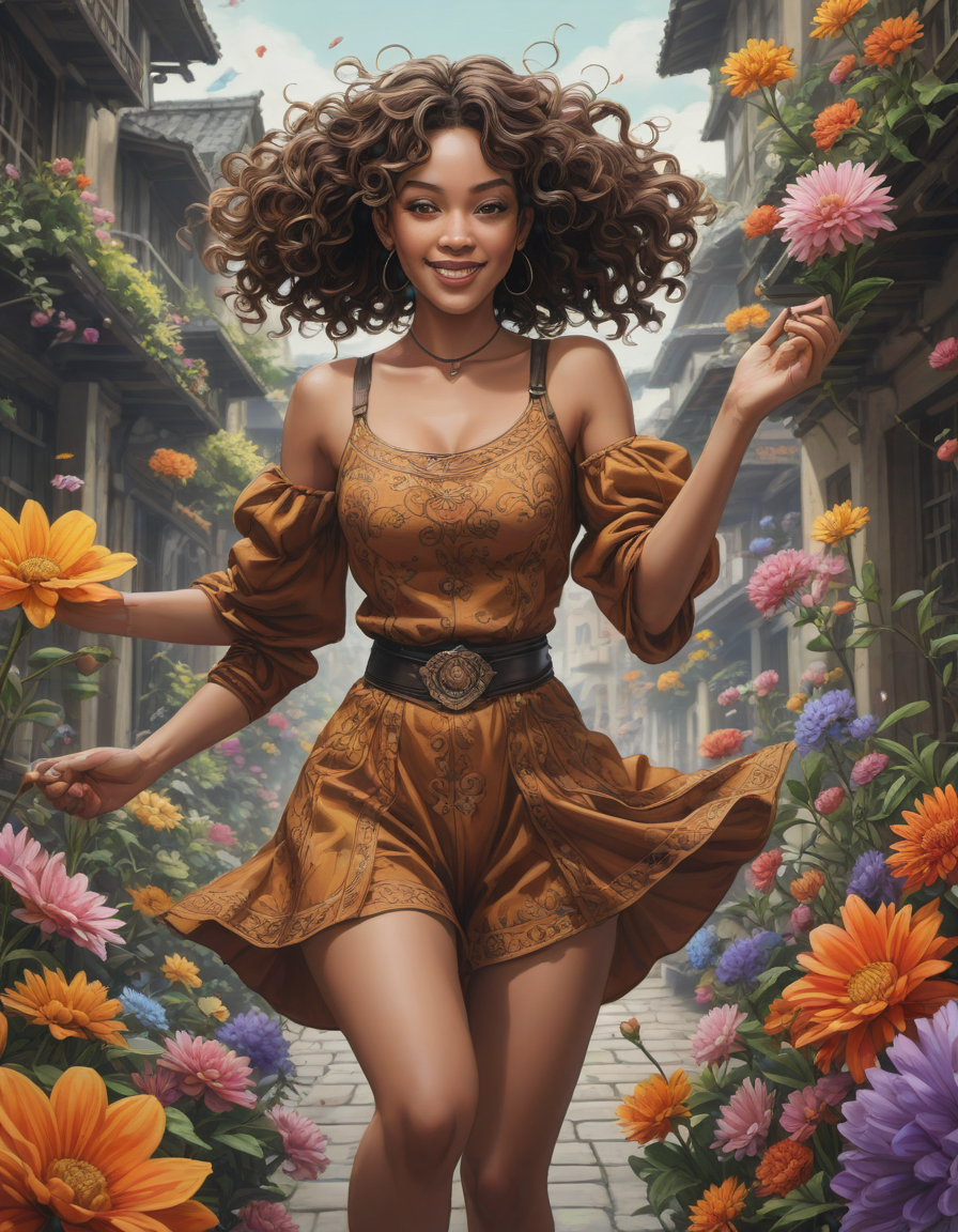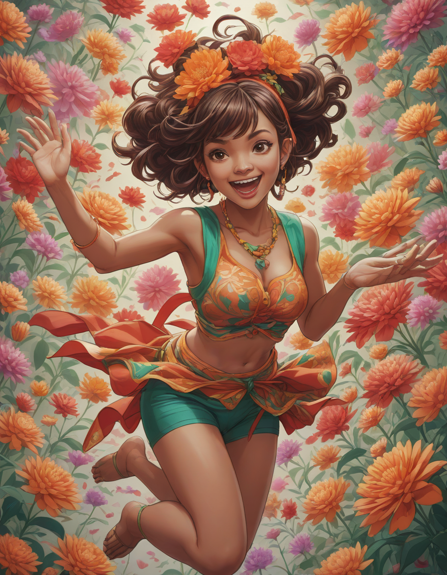 diverse, blooming flowers, jumping for joy, Women in vibrant Anime costumes