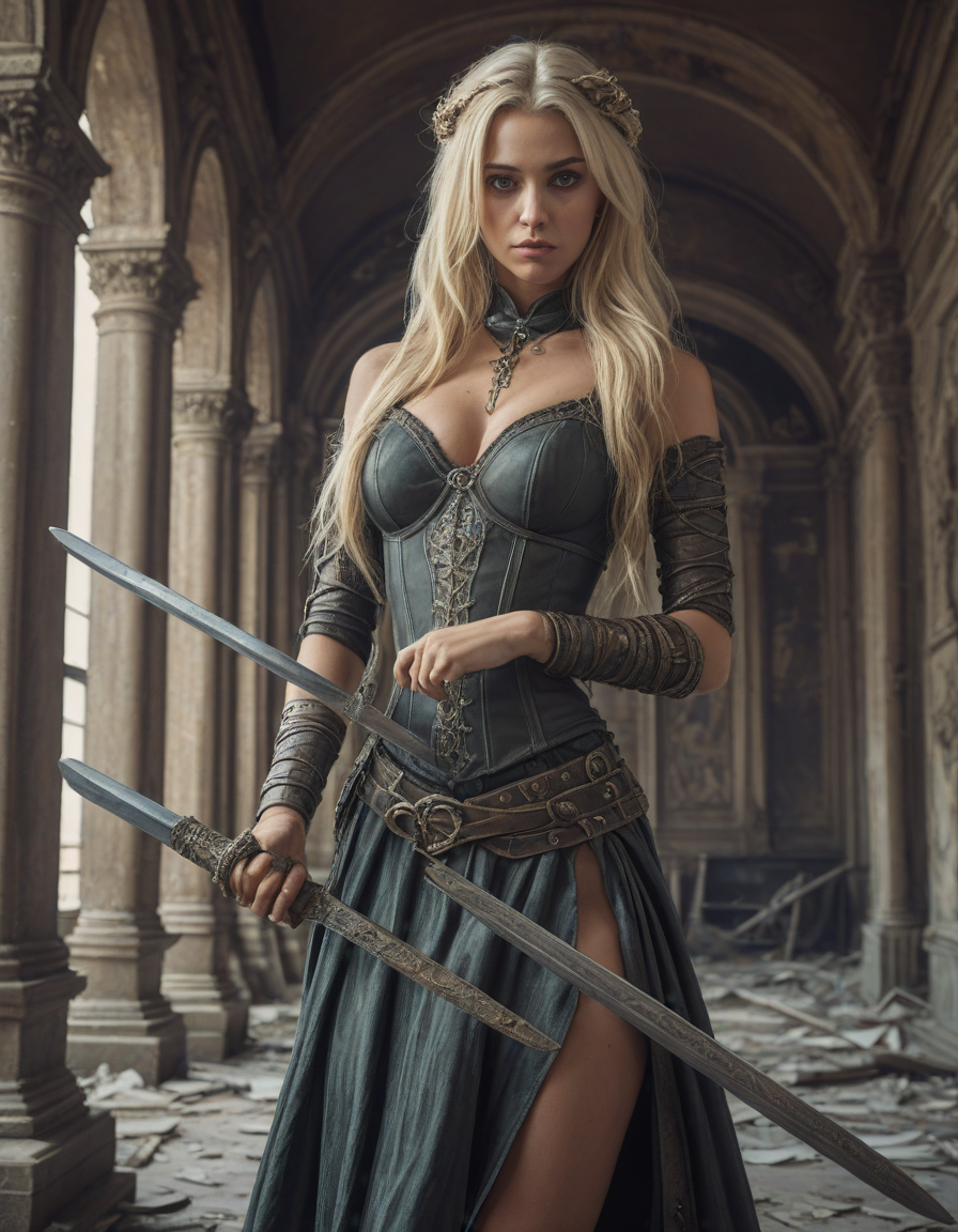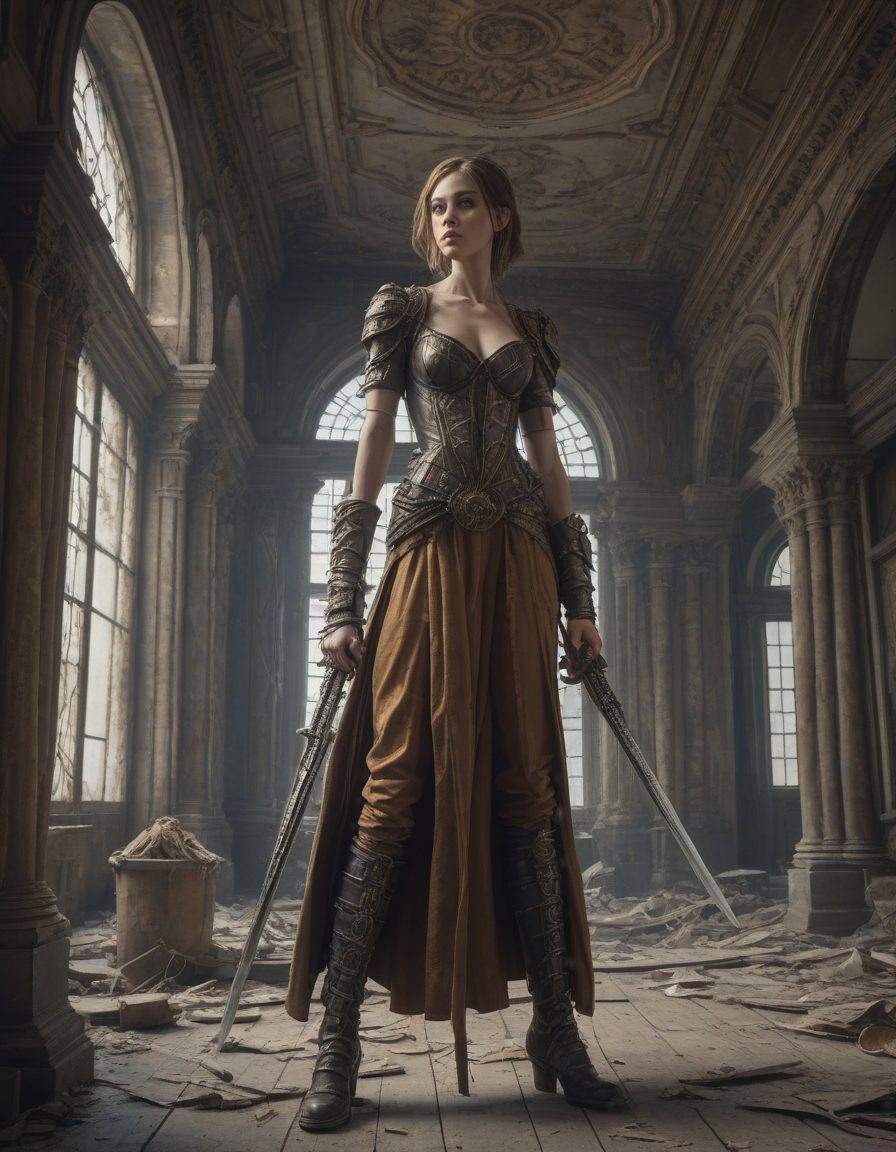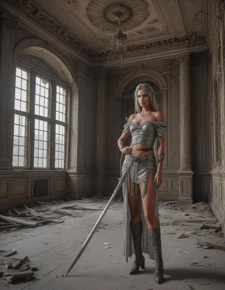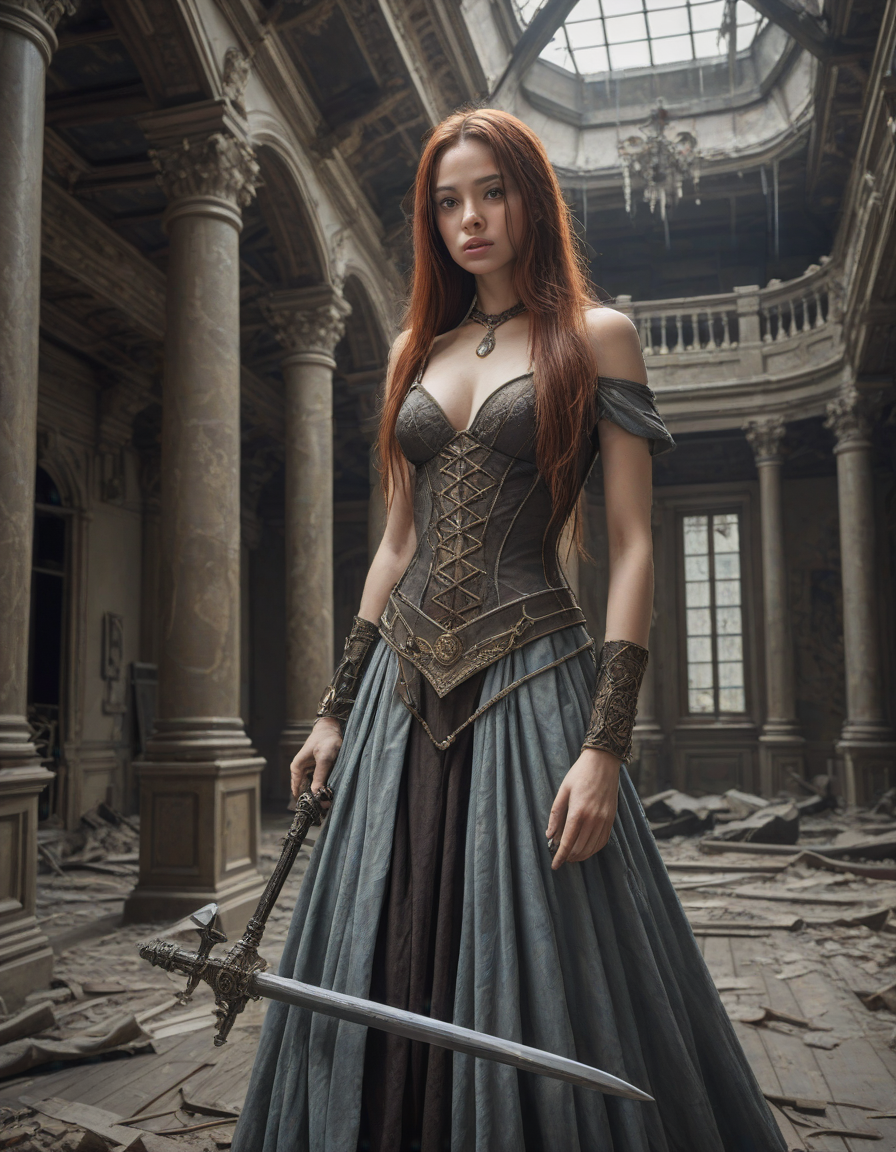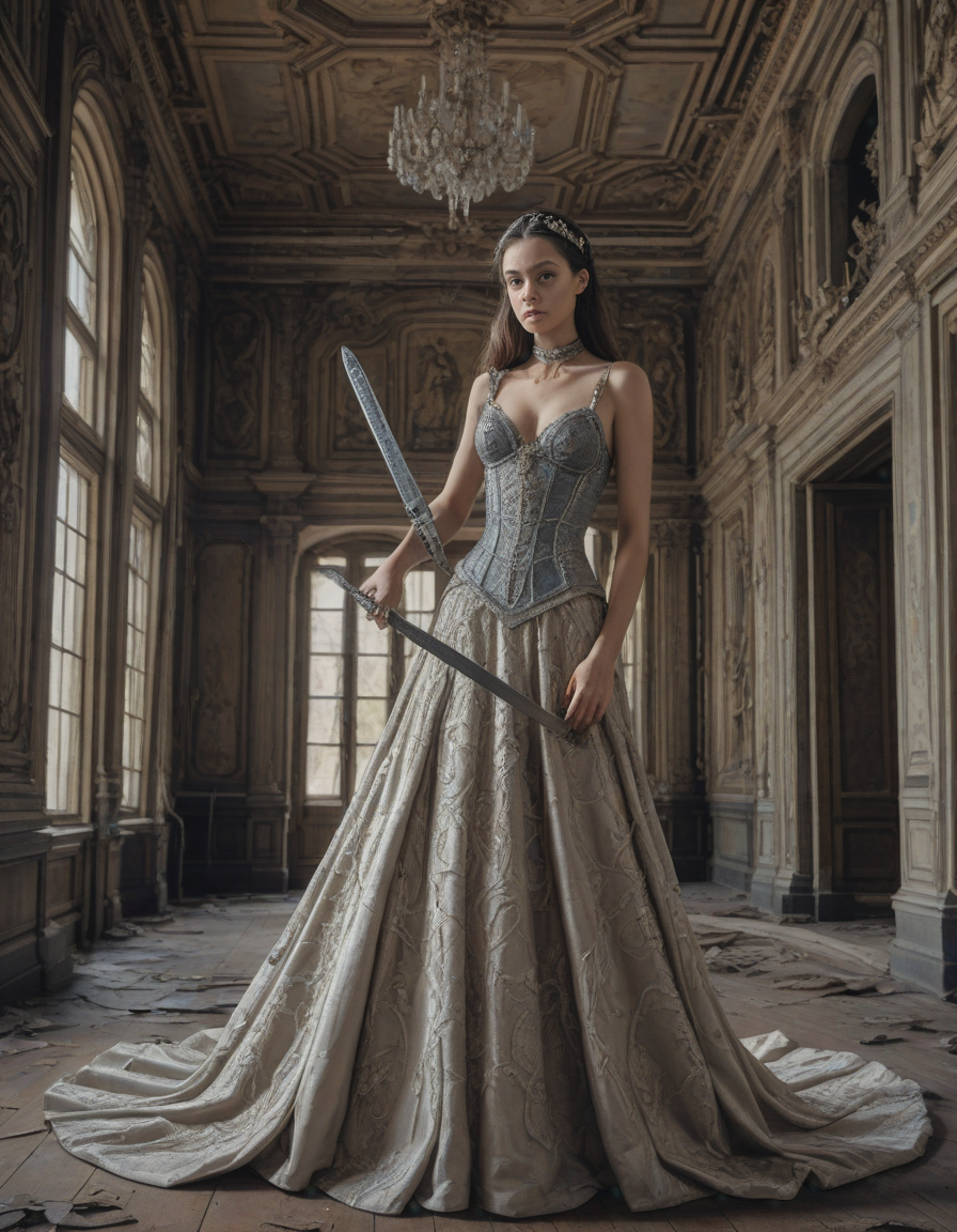 in the opera house, Holding a sword in both hands in a confident pose, detailed grip, detailed fuller, detailed pommel, detailed blade, detailed edge, , post apocalypse, Gossamer cobwebs adorning an abandoned mansion