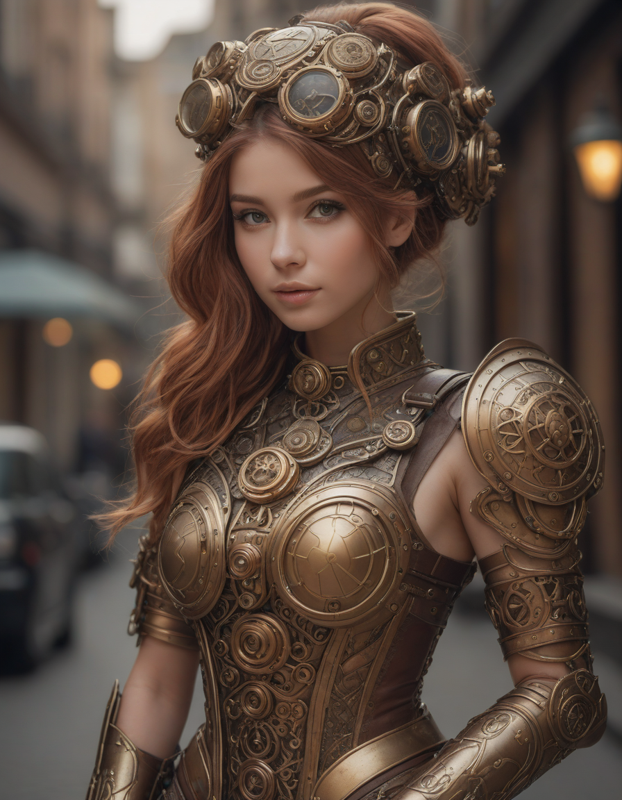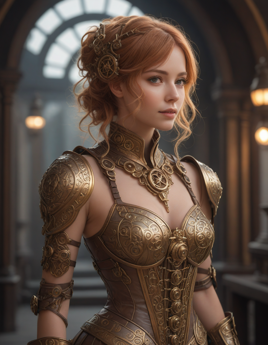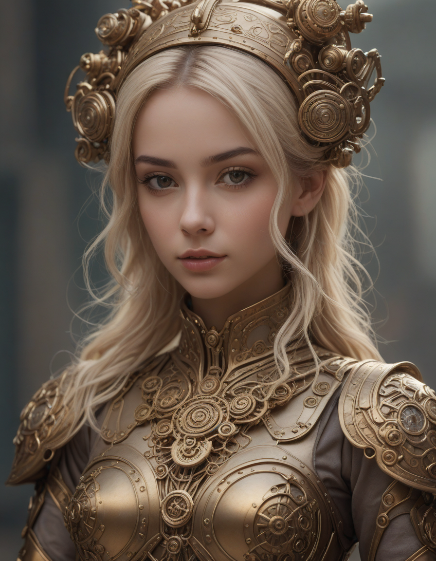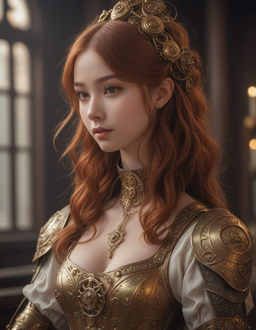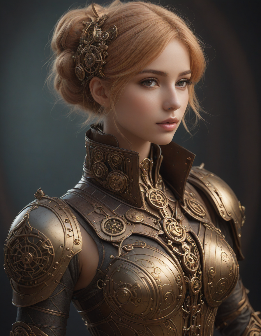 soft dreamy lighting, hazy ethereal glow, cute, adorable, minimalist, highly detailed steampunk armor with intricate gears and mechanisms