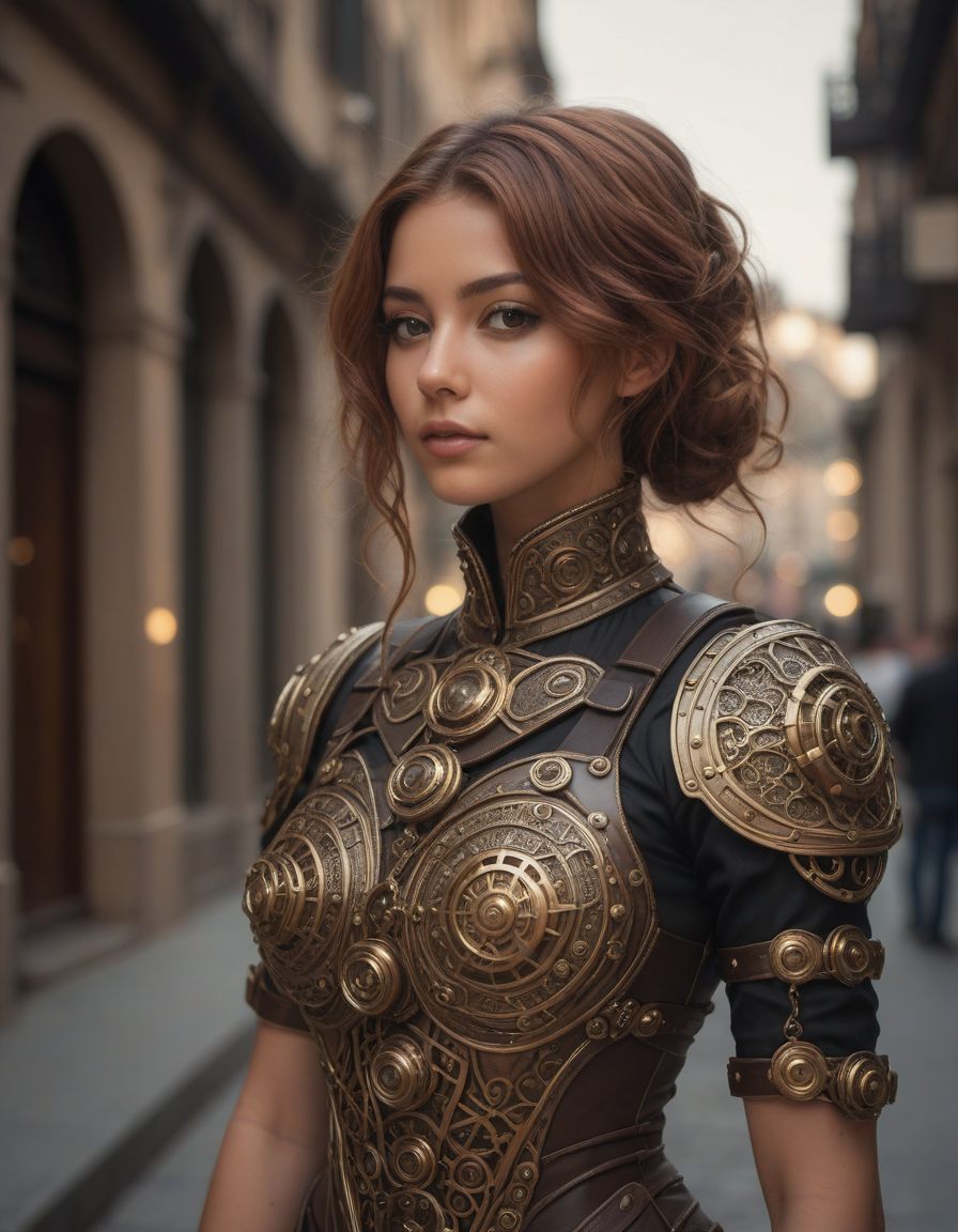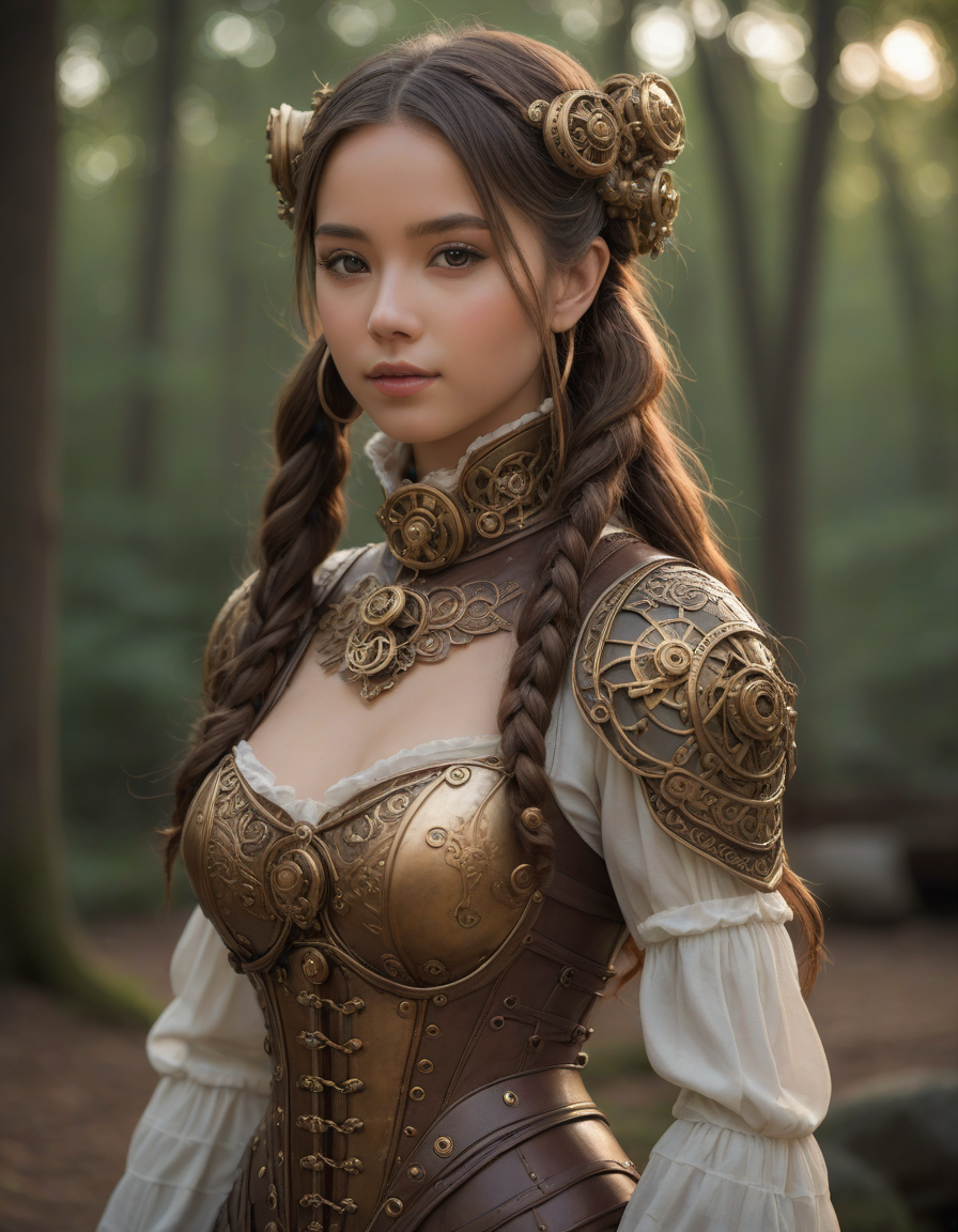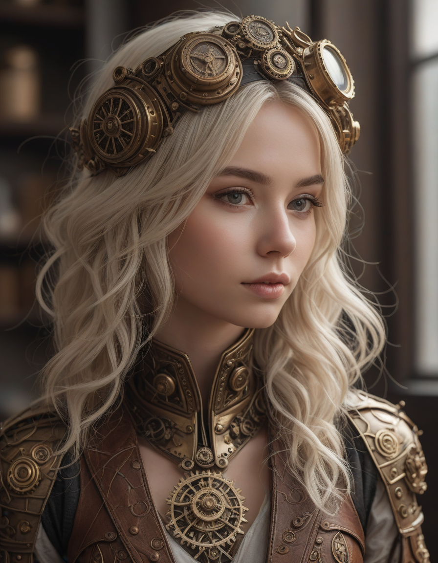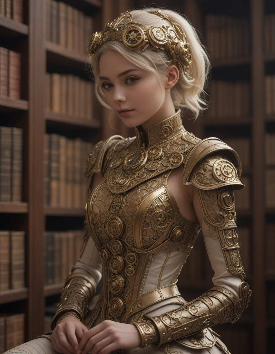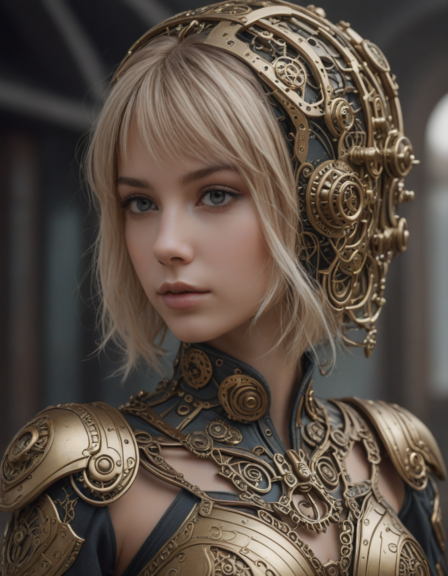 soft dreamy lighting, hazy ethereal glow, cute, adorable, minimalist, highly detailed steampunk armor with intricate gears and mechanisms