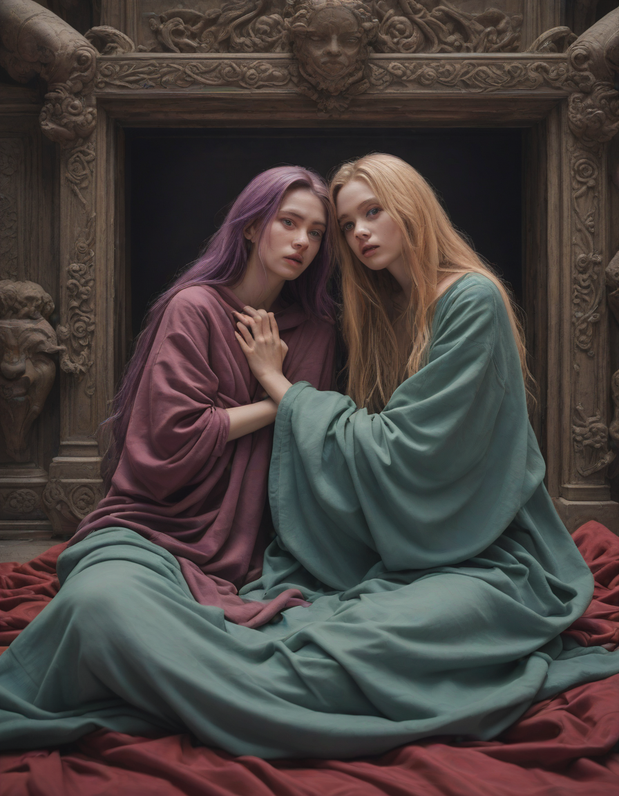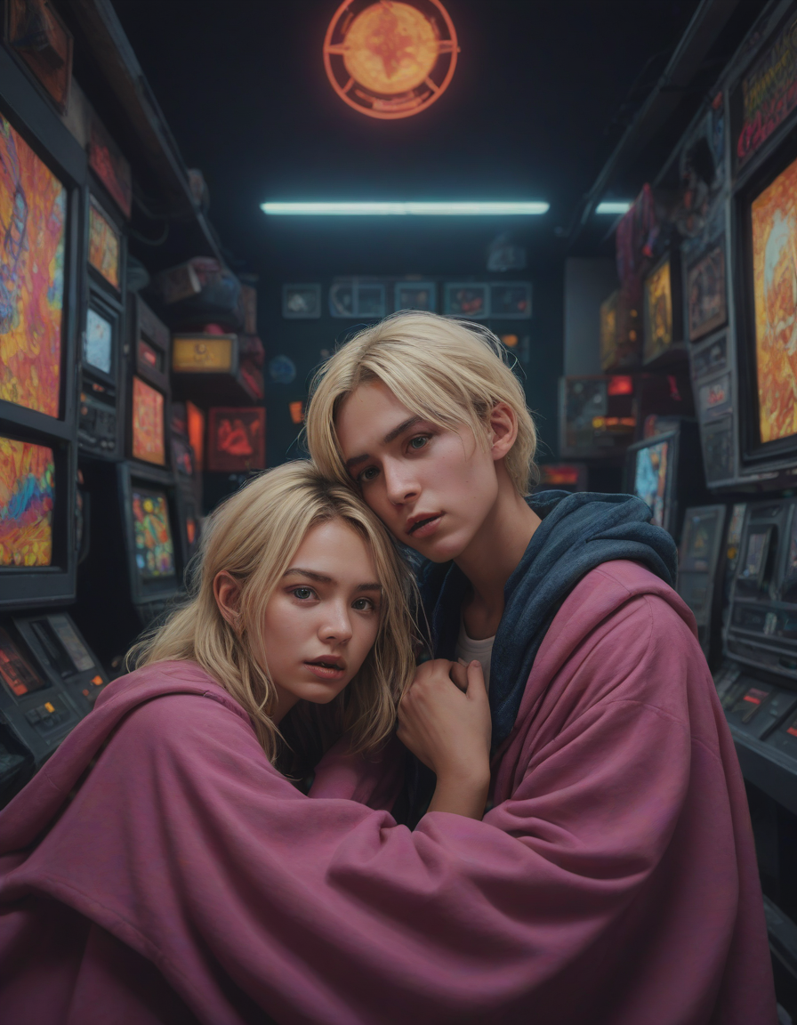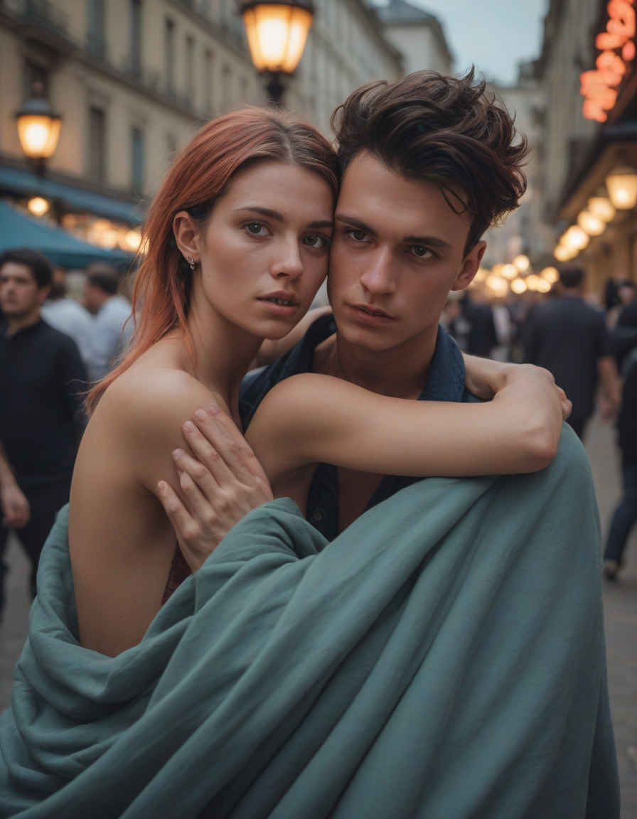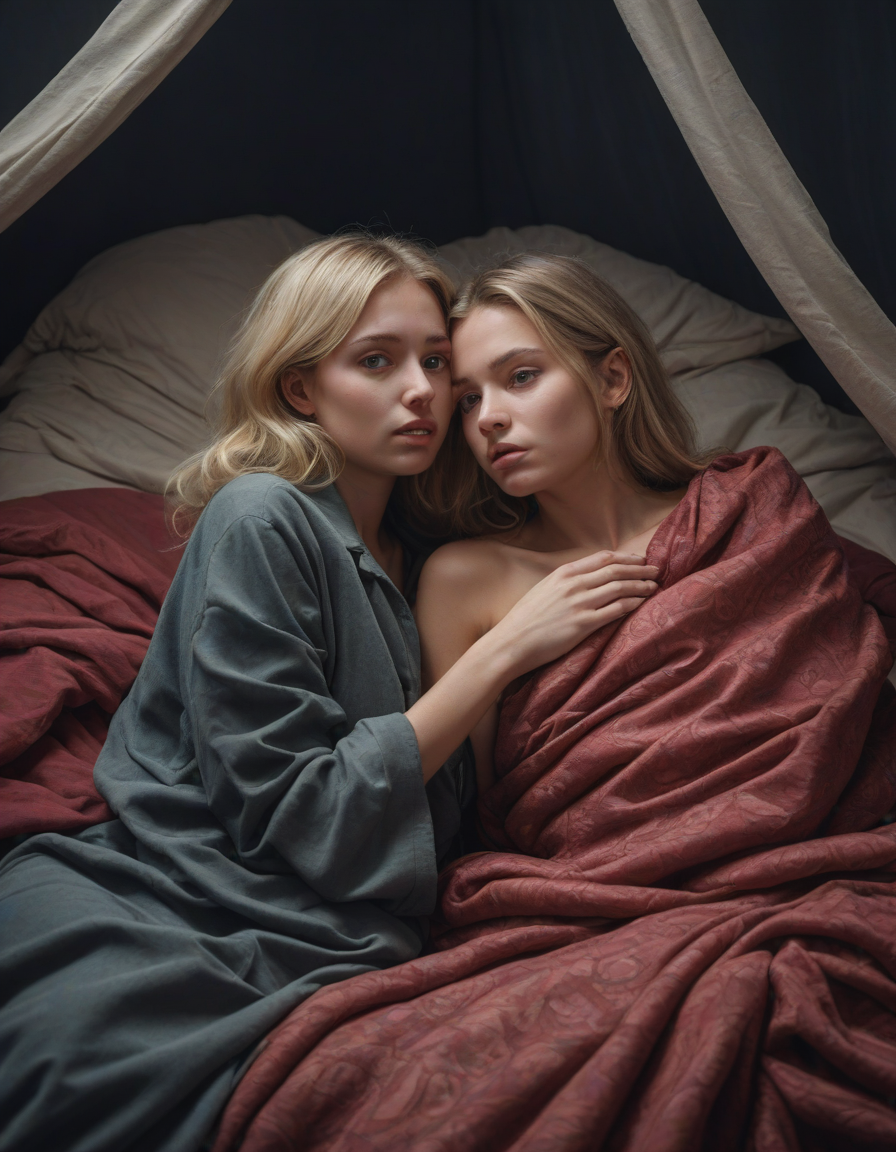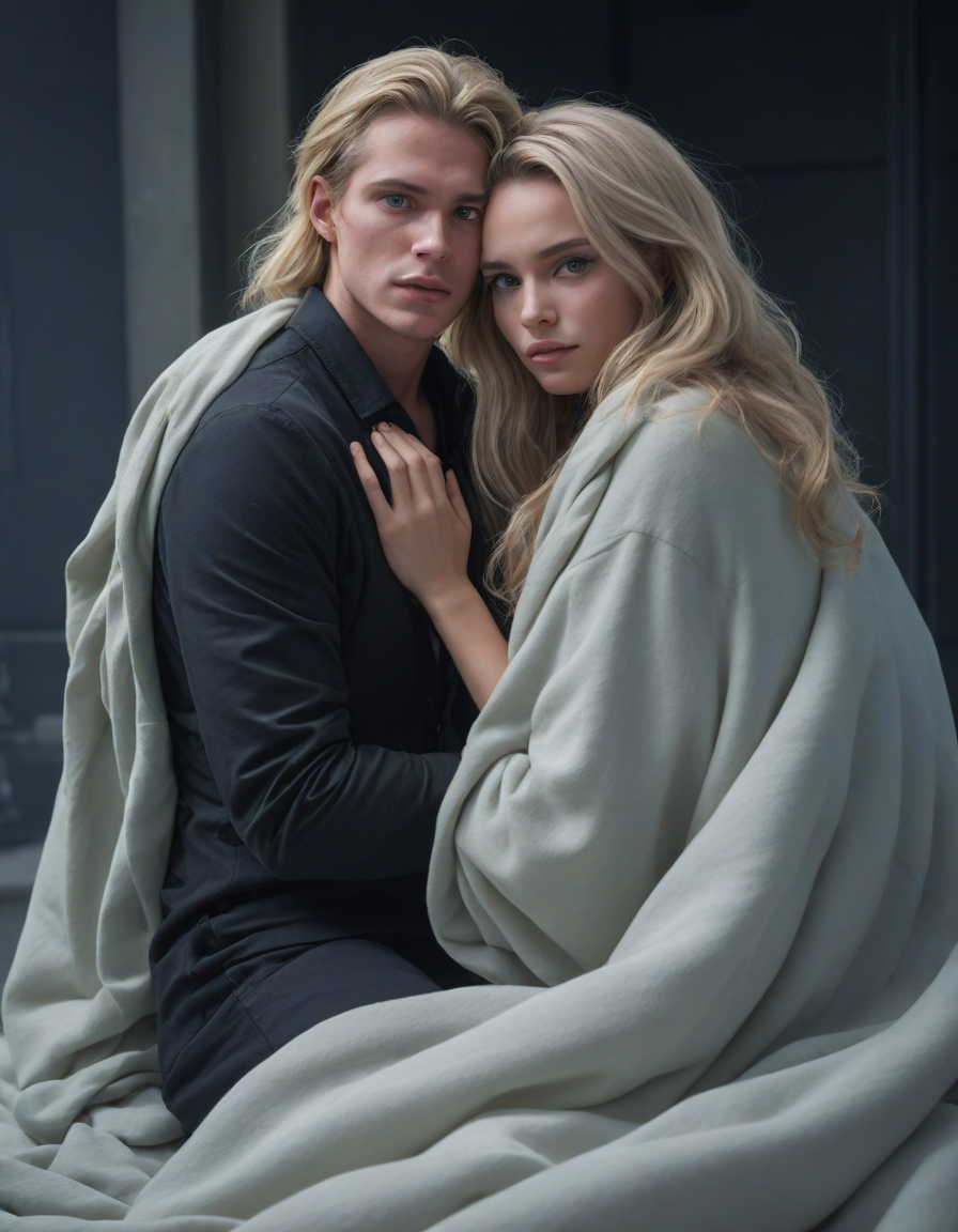 Gazing in disbelief, cuddling together under a blanket, utopian paradise, the camera, (centered on a) wondrous scene, panicked, colorful, Witching hour, demon, Love strikes again