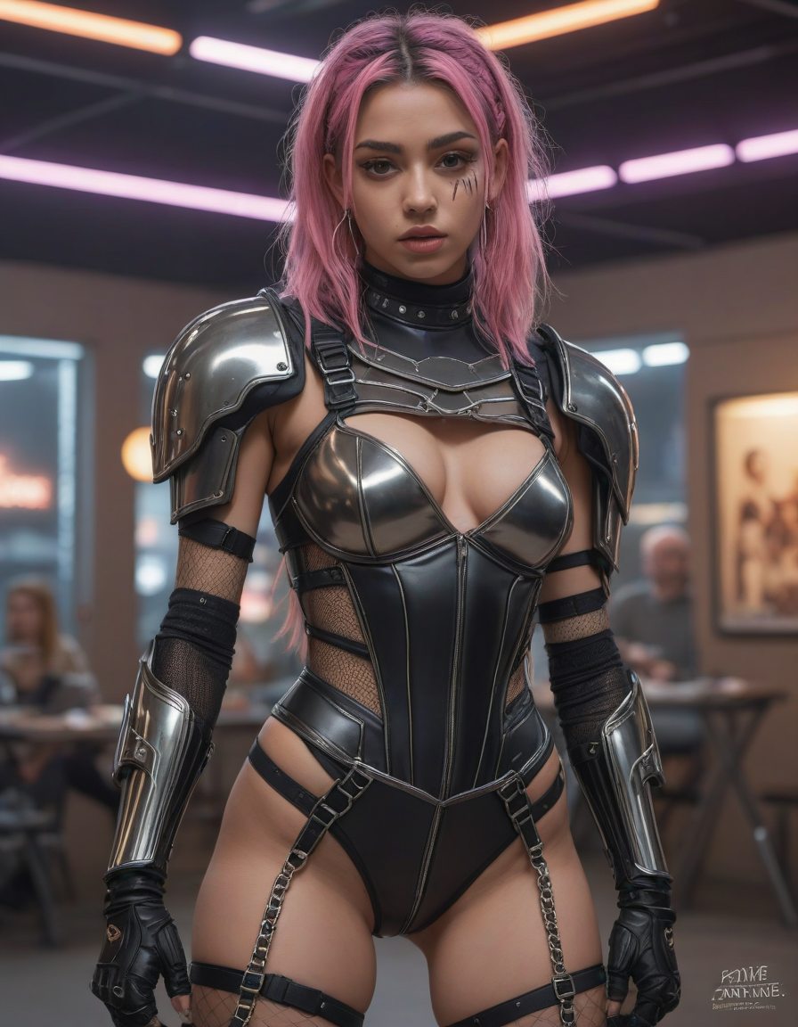 Visualize a photorealistic portrayal of an 18-year-old high school senior girl, epitomizing the e-girl aesthetic with a blend of internet culture's vibrancy and personal audacity. Clad in an oversized striped shirt under a black graphic t-shirt dress, her style is a testament to e-girl fashion's layered intricacy, complemented by fishnet tights and chunky boots. Her makeup features dramatic winged eyeliner, neon eyeshadow, and dark lipstick, with blush bringing her face to life. Accessories like silver chains and a heart pendant choker, along with pastel or neon hair streaks, enhance her playful rebellion. Standing hands-on-hips, she exudes confidence and individuality against a backdrop suggestive of e-girl life, with neon signs and string lights. This scene captures her bold identity and expressive spirit at this pivotal moment., wearing complete set of armor, wearing full armor, Wearing chest armor, wearing leg armor, wearing feet armor, wearing bracer, wearing pauldrons, Wearing helmet, Wearing breastplate, Wearing gauntlets, Wearing greaves, Wearing pauldrons, Wearing vambraces, Wearing cuisses, Wearing sabatons, Wearing gorget, Wearing tassets, Wearing bracers, Wearing cuirass, Wearing faulds, Wearing plackart, Wearing spaulders, Wearing besagews, provocative clothing, slutty clothing, skimpy clothing, revealing clothing, seductive clothing, coquettish clothing, coquettish, seductive, taboo, sheer clothing,