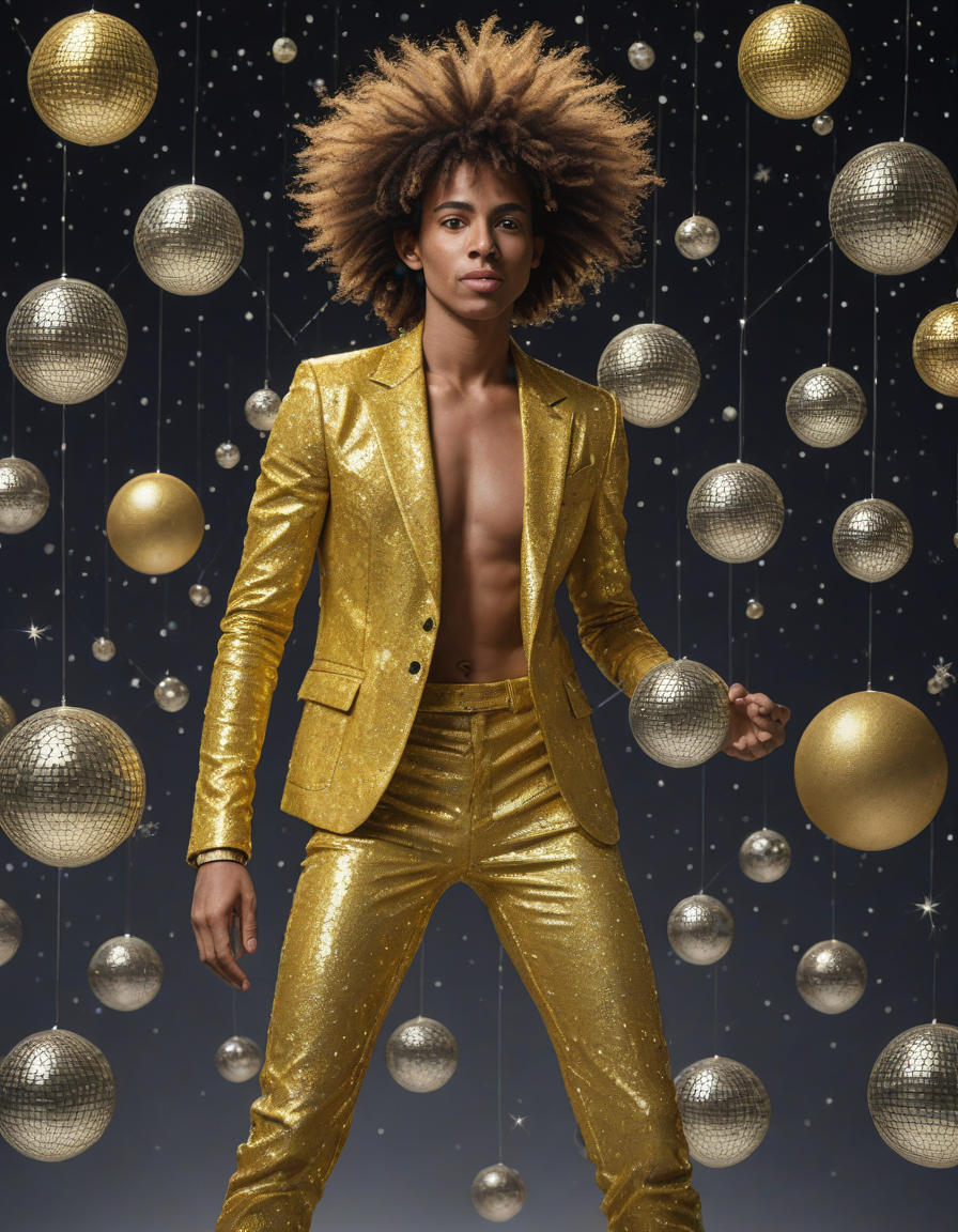 diverse, wearing a banana suit, tense, glittering night sky, disco ball evening