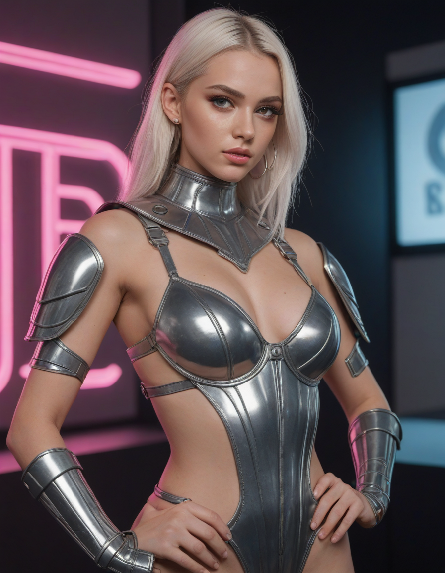 This visualization retains the essence of our previous description, now enhanced by a pose that speaks volumes of her confidence and the vibrant spirit of the e-girl aesthetic. It captures not just the photorealistic image of a young woman in the throes of digital age culture but also the bold statement of identity and self-expression that defines her at this significant moment in her life., Wielding a one-handed weapon in both hands, one-handed weapon, weapon, , Visualize a photorealistic portrayal of an 18-year-old high school senior girl, epitomizing the e-girl aesthetic with a blend of internet culture's vibrancy and personal audacity. Clad in an oversized striped shirt under a black graphic t-shirt dress, her style is a testament to e-girl fashion's layered intricacy, complemented by fishnet tights and chunky boots. Her makeup features dramatic winged eyeliner, neon eyeshadow, and dark lipstick, with blush bringing her face to life. Accessories like silver chains and a heart pendant choker, along with pastel or neon hair streaks, enhance her playful rebellion. Standing hands-on-hips, she exudes confidence and individuality against a backdrop suggestive of e-girl life, with neon signs and string lights. This scene captures her bold identity and expressive spirit at this pivotal moment., oval face shape, almond-shaped eyes, voluminous lashes, slightly arched eyebrows, narrow nasal bridge, rounded nose tip, symmetrical nostrils, full lips, pronounced cupid's bow, slightly fuller lower lip, defined cheekbones, rounded chin, smooth complexion, softly contoured jawline, balanced facial proportions, symmetrical features, gently curved eyelids, soft brow ridge, harmonious cheek to jawline transition, subtle philtrum, delicate ear lobes, straight blonde hair, clear skin, hooded eyelids, light pink lip color, slightly pouty expression, casual pose with hand on face, slight head tilt, indoor lighting, Light blue irises, Medium-thickness eyebrows, Softly angled eyebrows, A hint of freckles across the nose and cheeks, Natural makeup, Gentle frown lines between the eyebrows, Soft nasolabial folds, Smooth forehead, Subtle dimple on the chin, Clear facial contour without distinct shadows, Even skin tone with a hint of natural pink undertones, Slightly rosy cheeks, Tapered jawline, Fine hair texture with gentle waves, Youthful appearance with soft facial features, wearing complete set of armor, wearing full armor, Wearing chest armor, wearing leg armor, wearing feet armor, wearing bracer, wearing pauldrons,, excessive cleavage, low neckline, revealing chest, revealing cleavage, cleavage-baring, revealing, excessively revealing, very revealing, lowcut, lowrise, , wearing complete set of armor, wearing full armor, Wearing chest armor, wearing leg armor, wearing feet armor, wearing bracer, wearing pauldrons, Wearing helmet, Wearing breastplate, Wearing gauntlets, Wearing greaves, Wearing pauldrons, Wearing vambraces, Wearing cuisses, Wearing sabatons, Wearing gorget, Wearing tassets, Wearing bracers, Wearing cuirass, Wearing faulds, Wearing plackart, Wearing spaulders, Wearing besagews, Lip fillers, thick full lips, enhanced lip volume, accented cupid's bow, Rhinoplasty, refined nose shape, straightened nasal profile, facial symmetry, Botox injections, smoothed facial lines, reduced wrinkles, youthful appearance, Cheek fillers, pronounced cheekbones, sculpted contours, lifted cheeks, brightened eyes, reduced under-eye bags, rejuvenated area, Liposuction contoured shape, reduced excess fat, sculpted physique, Dermal fillers, restored volume, smoothed texture, diminished lines, strengthened definition, balanced proportions, enhanced jawline, Facelift, tightened skin, reduced sagging, improved skin tone, reduced imperfections, enhanced clarity, Blepharoplasty, Reduced puffiness, restored youthful eye contour, Enhanced chin shape, improves facial harmony, strengthened jawline definition, symmetry facial features, golden_ratio, provocative clothing, slutty clothing, skimpy clothing, revealing clothing, seductive clothing, coquettish clothing, coquettish, seductive, taboo, sheer clothing,
