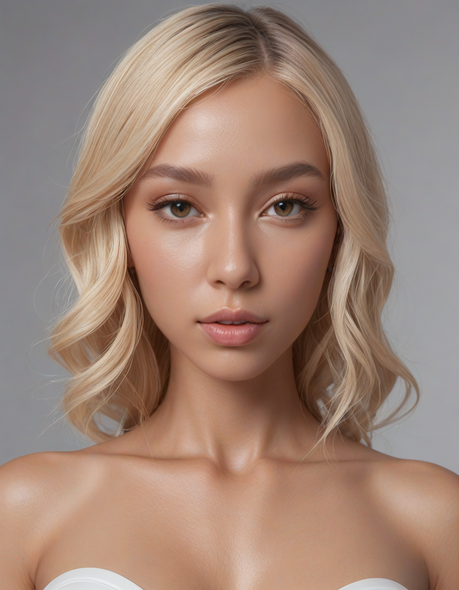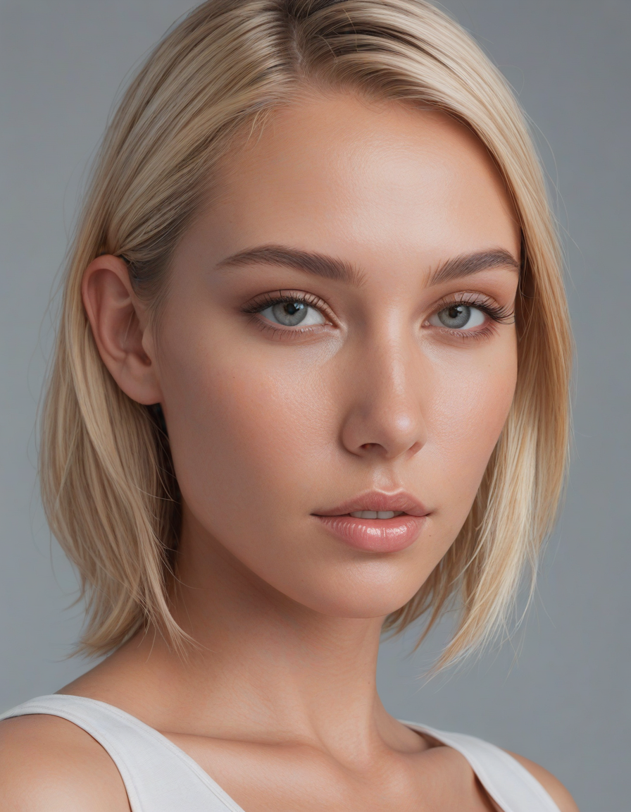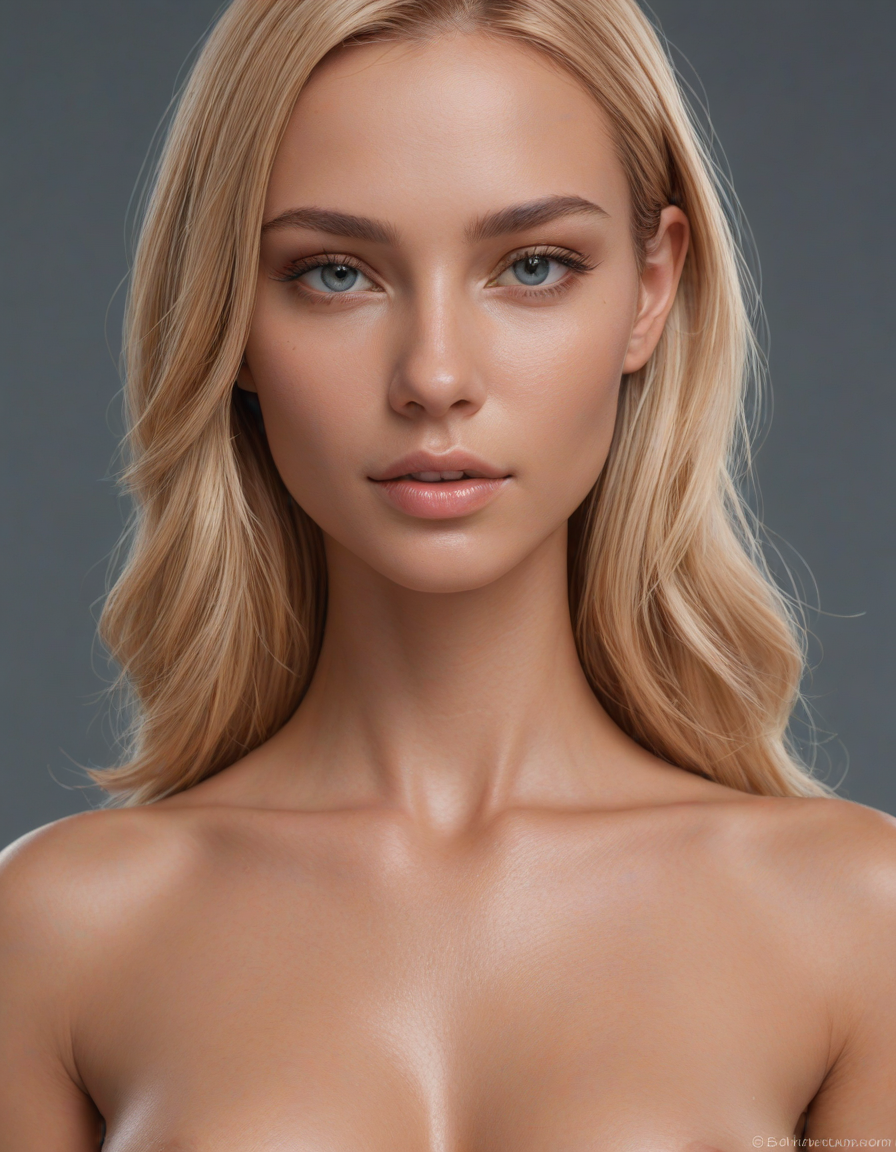 (ab lines:1.5),raytracing,Oiled skin,Glistening skin,Oiled skin,reflective skin,Glossy skin,metal skin,metallic luster,Oiled clothes,skin tight,covered nipples,covered nave, oval face shape, almond-shaped eyes, voluminous lashes, slightly arched eyebrows, narrow nasal bridge, rounded nose tip, symmetrical nostrils, full lips, pronounced cupid's bow, slightly fuller lower lip, defined cheekbones, rounded chin, smooth complexion, softly contoured jawline, balanced facial proportions, symmetrical features, gently curved eyelids, soft brow ridge, harmonious cheek to jawline transition, subtle philtrum, delicate ear lobes, straight blonde hair, clear skin, hooded eyelids, light pink lip color, slightly pouty expression, casual pose with hand on face, slight head tilt, indoor lighting, Light blue irises, Medium-thickness eyebrows, Softly angled eyebrows, A hint of freckles across the nose and cheeks, Natural makeup, Gentle frown lines between the eyebrows, Soft nasolabial folds, Smooth forehead, Subtle dimple on the chin, Clear facial contour without distinct shadows, Even skin tone with a hint of natural pink undertones, Slightly rosy cheeks, Tapered jawline, Fine hair texture with gentle waves, Youthful appearance with soft facial features