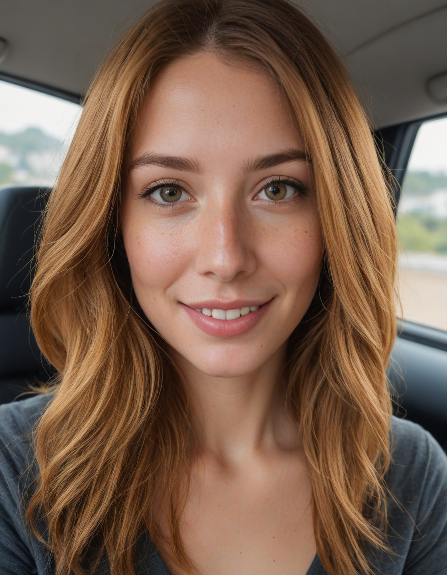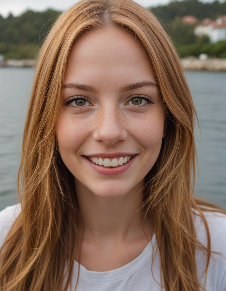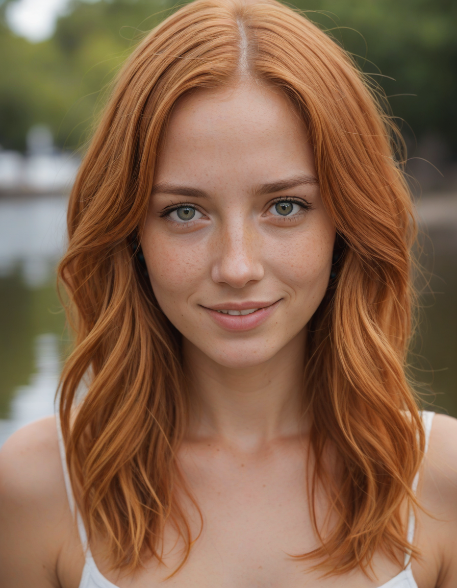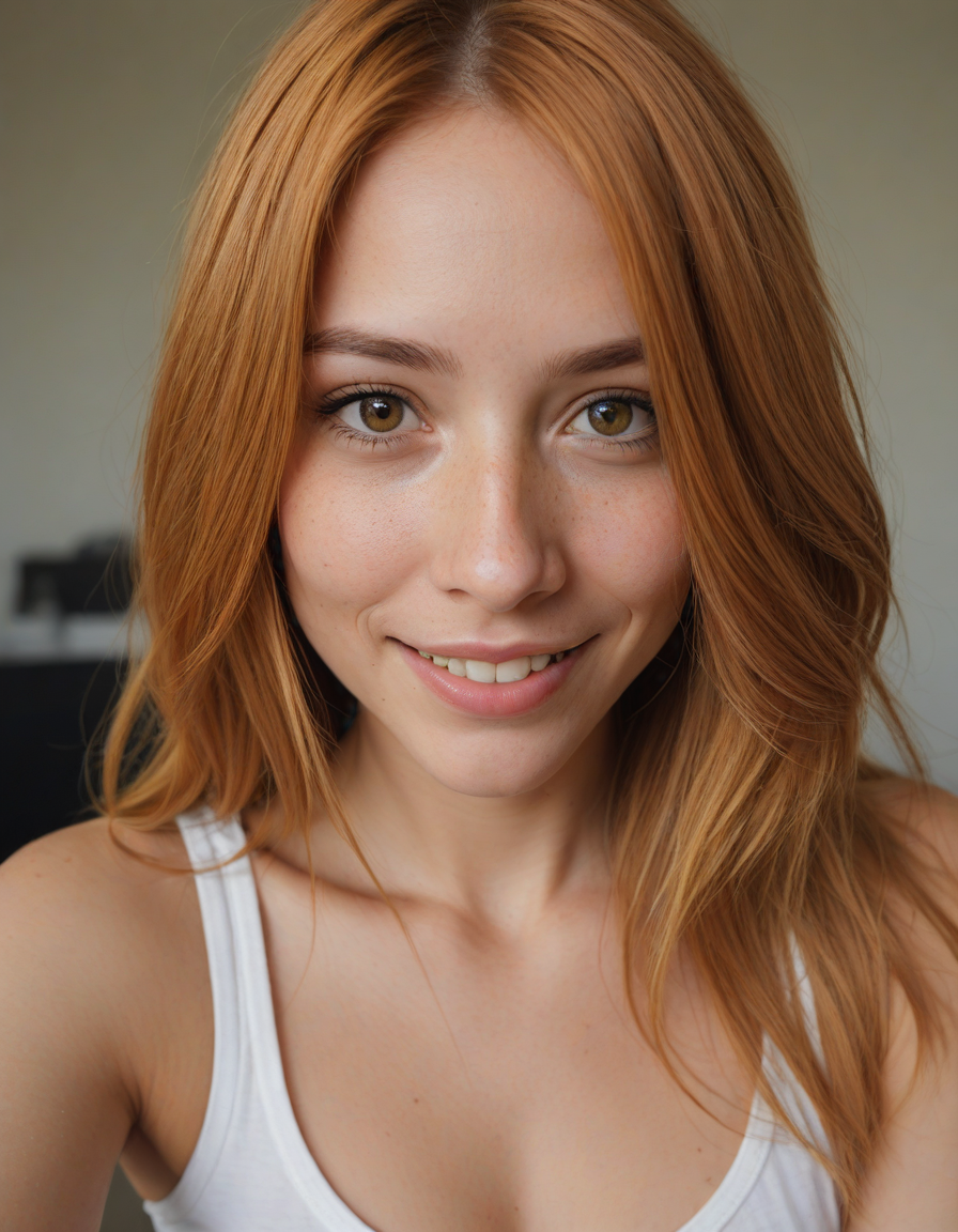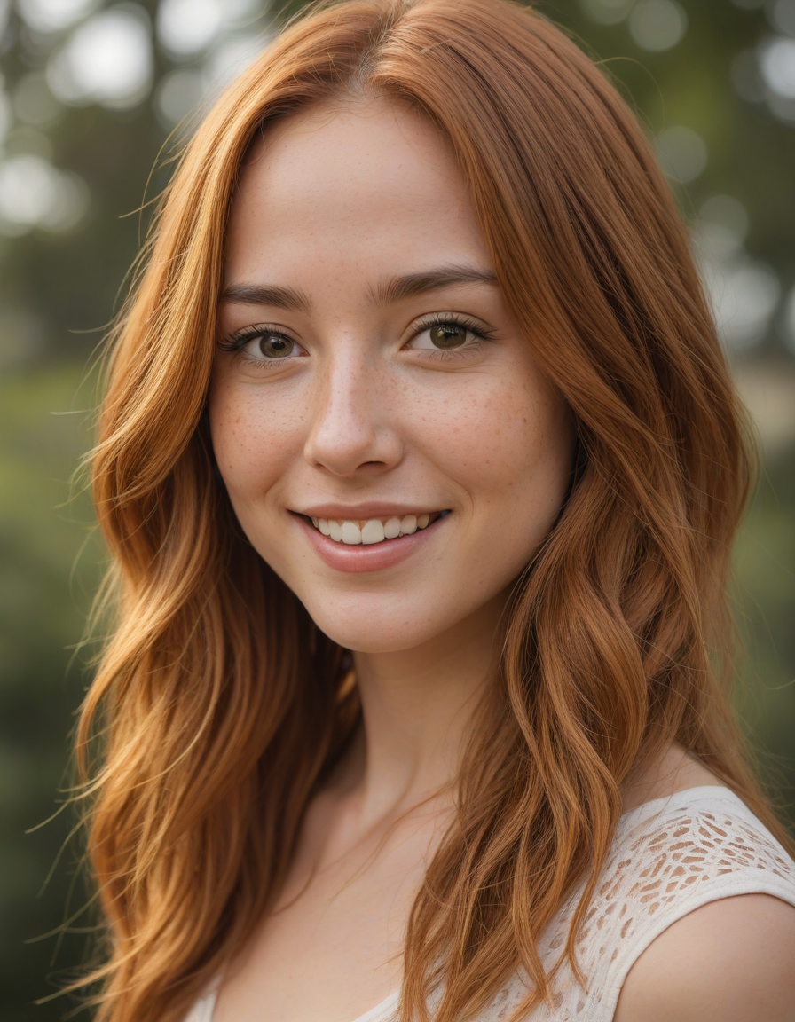 smiling faces, Sofia from Australia, medium shoulder-length ginger parted in the side with blond streaks, brown eyes, curved nose, thick lips, dimples, perfect teeth, teasing look, freckles, Intense contrast of, coy, fisheye lens, Look of pride
