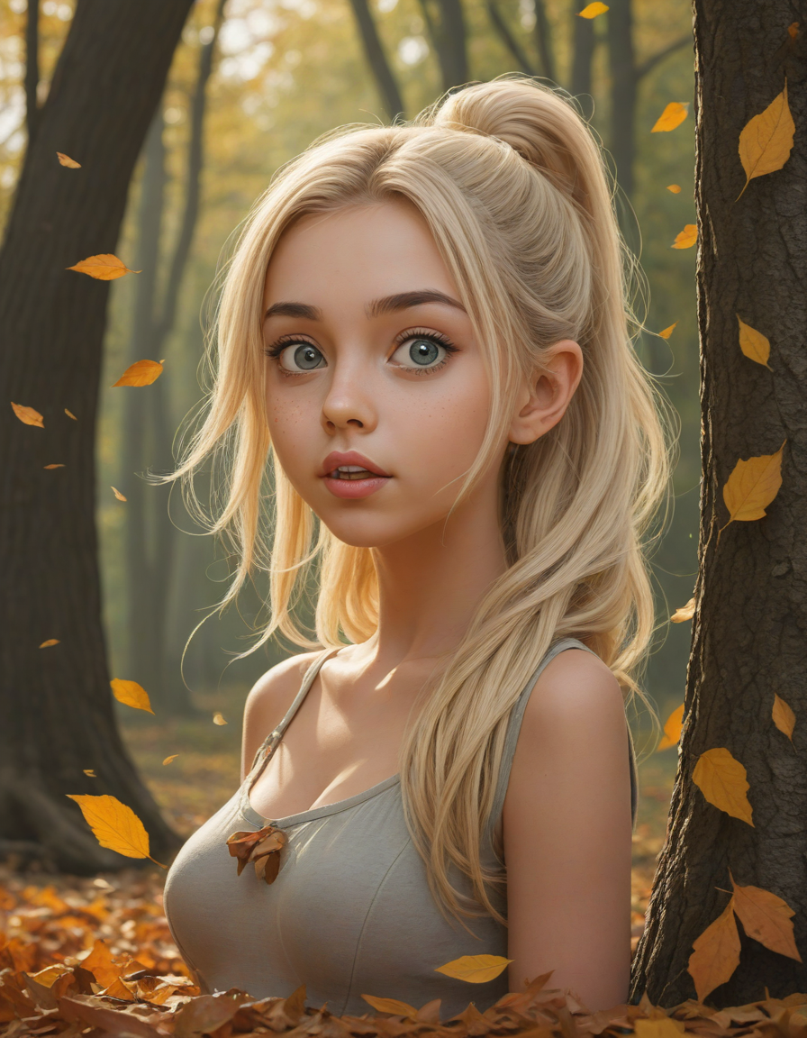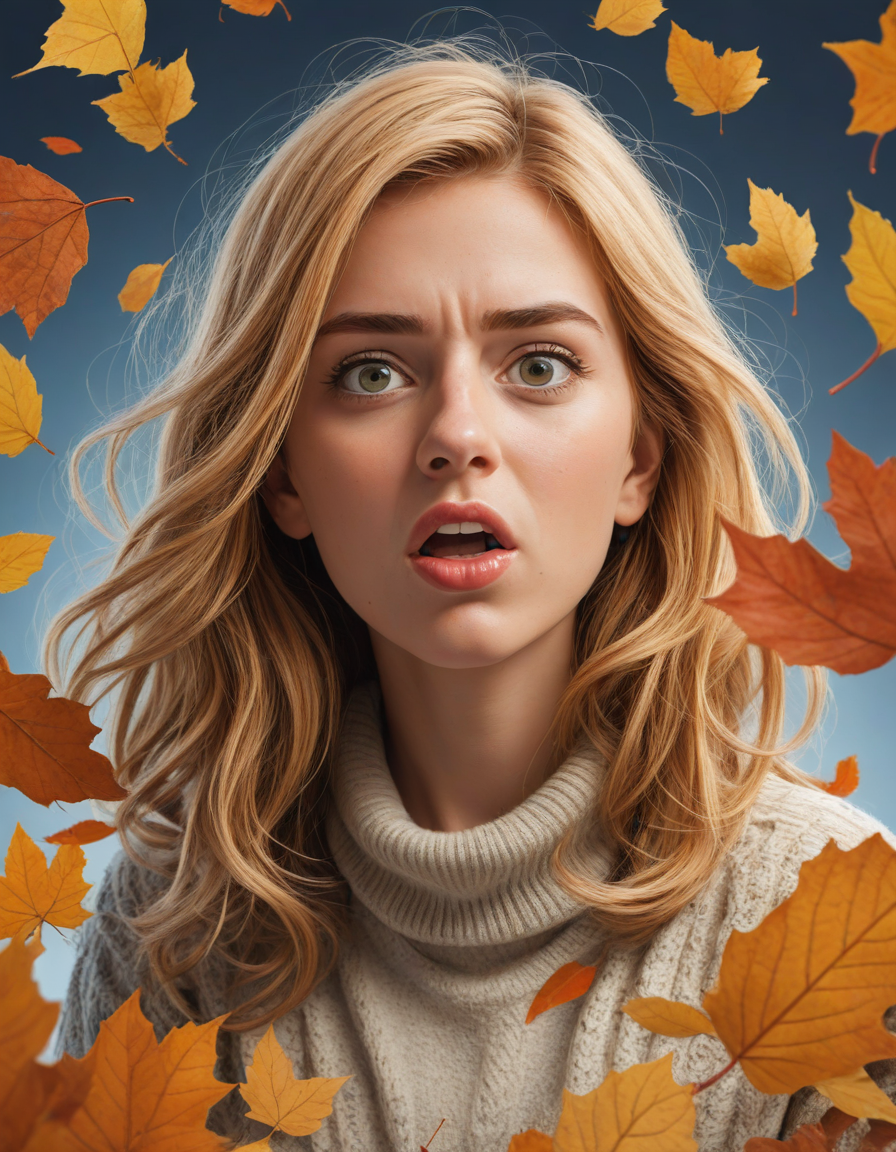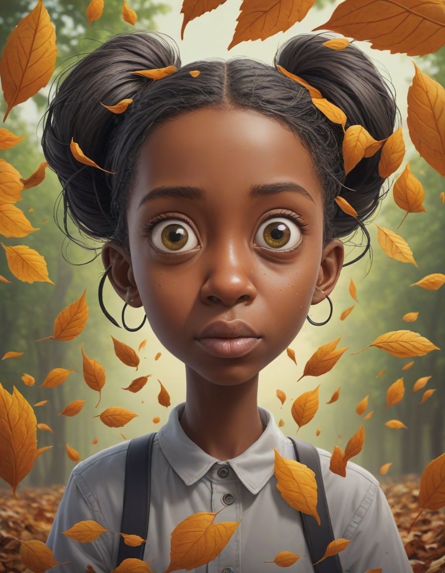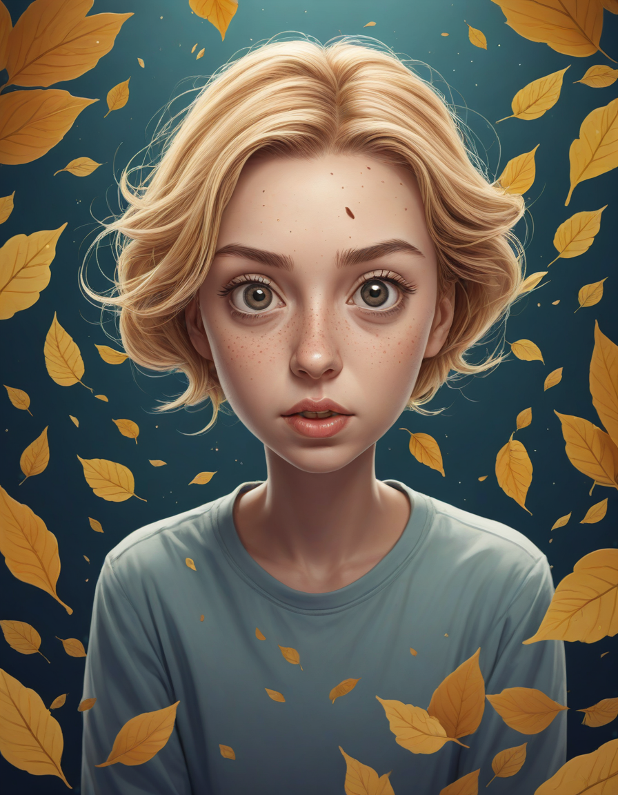 A humorous cartoon character with an exaggerated expression, falling leaves, huge anime eyes