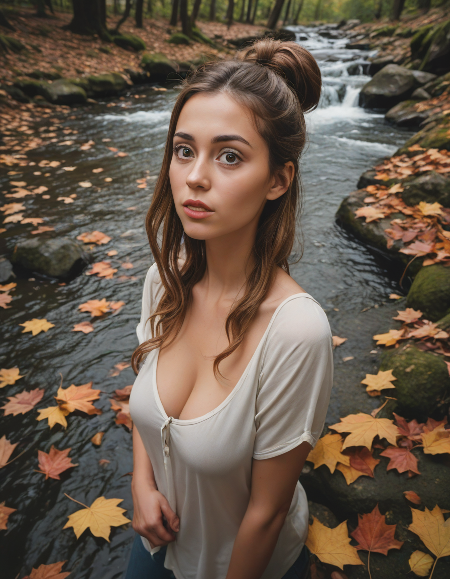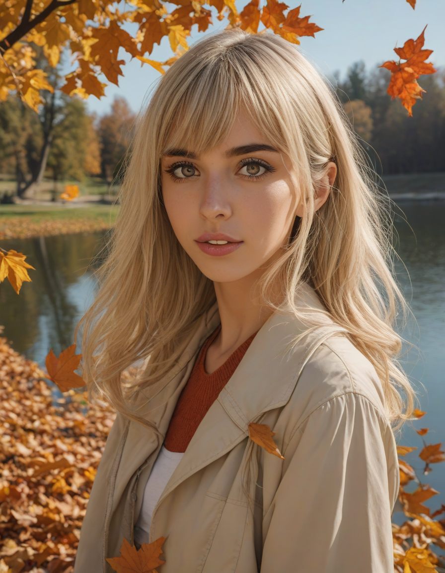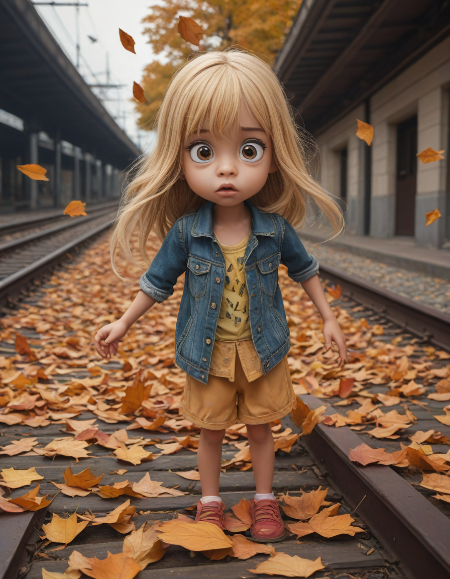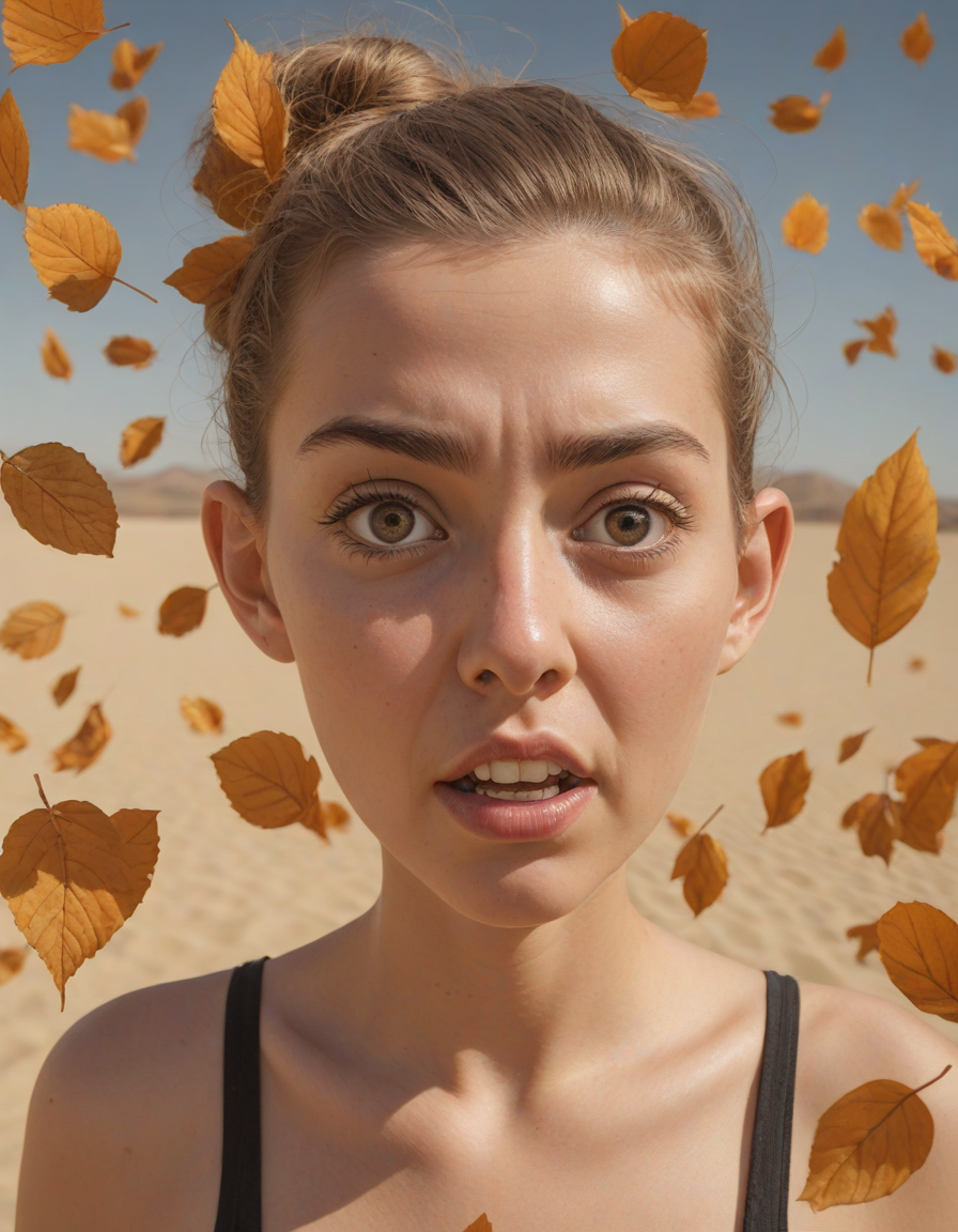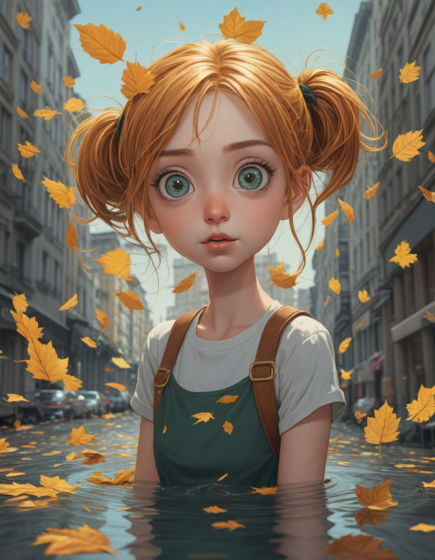 A humorous cartoon character with an exaggerated expression, falling leaves, huge anime eyes