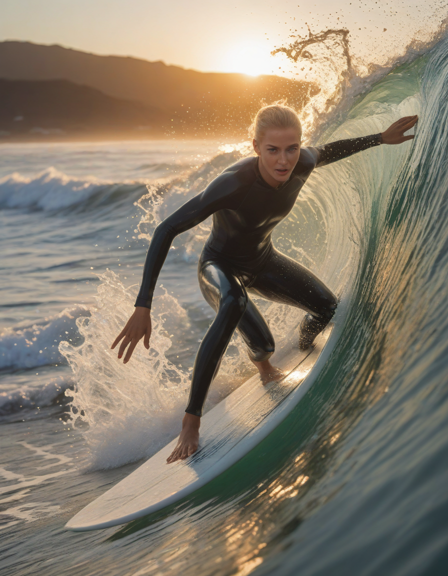 Surfer catching wave in beach sunset, Mascara running down, sparkling eyes glistening, mighty sorcerer, scenic mesa, Pointy