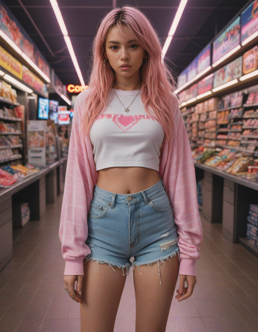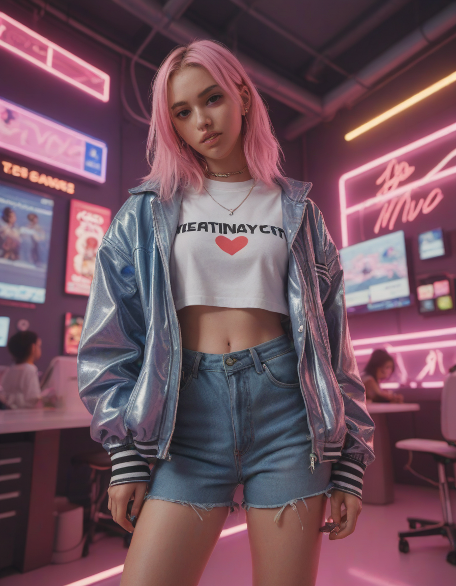 Her makeup is a canvas of e-girl artistry, with dramatic winged eyeliner that stretches towards her temples in a bold statement, eyeshadow in neon hues that electrify her gaze, and dark, matte lipstick that draws all eyes to her. A generous application of blush adds life and vibrancy to her cheeks, complemented by creatively designed nails that are both dark and daring. Accessories—silver chains, a heart pendant choker, and a collection of rings—add layers of personality and depth. Her hair, possibly featuring pastel or neon streaks, is styled in a way that balances edge with elegance, with temporary tattoos or stickers adorning her face to accentuate her playful rebellion.