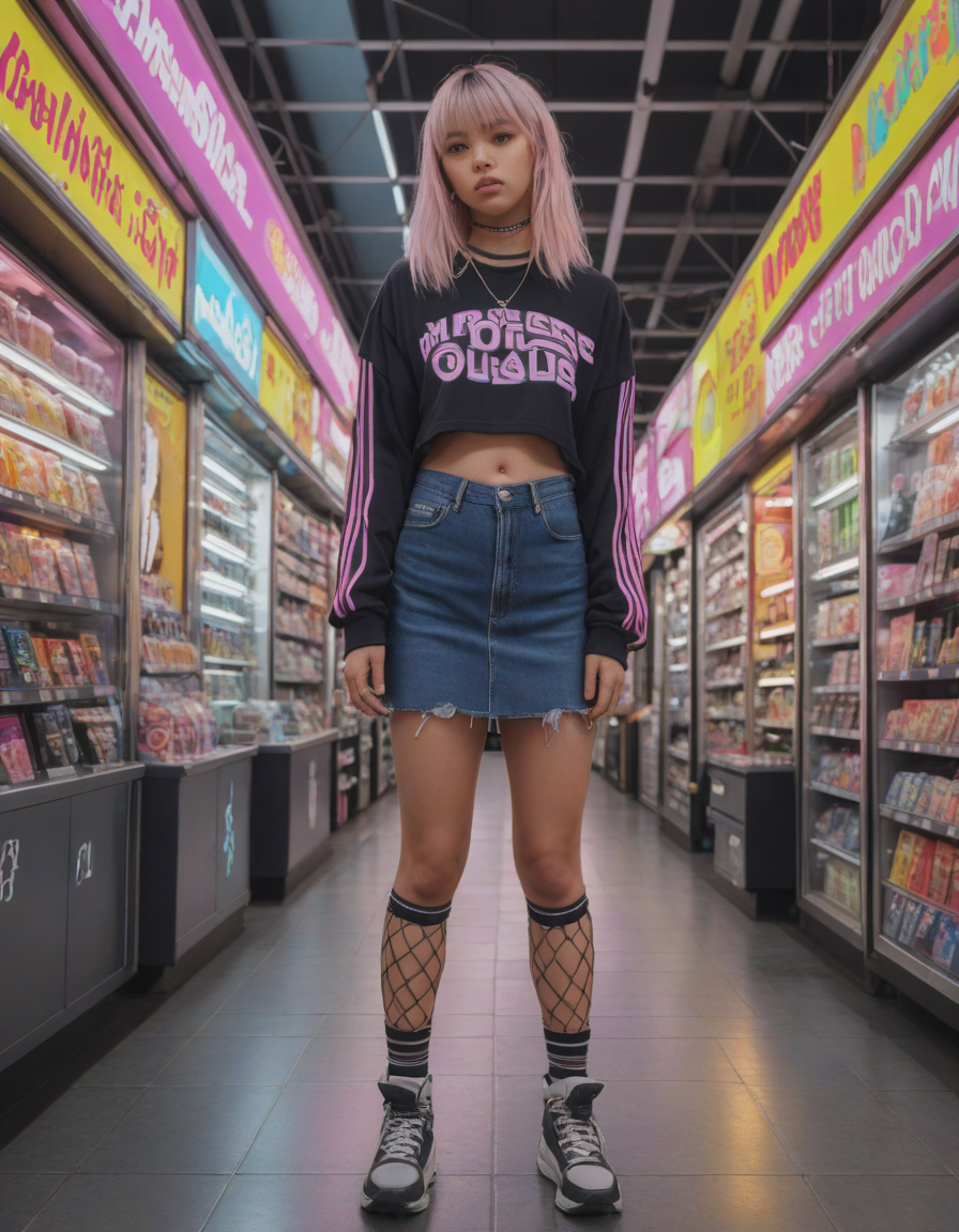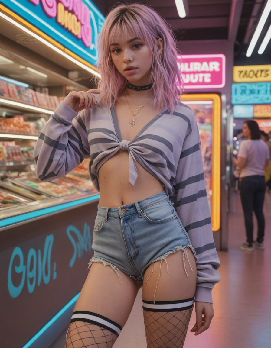 This visualization retains the essence of our previous description, now enhanced by a pose that speaks volumes of her confidence and the vibrant spirit of the e-girl aesthetic. It captures not just the photorealistic image of a young woman in the throes of digital age culture but also the bold statement of identity and self-expression that defines her at this significant moment in her life., Wielding a one-handed weapon in both hands, one-handed weapon, weapon, , Visualize a photorealistic portrayal of an 18-year-old high school senior girl, epitomizing the e-girl aesthetic with a blend of internet culture's vibrancy and personal audacity. Clad in an oversized striped shirt under a black graphic t-shirt dress, her style is a testament to e-girl fashion's layered intricacy, complemented by fishnet tights and chunky boots. Her makeup features dramatic winged eyeliner, neon eyeshadow, and dark lipstick, with blush bringing her face to life. Accessories like silver chains and a heart pendant choker, along with pastel or neon hair streaks, enhance her playful rebellion. Standing hands-on-hips, she exudes confidence and individuality against a backdrop suggestive of e-girl life, with neon signs and string lights. This scene captures her bold identity and expressive spirit at this pivotal moment.
