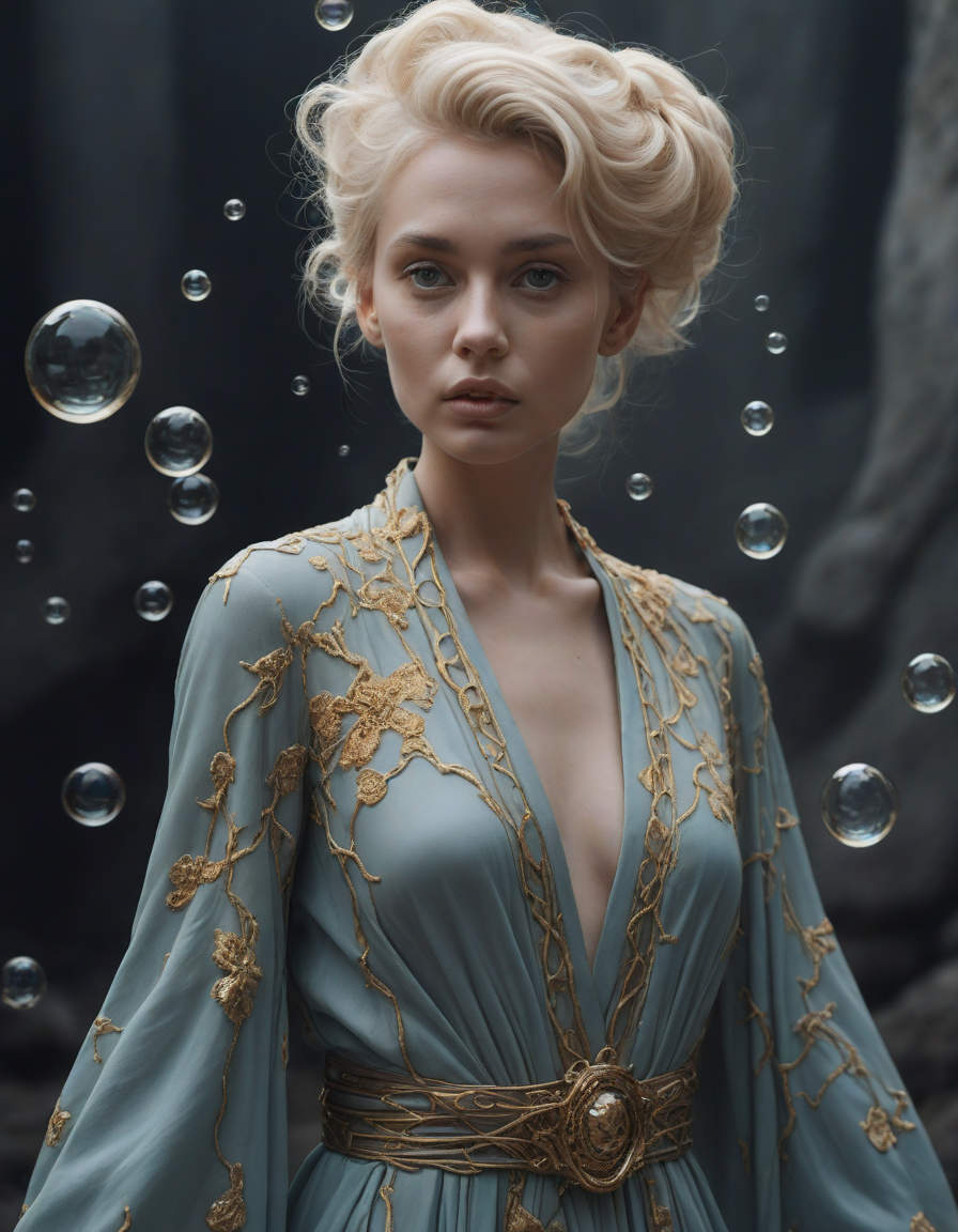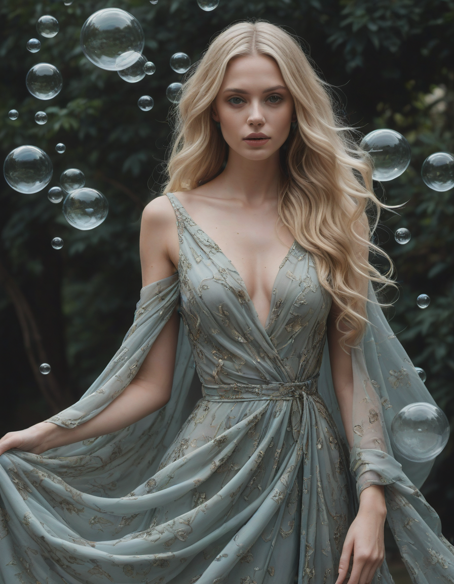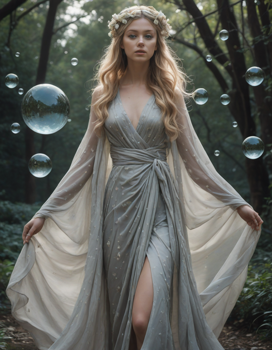 bubbles popping, Tron-like, florals in spring, motion, spooky ghosts, elegantly draped rich crinkled robes swirling gracefully, in an absurd outfit