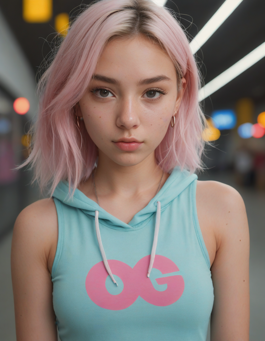 Her makeup is a canvas of e-girl artistry, with dramatic winged eyeliner that stretches towards her temples in a bold statement, eyeshadow in neon hues that electrify her gaze, and dark, matte lipstick that draws all eyes to her. A generous application of blush adds life and vibrancy to her cheeks, complemented by creatively designed nails that are both dark and daring. Accessories—silver chains, a heart pendant choker, and a collection of rings—add layers of personality and depth. Her hair, possibly featuring pastel or neon streaks, is styled in a way that balances edge with elegance, with temporary tattoos or stickers adorning her face to accentuate her playful rebellion.