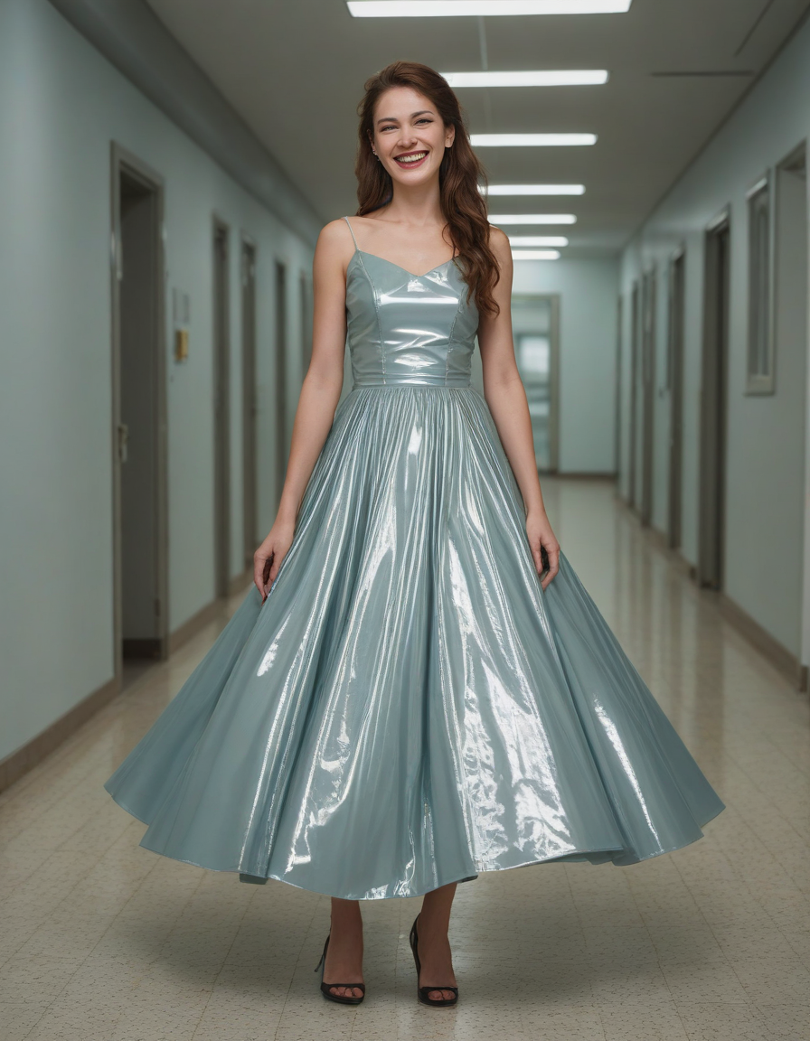 laughing, Wide Skirt, wide ballgown hem, a line skirt, petticoat skirt, , shiny, glossy PVC outfit, (shiny glossy PVC cloth textures), clothes made from pvc, plastic, tall woman