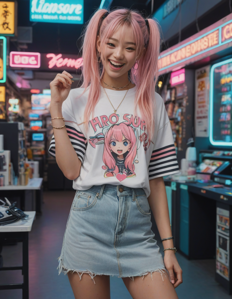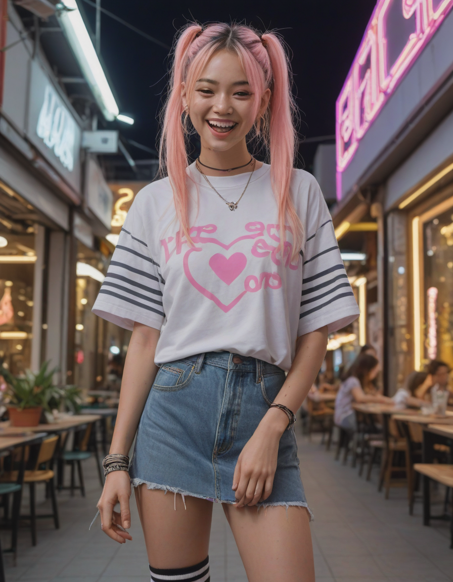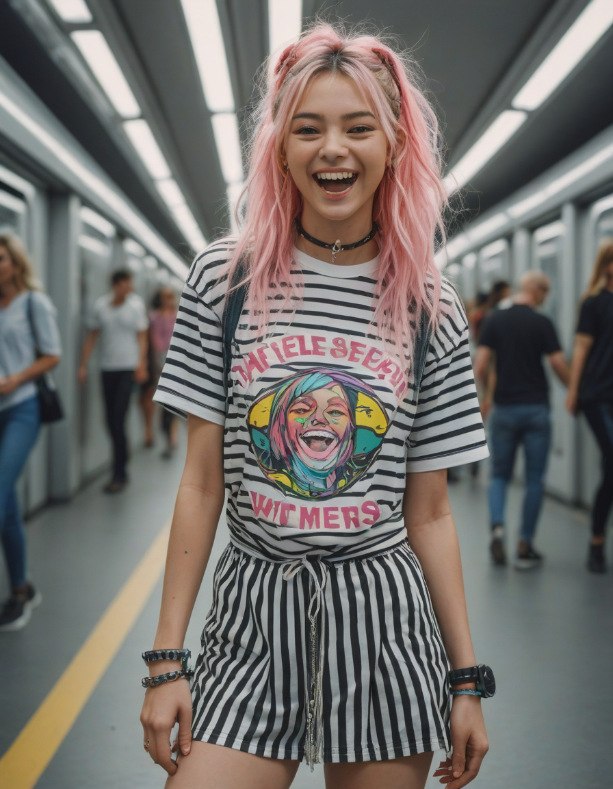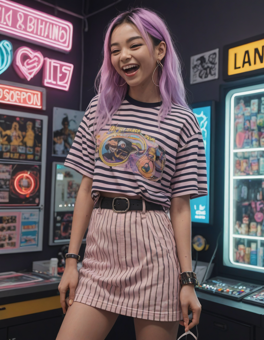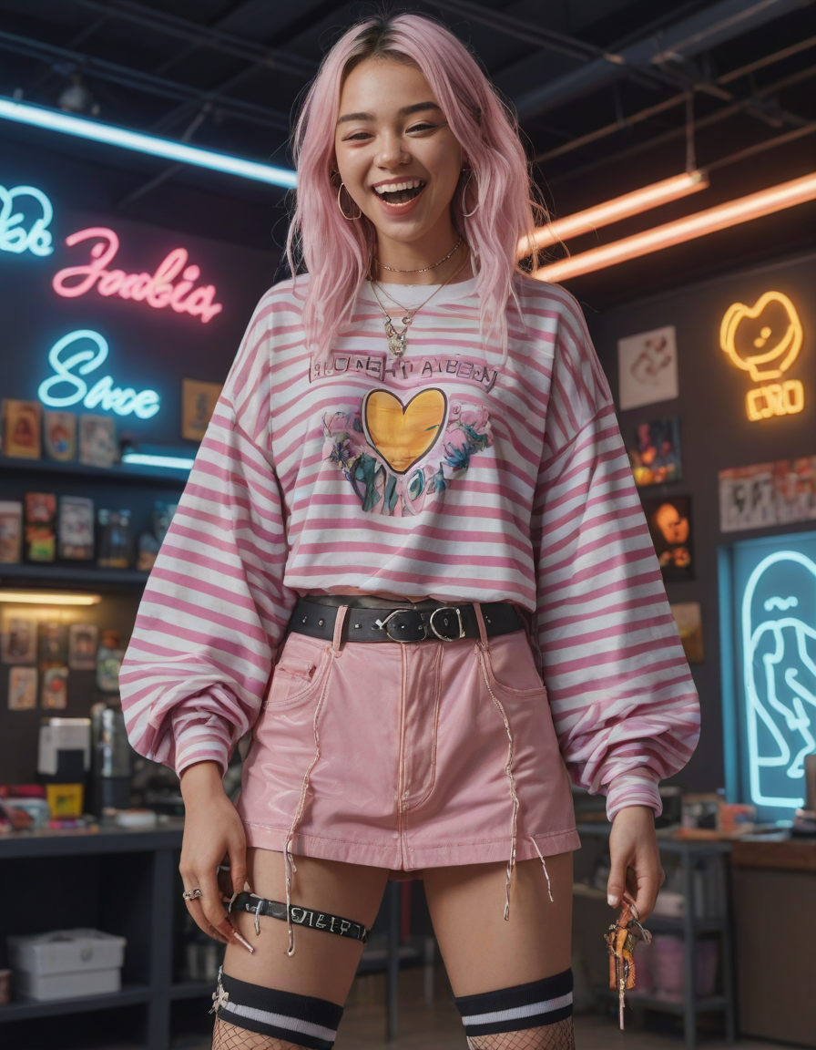laughing, Wielding a one-handed weapon in both hands, one-handed weapon, weapon, , Visualize a photorealistic portrayal of an 18-year-old high school senior girl, epitomizing the e-girl aesthetic with a blend of internet culture's vibrancy and personal audacity. Clad in an oversized striped shirt under a black graphic t-shirt dress, her style is a testament to e-girl fashion's layered intricacy, complemented by fishnet tights and chunky boots. Her makeup features dramatic winged eyeliner, neon eyeshadow, and dark lipstick, with blush bringing her face to life. Accessories like silver chains and a heart pendant choker, along with pastel or neon hair streaks, enhance her playful rebellion. Standing hands-on-hips, she exudes confidence and individuality against a backdrop suggestive of e-girl life, with neon signs and string lights. This scene captures her bold identity and expressive spirit at this pivotal moment.