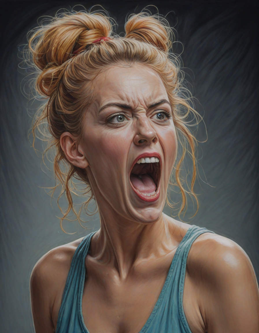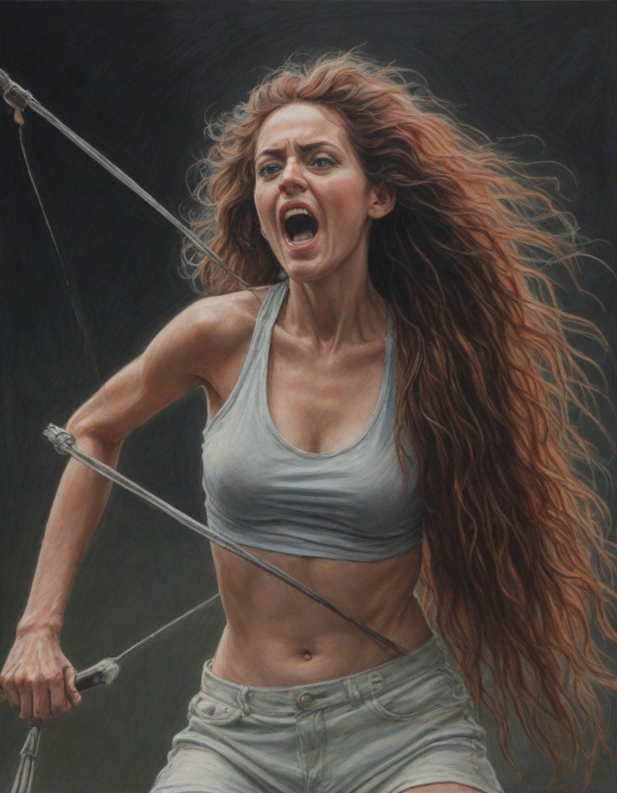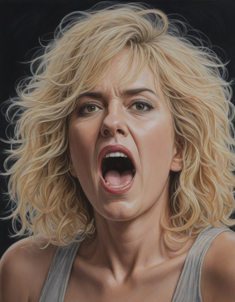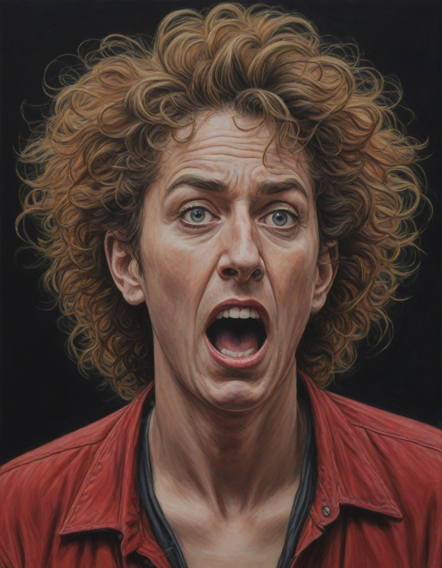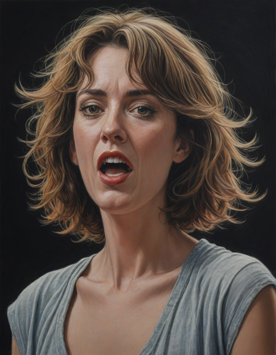 Hair-raising screech echoing, oil pastel portrait, on stage