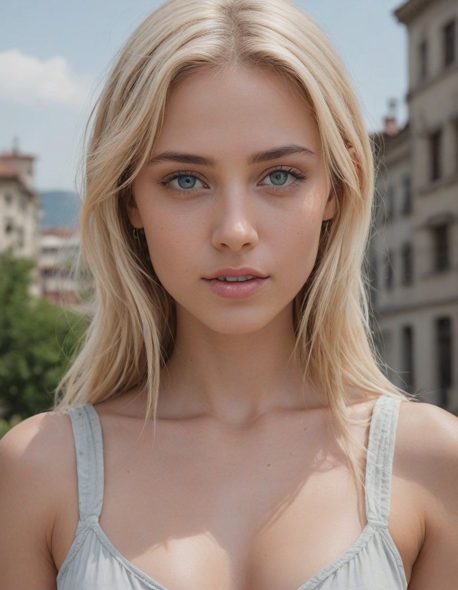 creepy smile, weilding a one-handed weapon in both hands, one-handed weapon, weapon, , oval face shape, almond-shaped eyes, voluminous lashes, slightly arched eyebrows, narrow nasal bridge, rounded nose tip, symmetrical nostrils, full lips, pronounced cupid's bow, slightly fuller lower lip, defined cheekbones, rounded chin, smooth complexion, softly contoured jawline, balanced facial proportions, symmetrical features, gently curved eyelids, soft brow ridge, harmonious cheek to jawline transition, subtle philtrum, delicate ear lobes, straight blonde hair, clear skin, hooded eyelids, light pink lip color, slightly pouty expression, casual pose with hand on face, slight head tilt, indoor lighting, Light blue irises, Medium-thickness eyebrows, Softly angled eyebrows, A hint of freckles across the nose and cheeks, Natural makeup, Gentle frown lines between the eyebrows, Soft nasolabial folds, Smooth forehead, Subtle dimple on the chin, Clear facial contour without distinct shadows, Even skin tone with a hint of natural pink undertones, Slightly rosy cheeks, Tapered jawline, Fine hair texture with gentle waves, Youthful appearance with soft facial features, in a suit, magical, enchanted, macro close-up shot, appalled, Ethereal, evanescent, otherworldly, fake round large breasts, round breasts, perky breasts, very perky, silicon-enhanced breasts, artificial breasts, flawless breasts, enhanced bust, silicon implant styled breasts,, bubbles popping, enjoying a scenic view, lost in thought, face tattoo, final boss