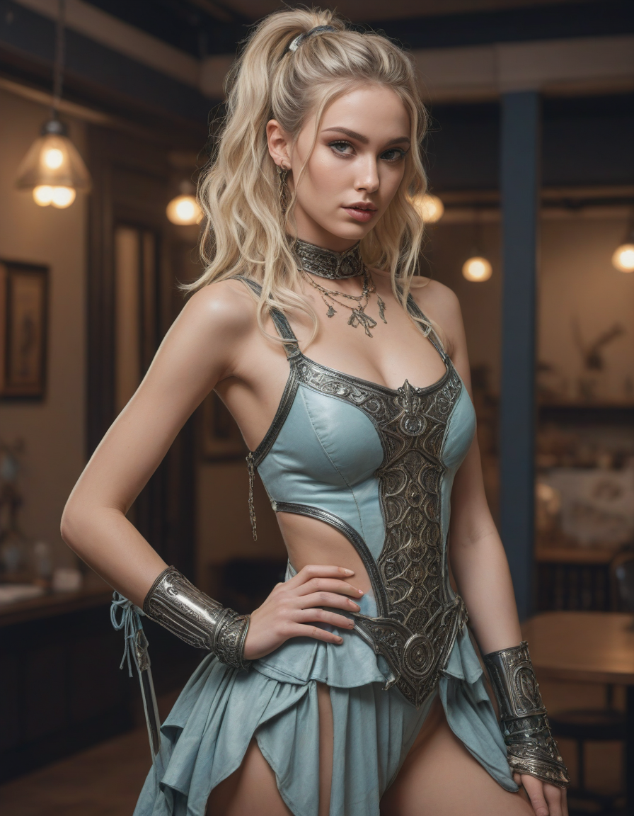 This visualization retains the essence of our previous description, now enhanced by a pose that speaks volumes of her confidence and the vibrant spirit of the e-girl aesthetic. It captures not just the photorealistic image of a young woman in the throes of digital age culture but also the bold statement of identity and self-expression that defines her at this significant moment in her life., Wielding a one-handed weapon in both hands, one-handed weapon, weapon, , oval face shape, almond-shaped eyes, voluminous lashes, slightly arched eyebrows, narrow nasal bridge, rounded nose tip, symmetrical nostrils, full lips, pronounced cupid's bow, slightly fuller lower lip, defined cheekbones, rounded chin, smooth complexion, softly contoured jawline, balanced facial proportions, symmetrical features, gently curved eyelids, soft brow ridge, harmonious cheek to jawline transition, subtle philtrum, delicate ear lobes, straight blonde hair, clear skin, hooded eyelids, light pink lip color, slightly pouty expression, casual pose with hand on face, slight head tilt, indoor lighting, Light blue irises, Medium-thickness eyebrows, Softly angled eyebrows, A hint of freckles across the nose and cheeks, Natural makeup, Gentle frown lines between the eyebrows, Soft nasolabial folds, Smooth forehead, Subtle dimple on the chin, Clear facial contour without distinct shadows, Even skin tone with a hint of natural pink undertones, Slightly rosy cheeks, Tapered jawline, Fine hair texture with gentle waves, Youthful appearance with soft facial features, Holding a sword in both hands in a confident pose, detailed grip, detailed fuller, detailed pommel, detailed blade, detailed edge, , wearing complete set of armor, wearing full armor, Wearing chest armor, wearing leg armor, wearing feet armor, wearing bracer, wearing pauldrons, Wearing helmet, Wearing breastplate, Wearing gauntlets, Wearing greaves, Wearing pauldrons, Wearing vambraces, Wearing cuisses, Wearing sabatons, Wearing gorget, Wearing tassets, Wearing bracers, Wearing cuirass, Wearing faulds, Wearing plackart, Wearing spaulders, Wearing besagews