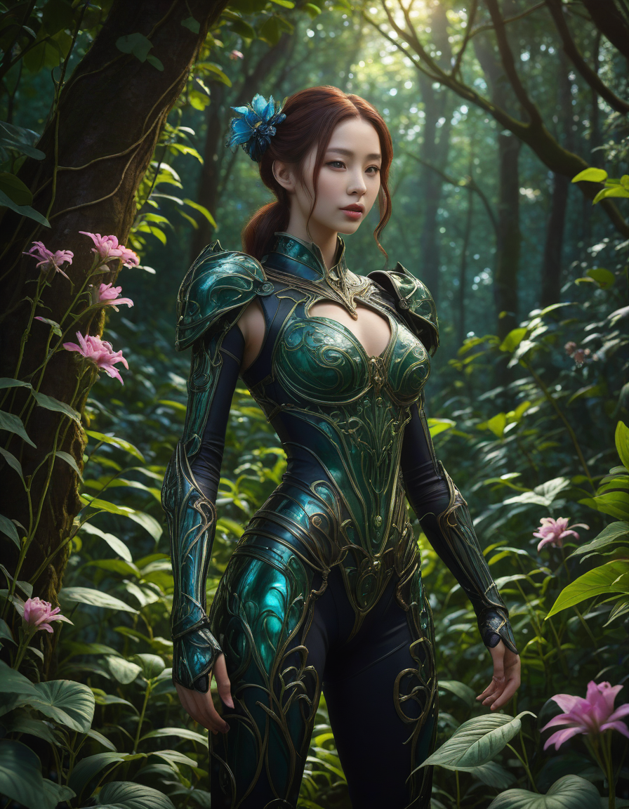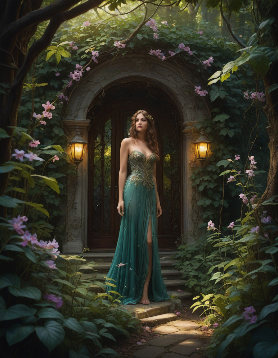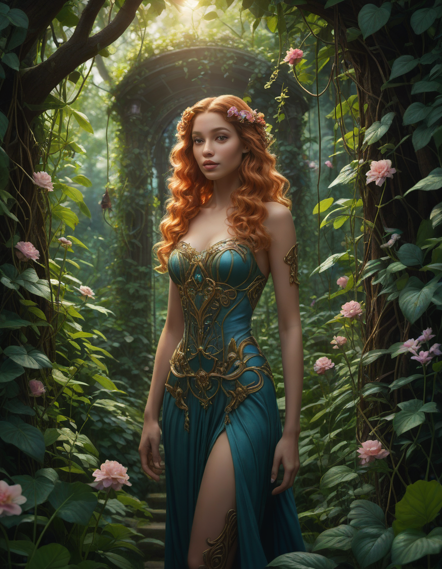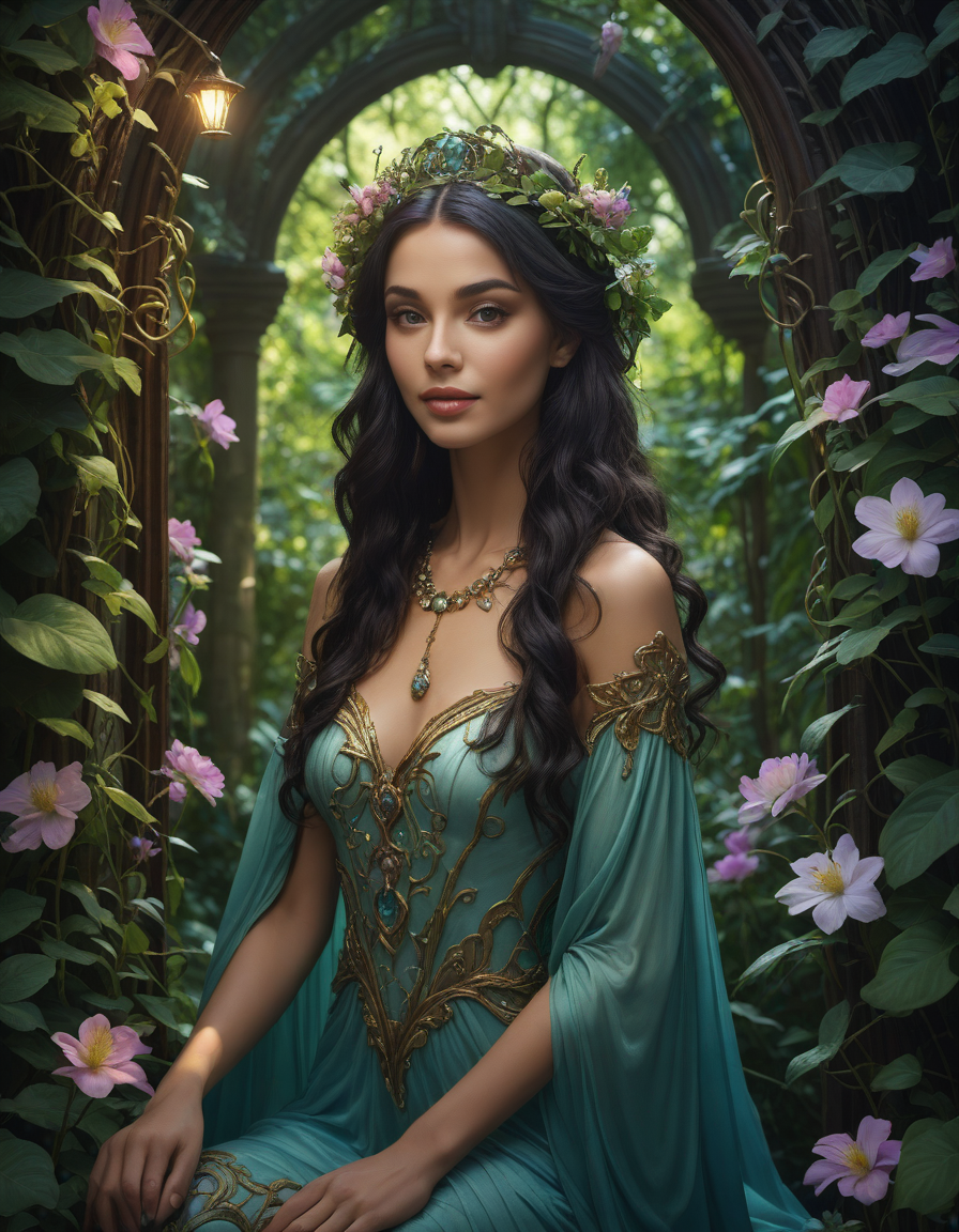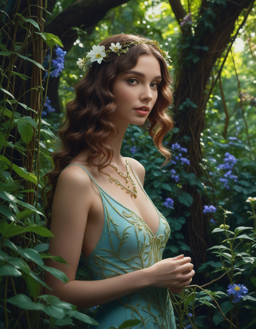 lush garden setting with flowers and vines, art nouveau style, magical fantasy forest, bioluminescent plants, ethereal atmosphere, curious, engaged, eager expression, dramatic cinematic lighting, high contrast shadows and highlights