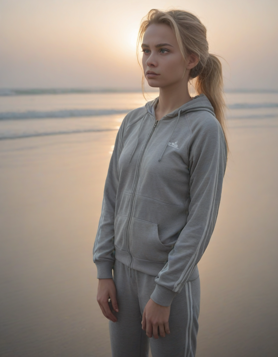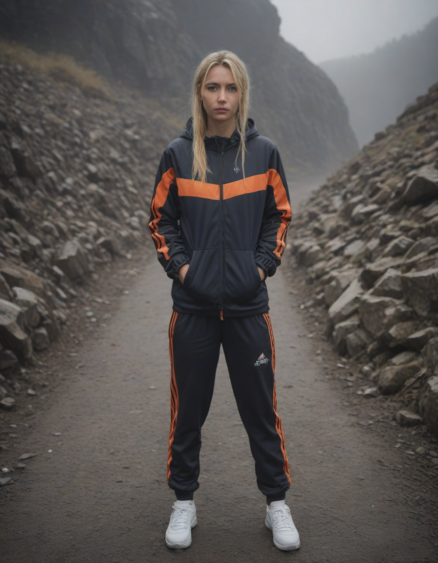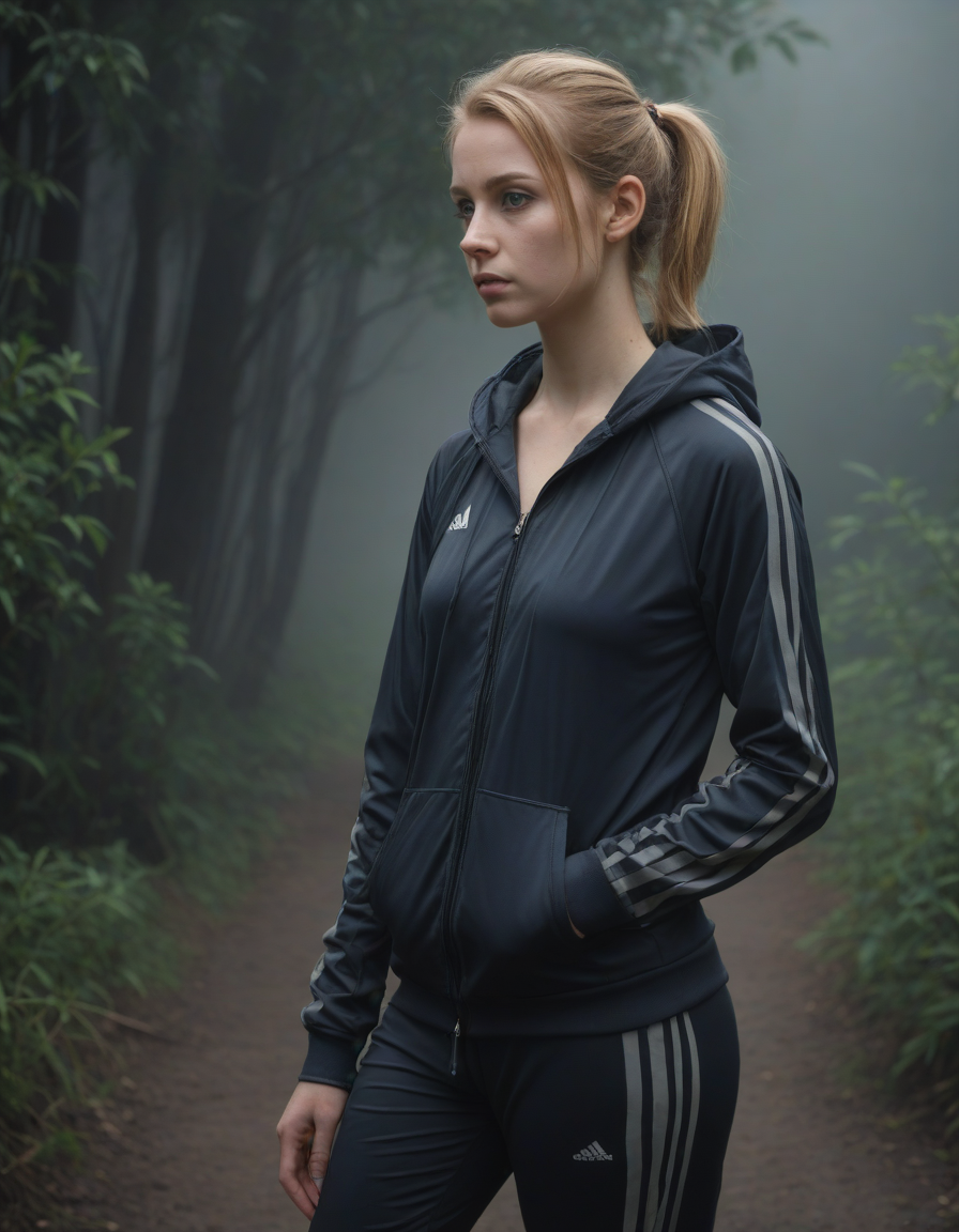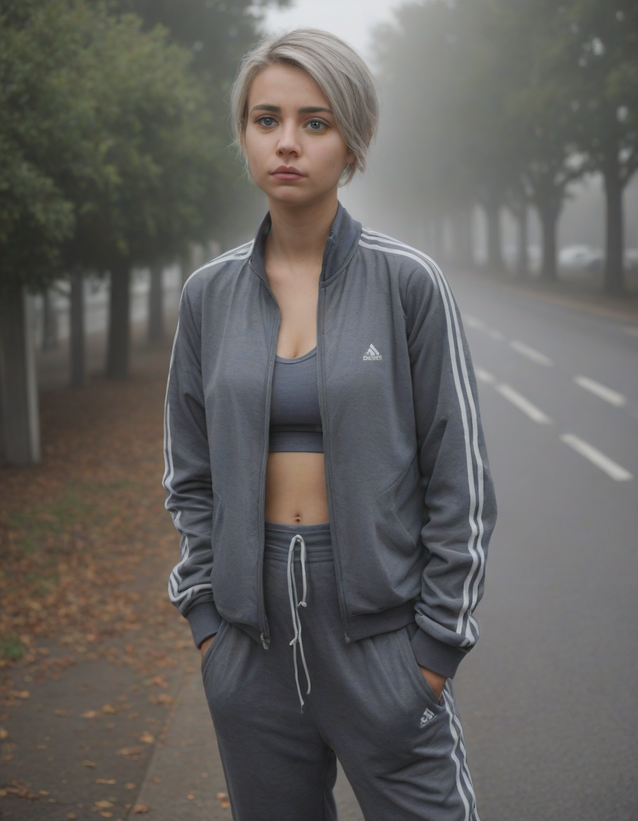 waiting in the mist, quizzical expression, in a track suit