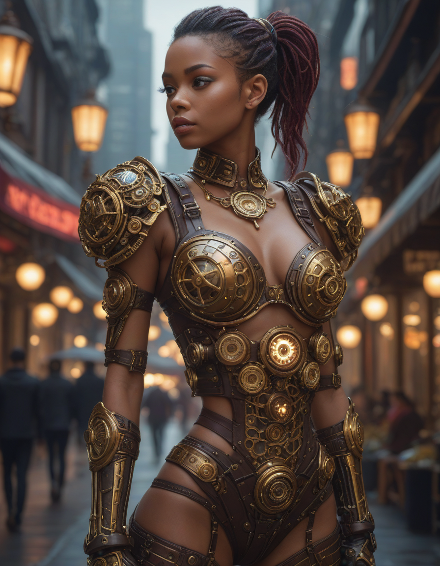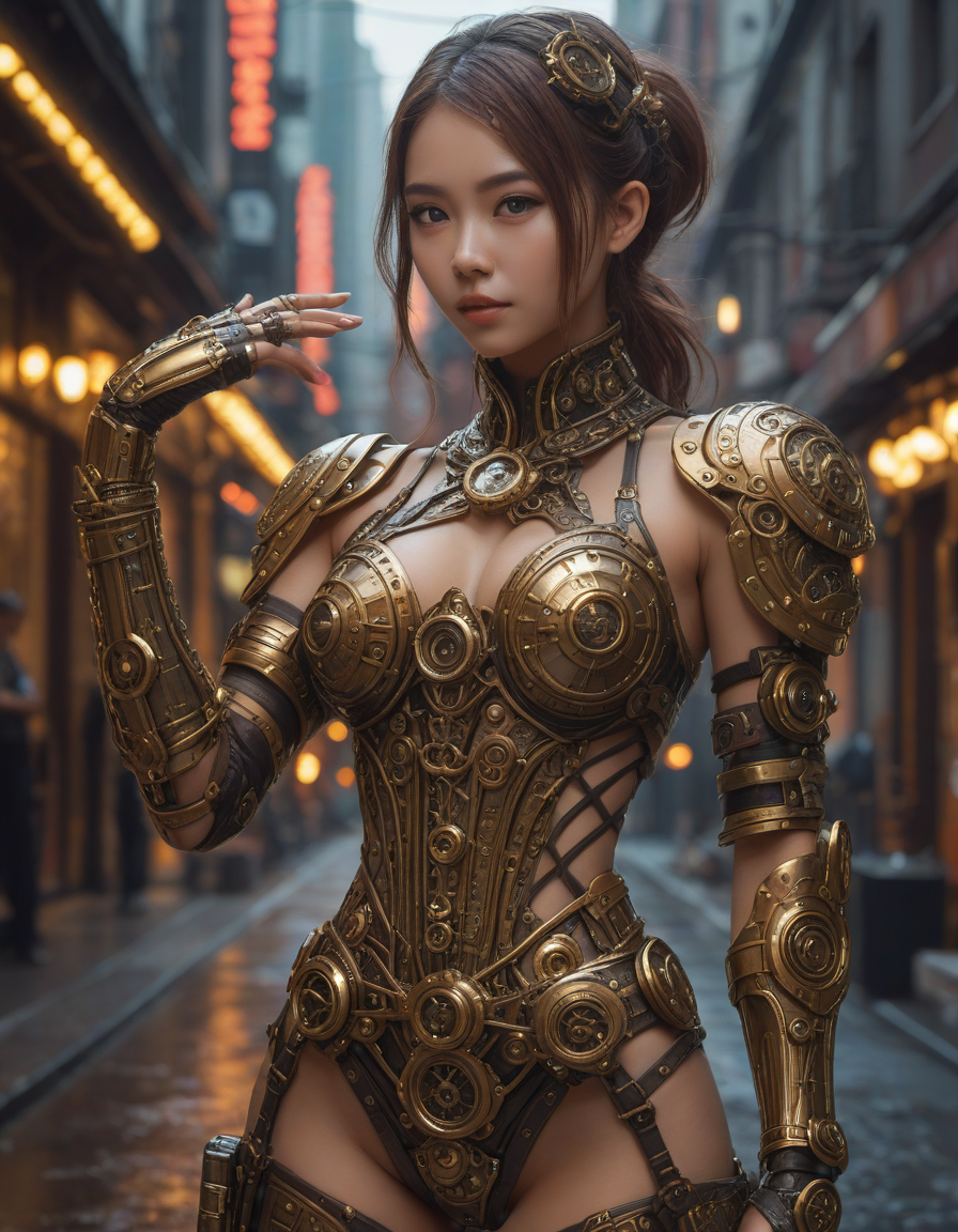 intricate steampunk accessories, gears and brass, (ab lines:1.5),raytracing,Oiled skin,Glistening skin,Oiled skin,reflective skin,Glossy skin,metal skin,metallic luster,Oiled clothes,skin tight,covered nipples,covered nave, highly stylized, artistic, vibrant, colorful, cyberpunk, neon lights, futuristic cityscape, cute, adorable, highly detailed steampunk armor with intricate gears and mechanisms
