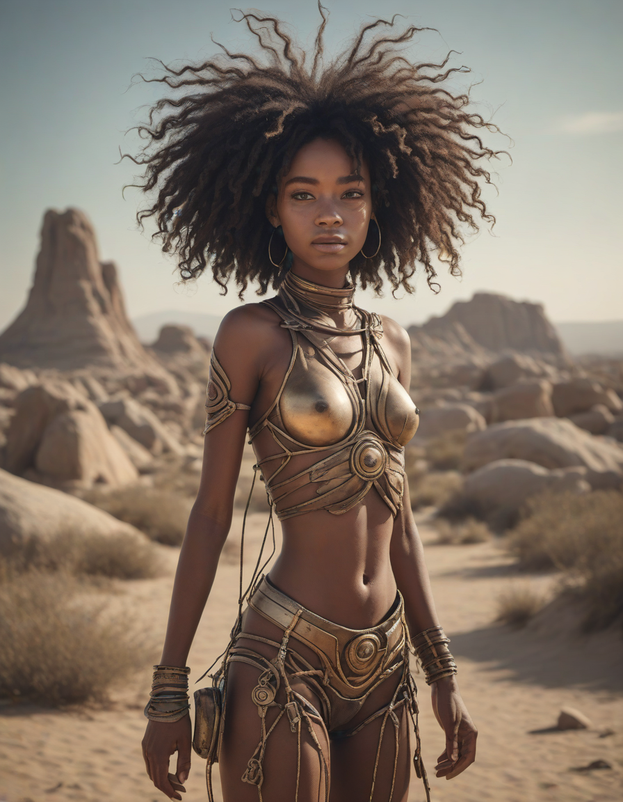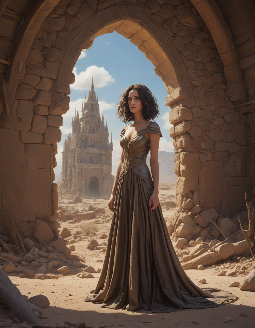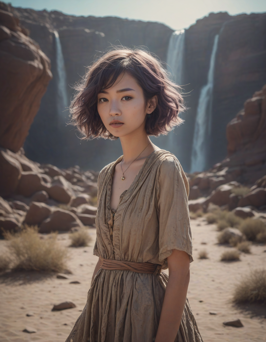 pixar-style, apocalyptic, in the desert, super zoom lens, An divine, storm-birthed instrument of destruction, whimsical fairytale, bell haircut, super hero, a mysterious hologram