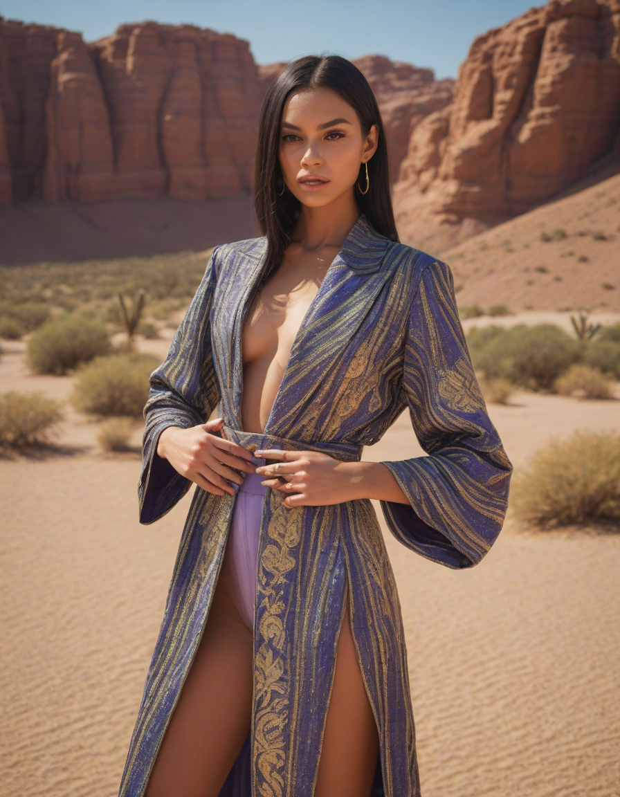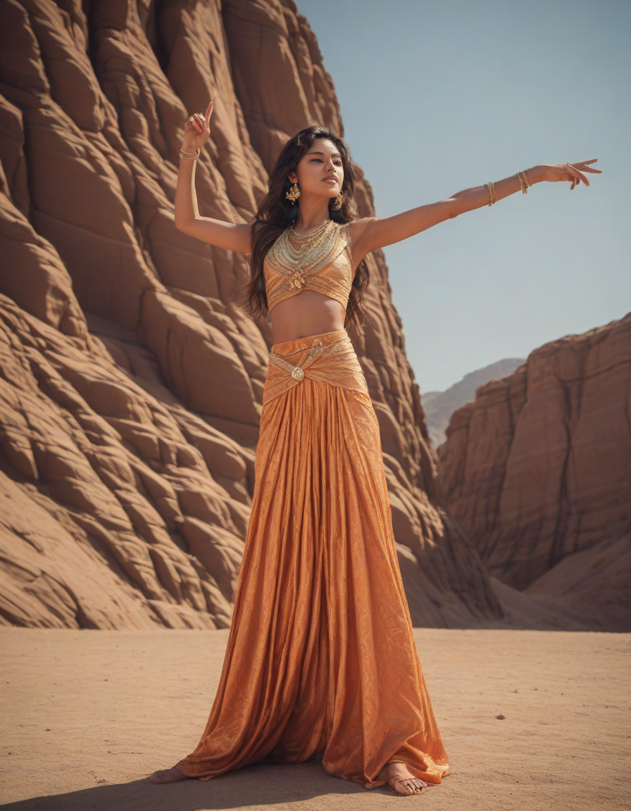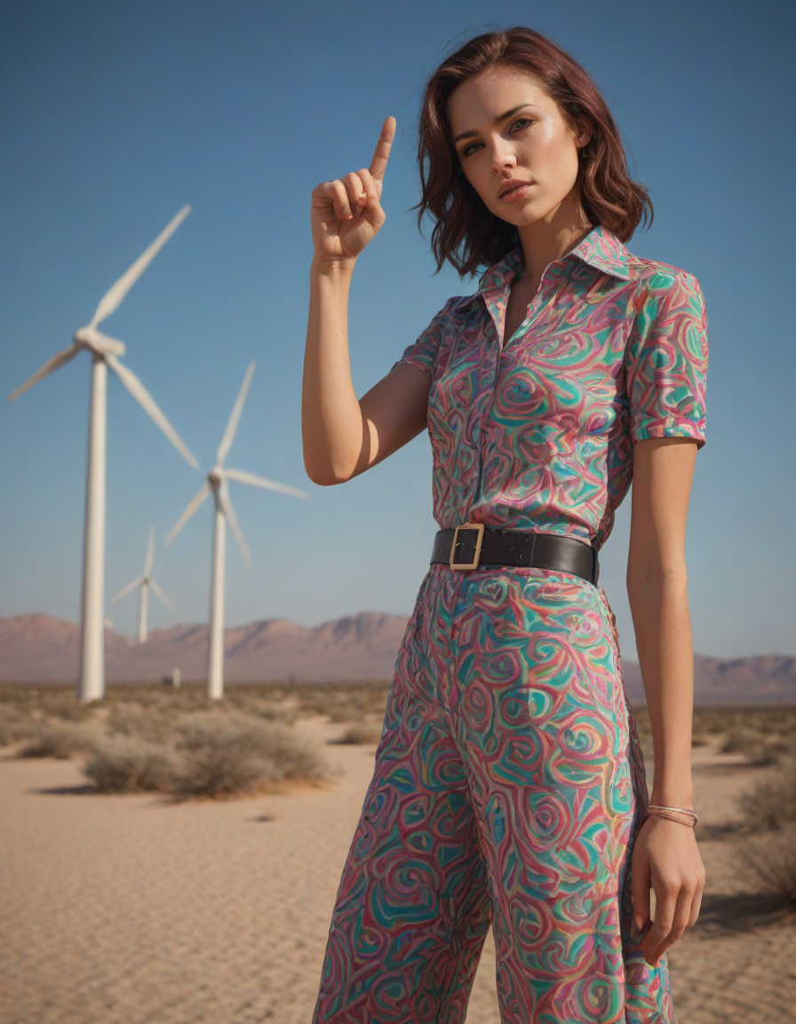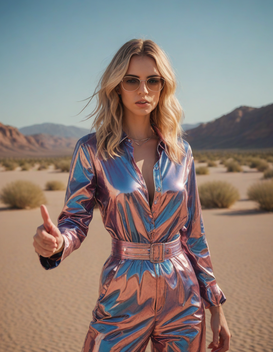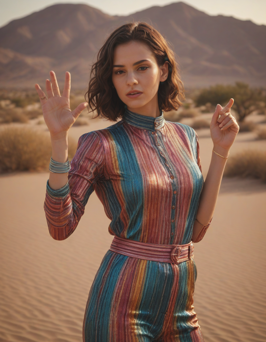 vibrant, retro disco outfit, fingers pointing in accusation, in the desert, Hand gripping tightly