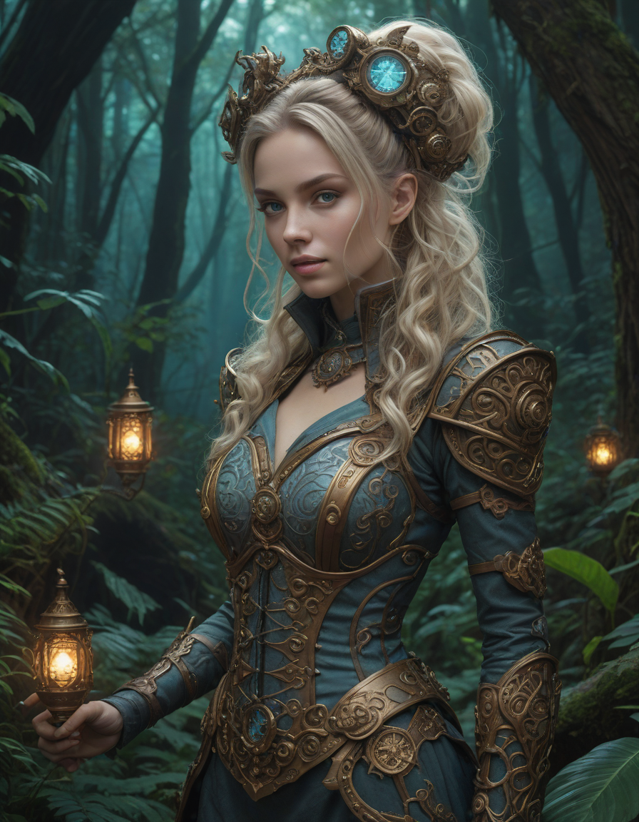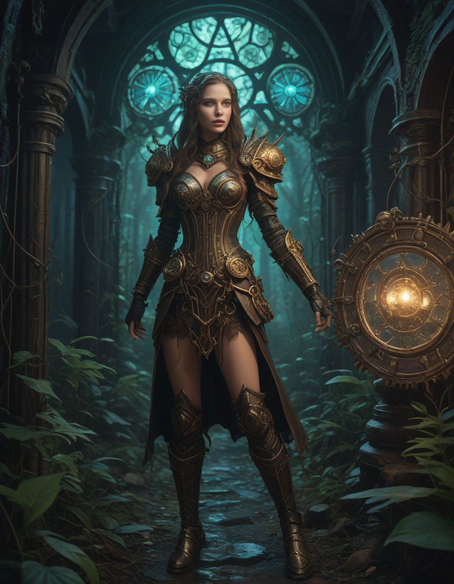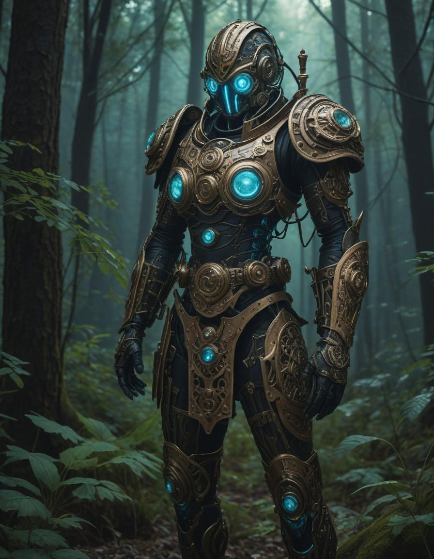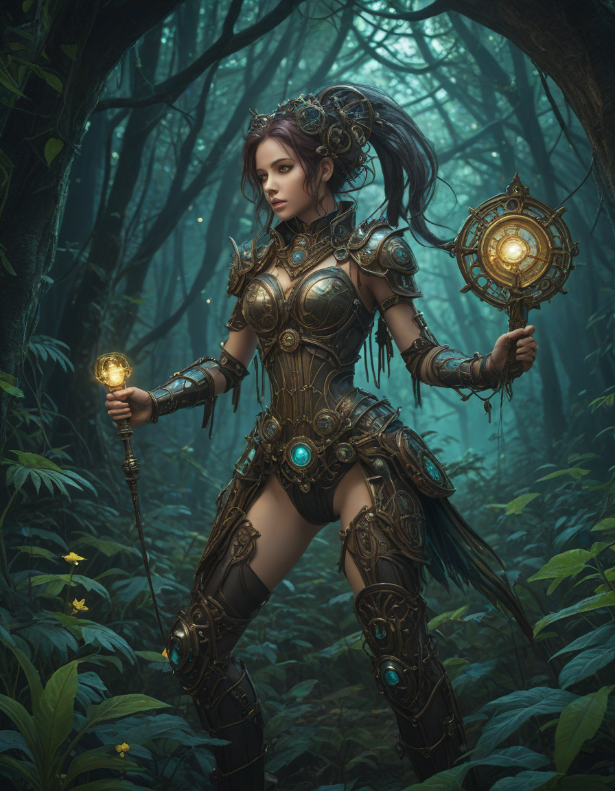 dynamic composition, magical fantasy forest, bioluminescent plants, ethereal atmosphere, highly detailed steampunk armor with intricate gears and mechanisms