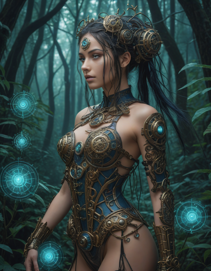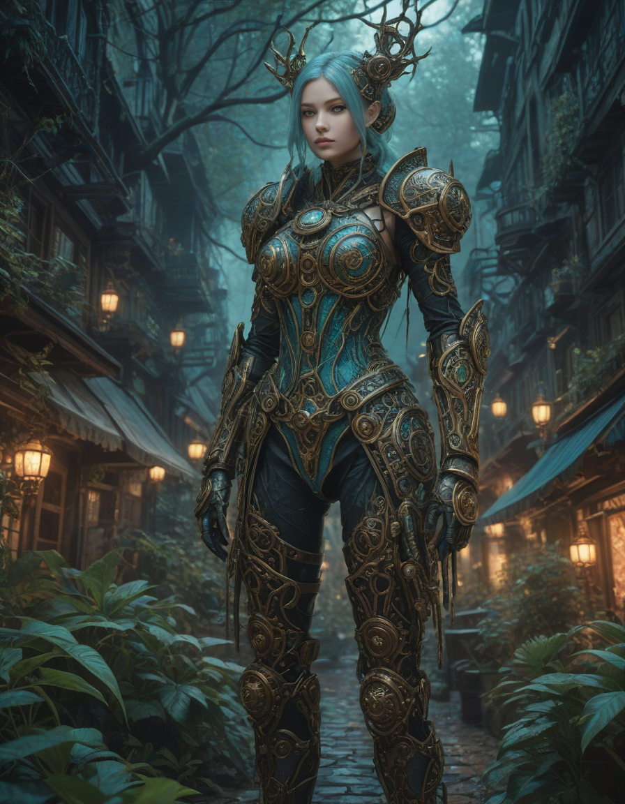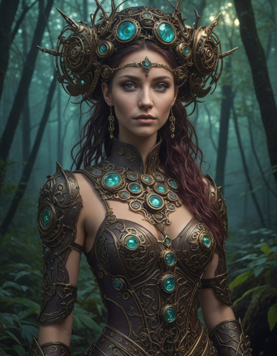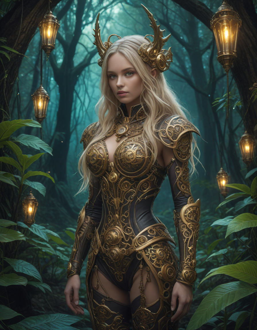 dynamic composition, magical fantasy forest, bioluminescent plants, ethereal atmosphere, highly detailed steampunk armor with intricate gears and mechanisms