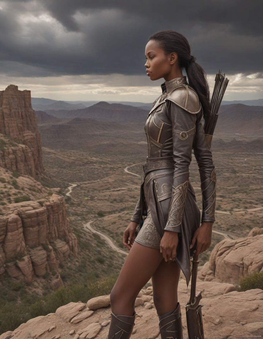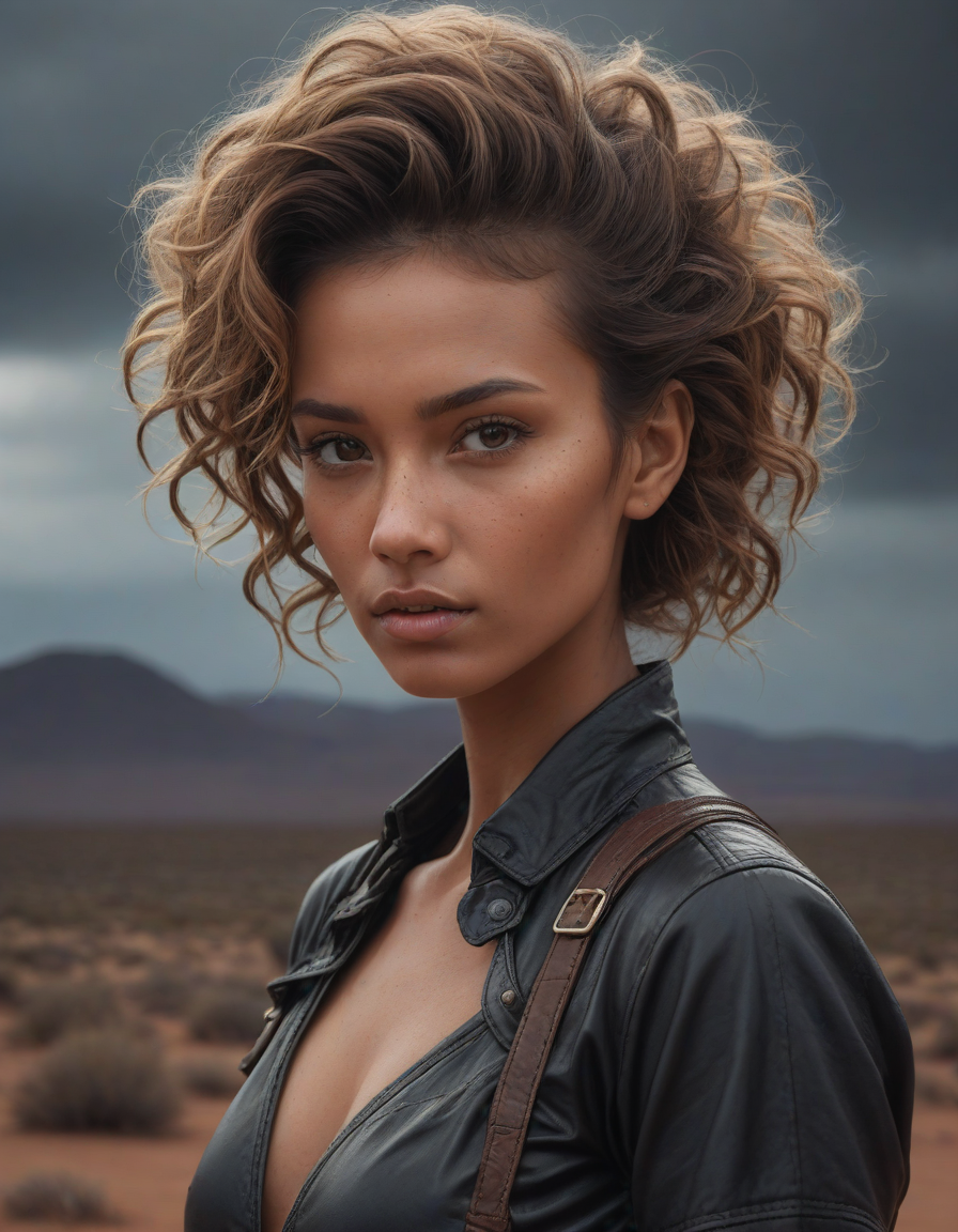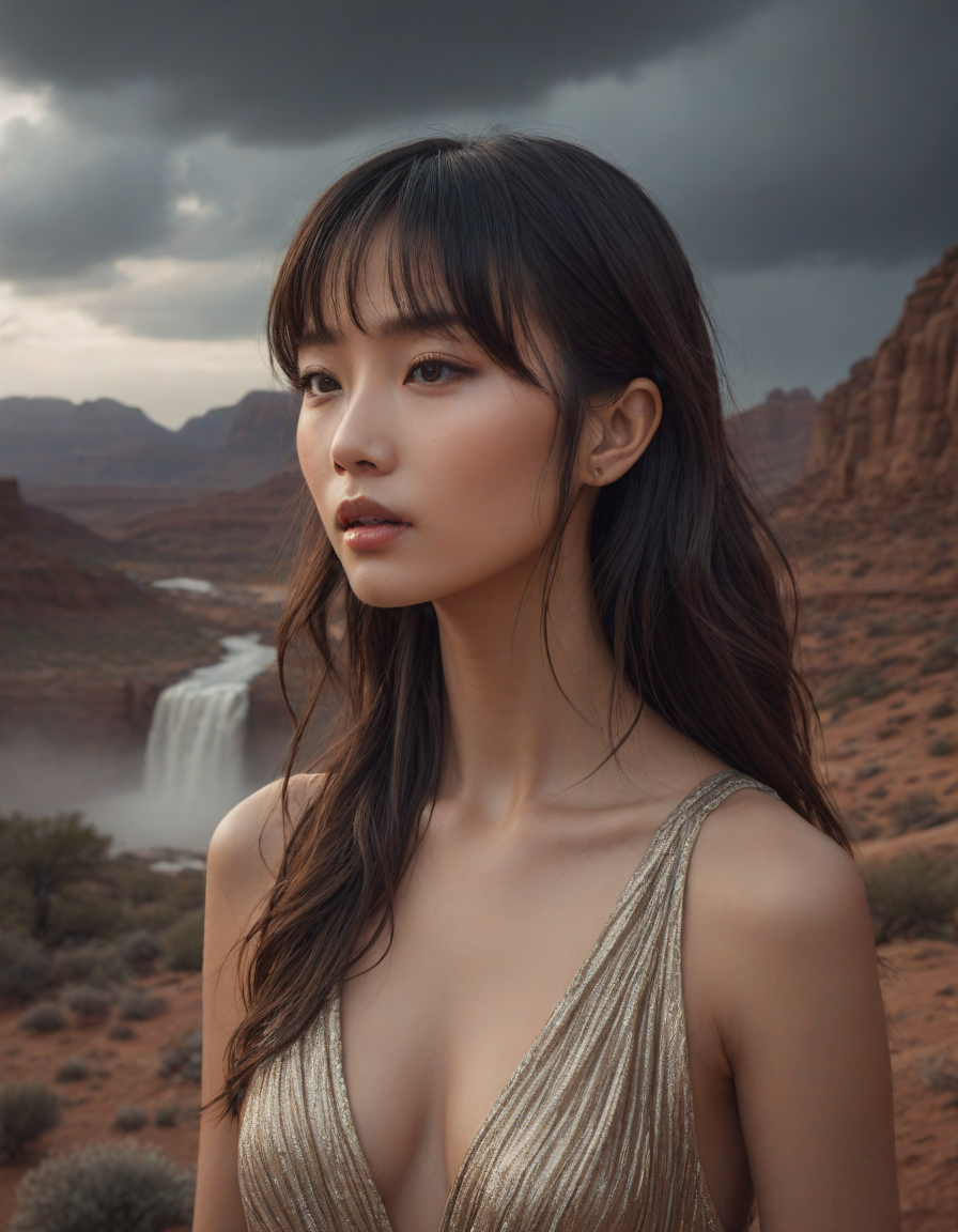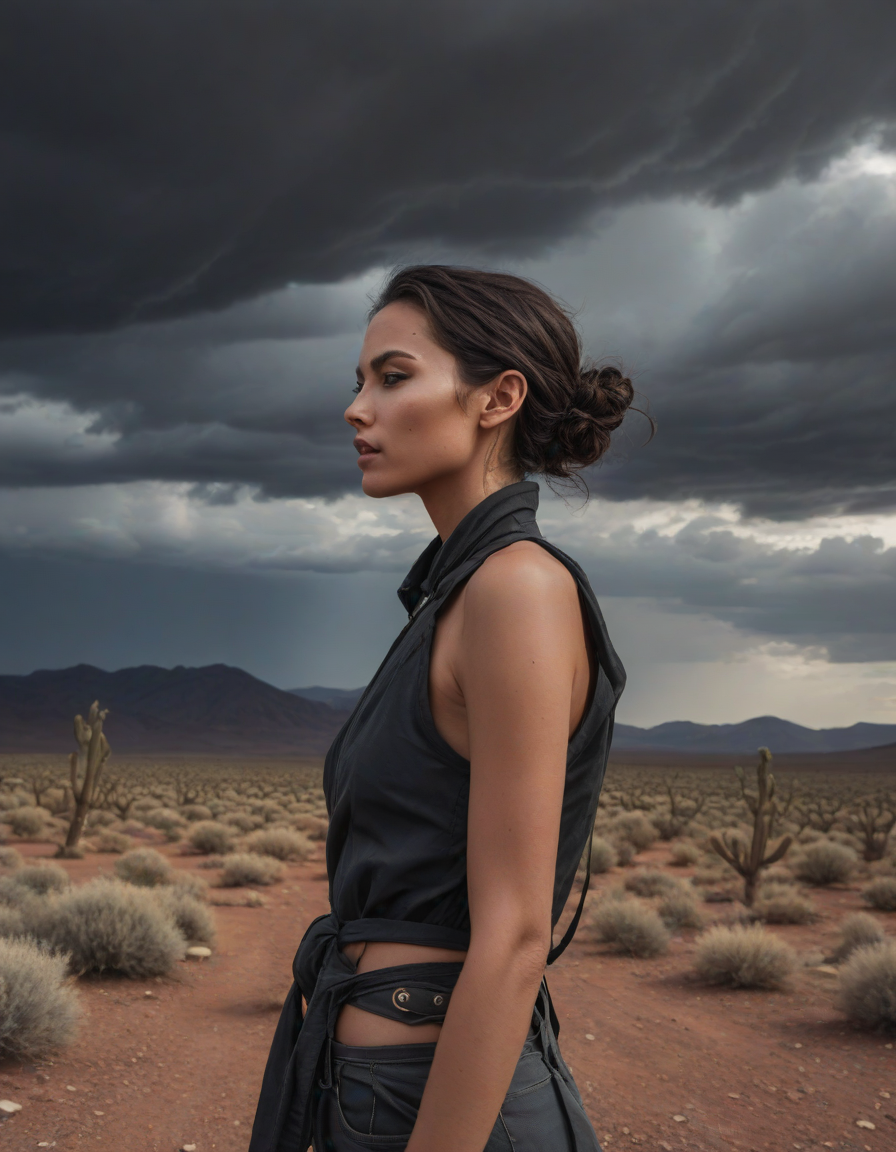 delicious, Trembling with joy, Ominous swirling thunderclouds over an arid valley, panicked, shimmering aura, Sculpted cheekbones, vibrant, glowing, and healthy skin