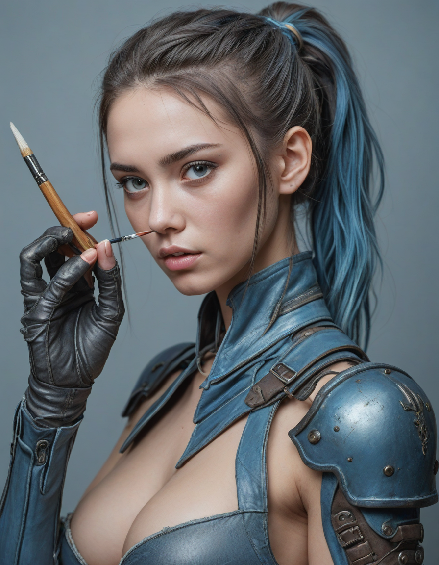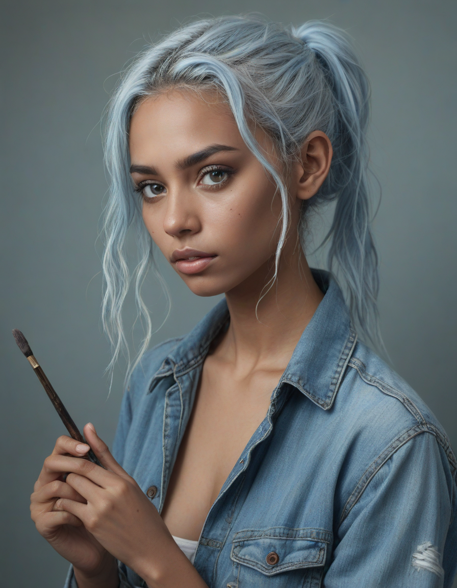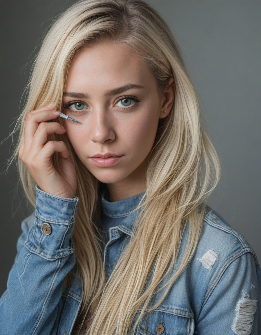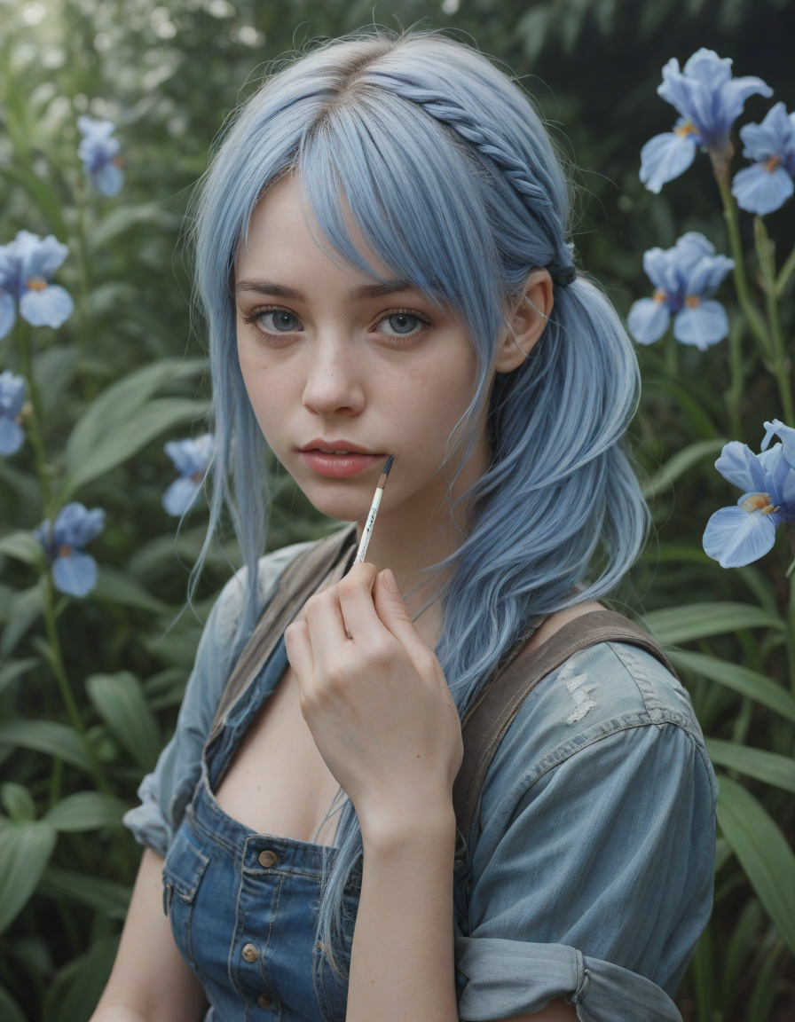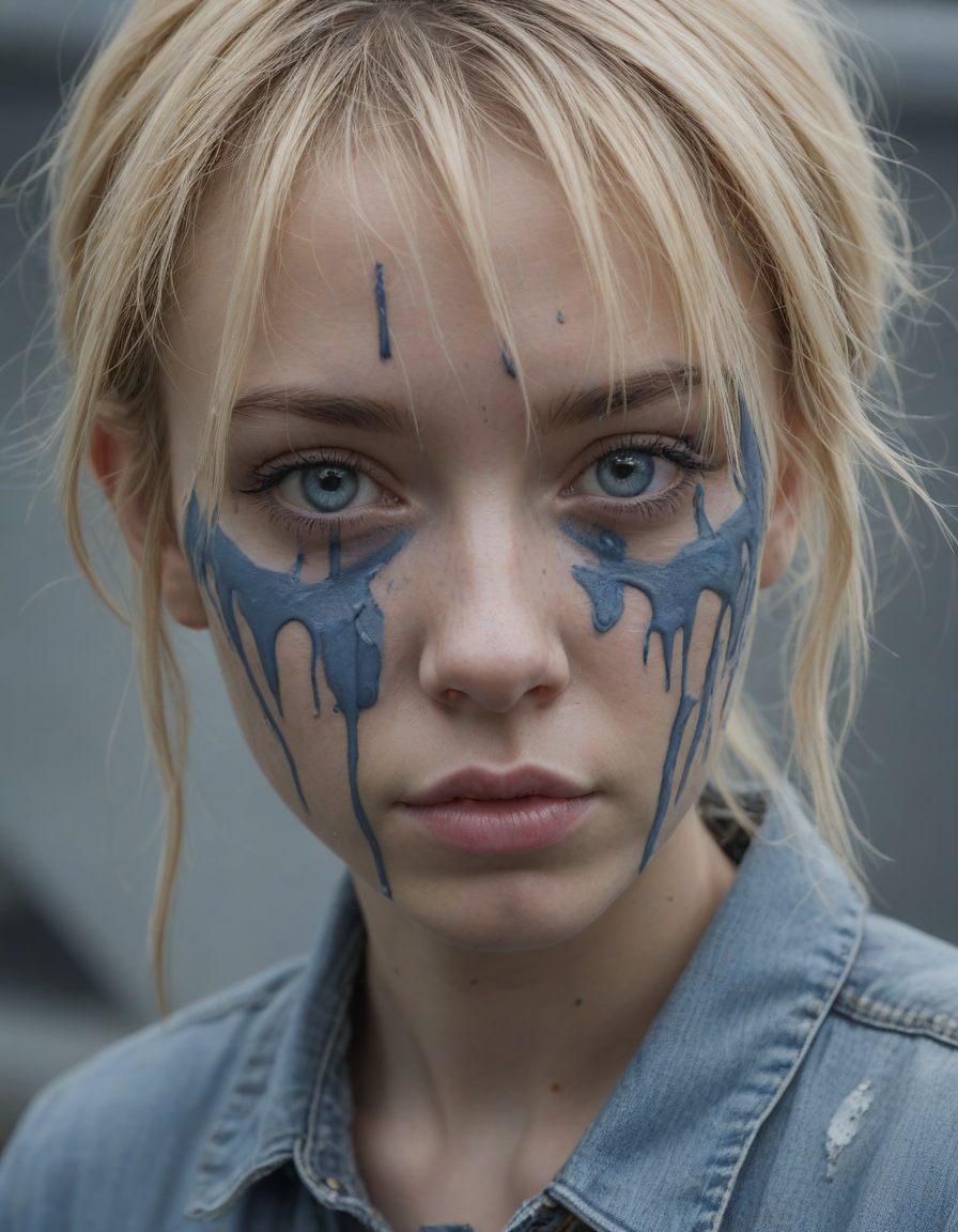 nervously wringing damp trembling hands, torn jeans and combat boots, holding a paintbrush, light blue colored iris pigment, light blue colored eyes, blue-iris-color, blue-eye-color,