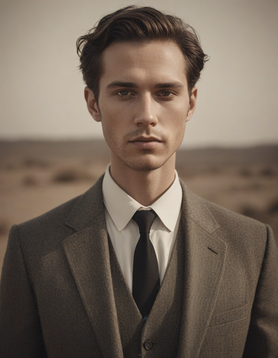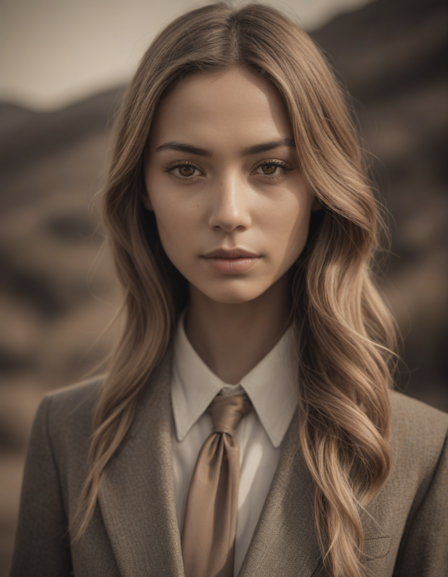 soulful, sepia toned photo, Enigmatic, crimson-flecked eyes, drone photography, A hint of desire, in a suit, western
