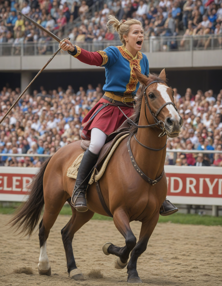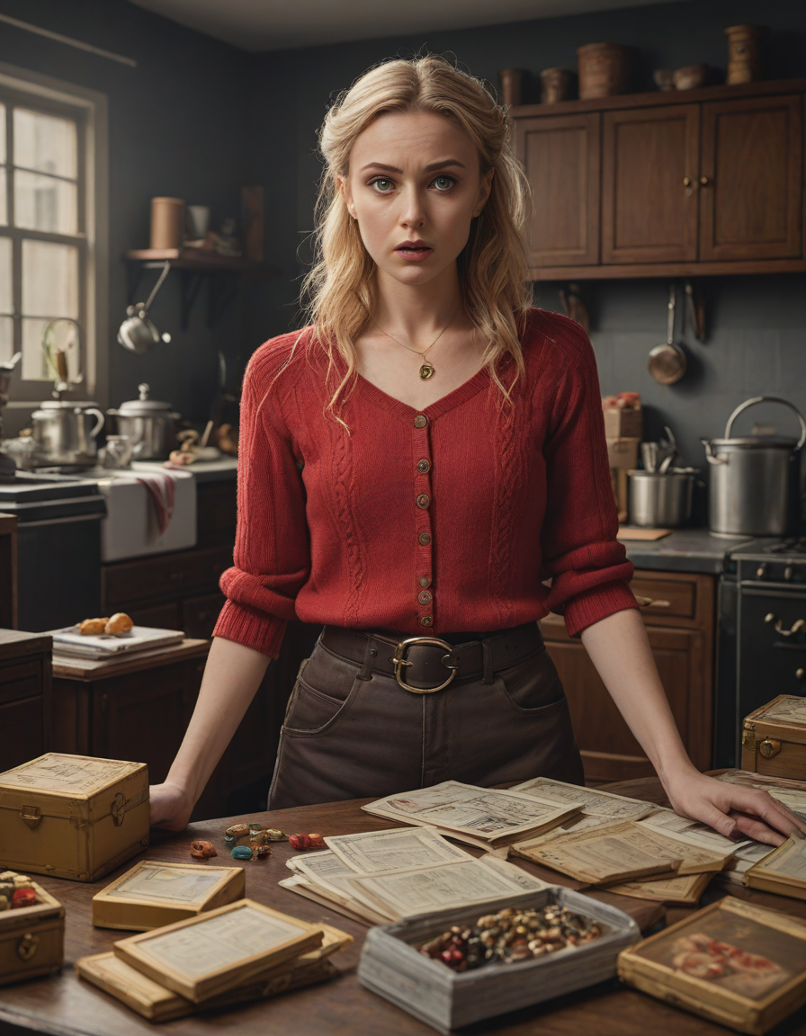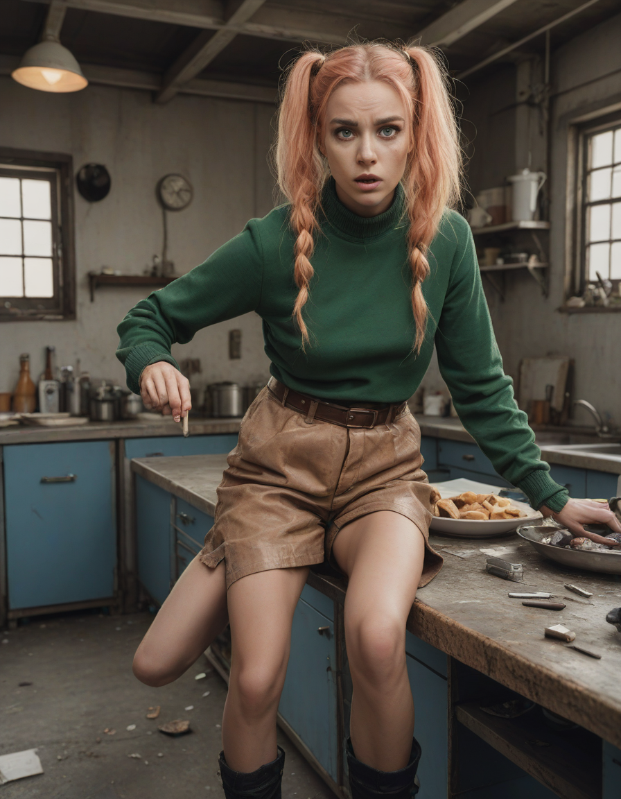 newspaper editorial photography, elf, the feeling of achieving max power, suspenseful chase scene, Couch potato, being chased, Gaudy sweater, manicured eyebrows in shock, in a kitchen