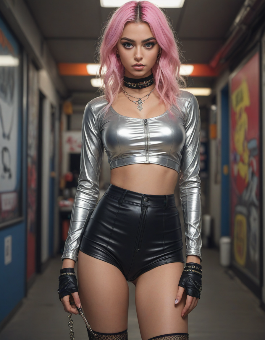 Her makeup is a canvas of e-girl artistry, with dramatic winged eyeliner that stretches towards her temples in a bold statement, eyeshadow in neon hues that electrify her gaze, and dark, matte lipstick that draws all eyes to her. A generous application of blush adds life and vibrancy to her cheeks, complemented by creatively designed nails that are both dark and daring. Accessories—silver chains, a heart pendant choker, and a collection of rings—add layers of personality and depth. Her hair, possibly featuring pastel or neon streaks, is styled in a way that balances edge with elegance, with temporary tattoos or stickers adorning her face to accentuate her playful rebellion.
