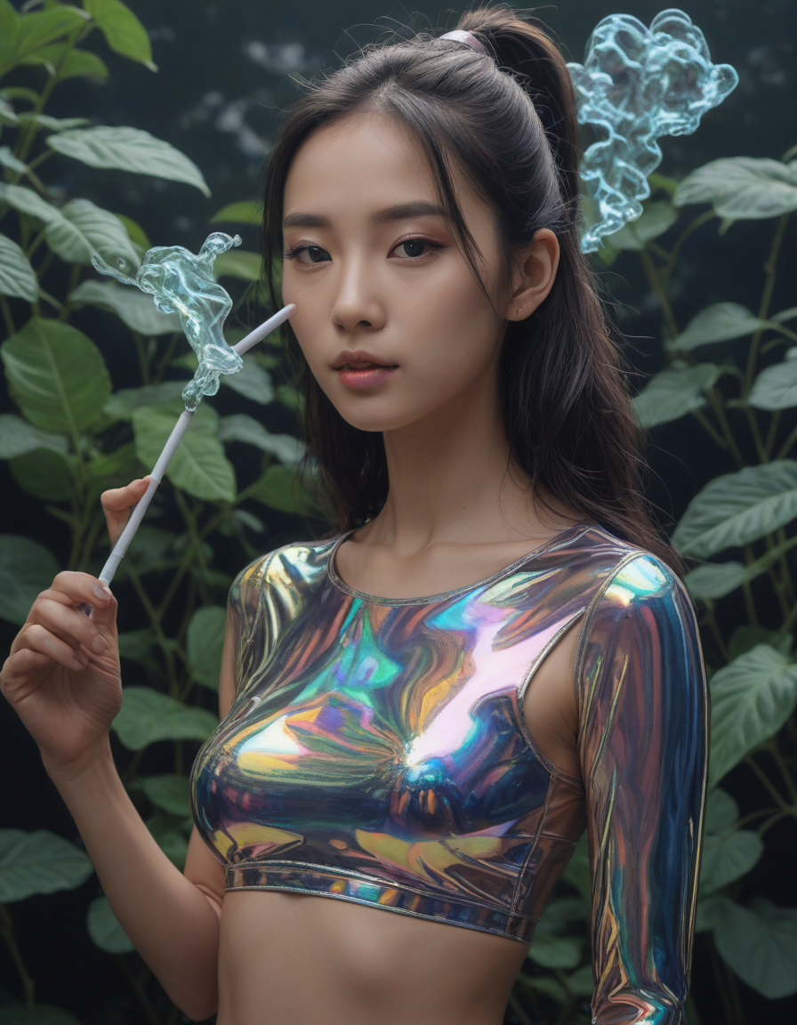 shiny, holographic crop top, Warmly Welcoming, Watching the world whizz by in technicolor, smoking a cigarette looking cool, trauma, impressed