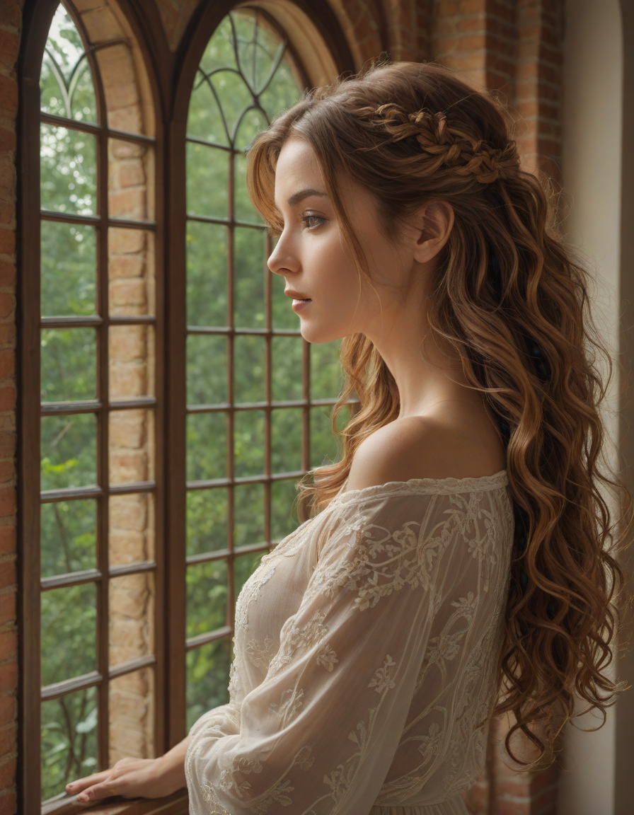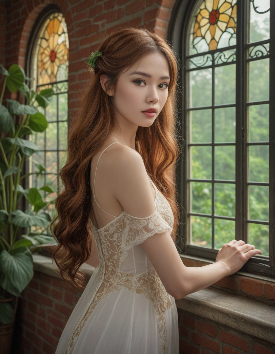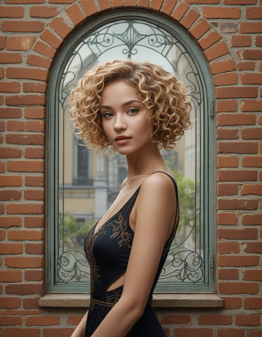 art nouveau style, dynamic composition, brick wall -> great window view