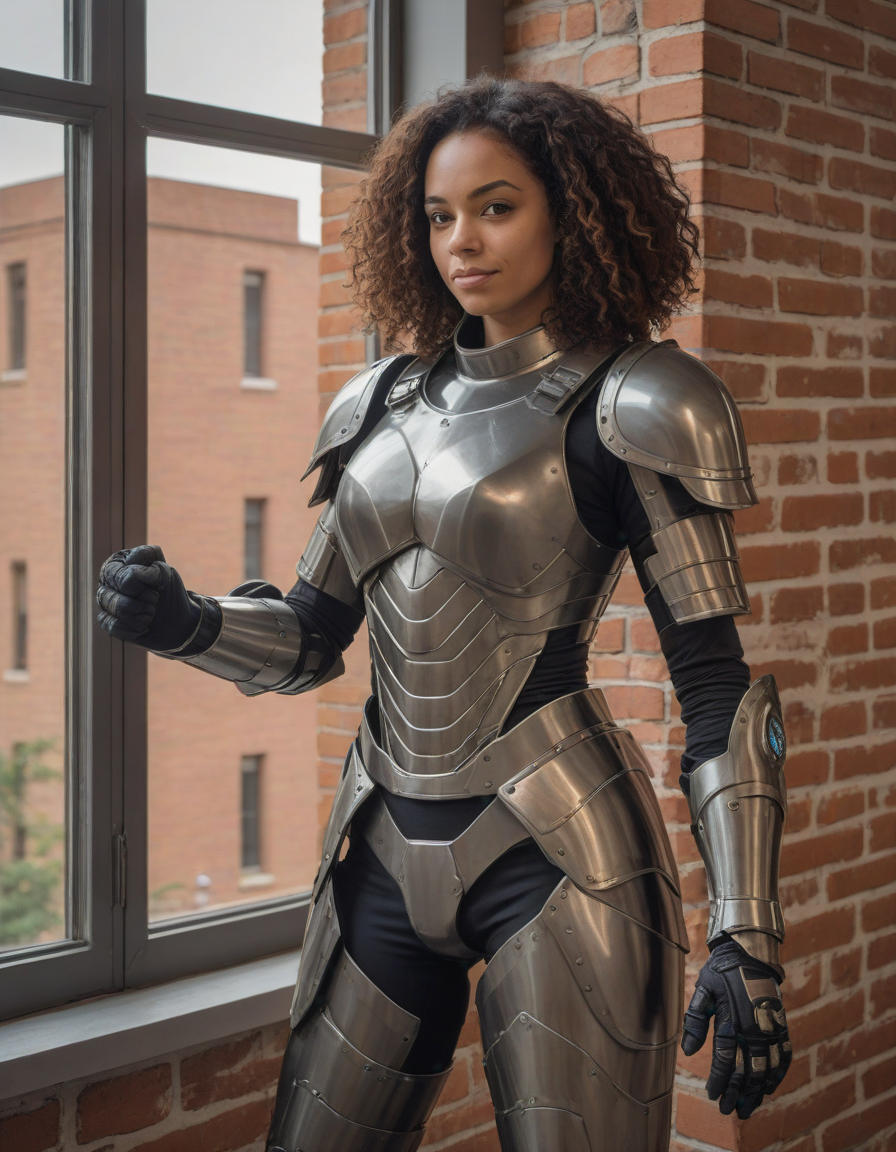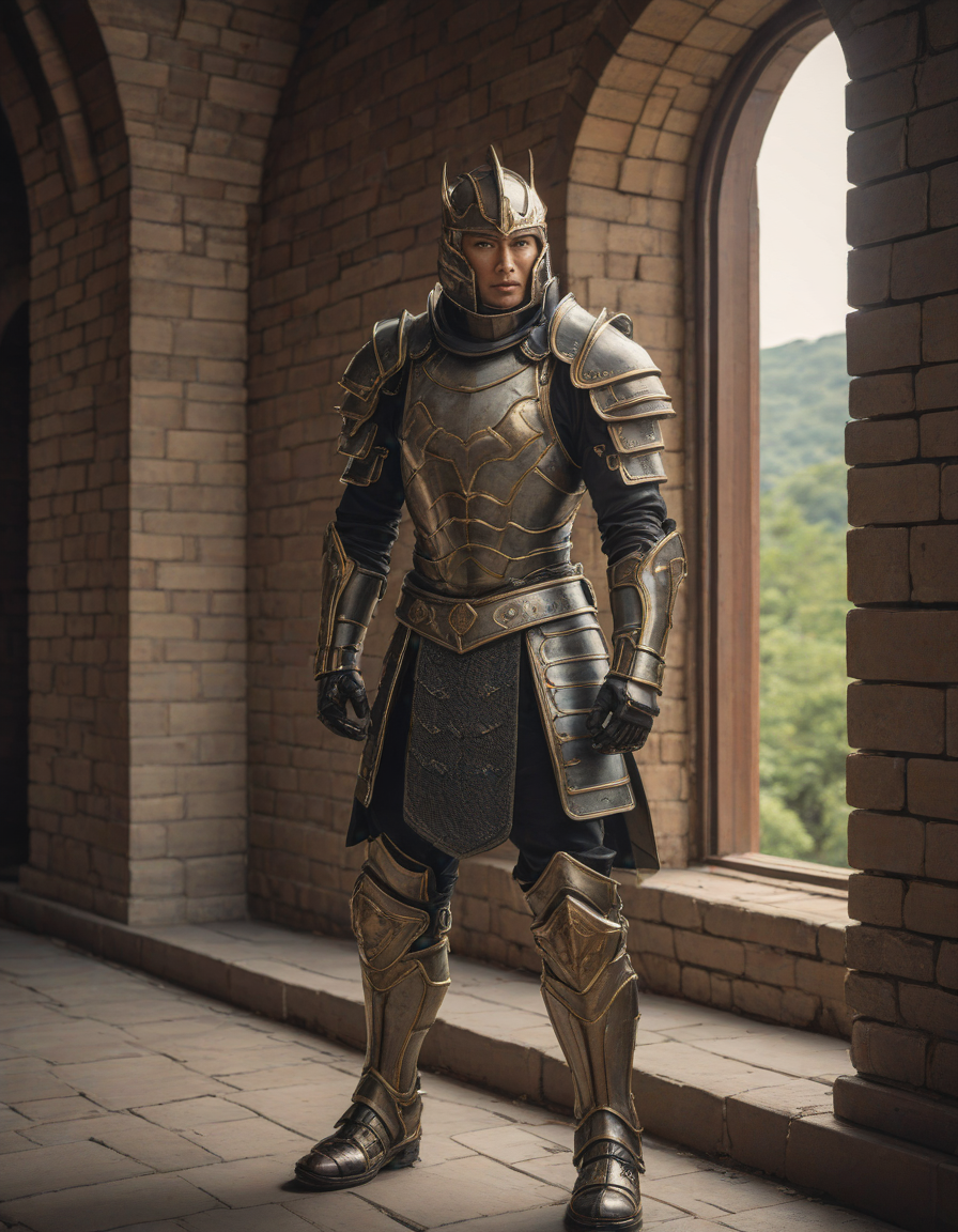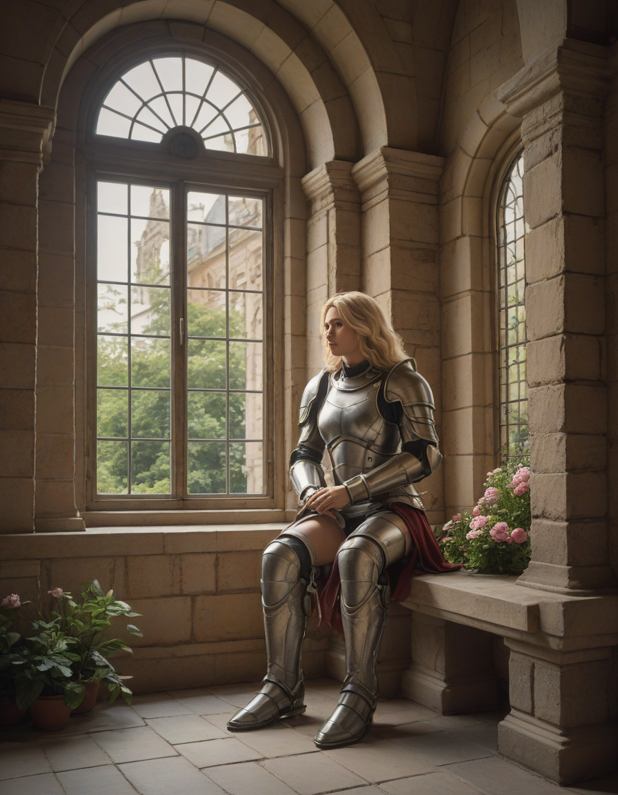 action, wearing complete set of armor, wearing full armor, Wearing chest armor, wearing leg armor, wearing feet armor, wearing bracer, wearing pauldrons,, brick wall -> great window view