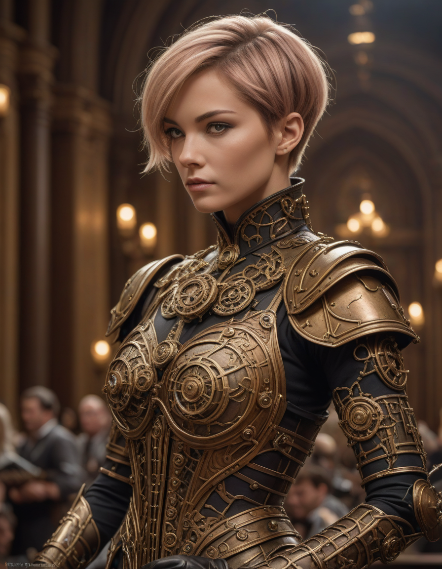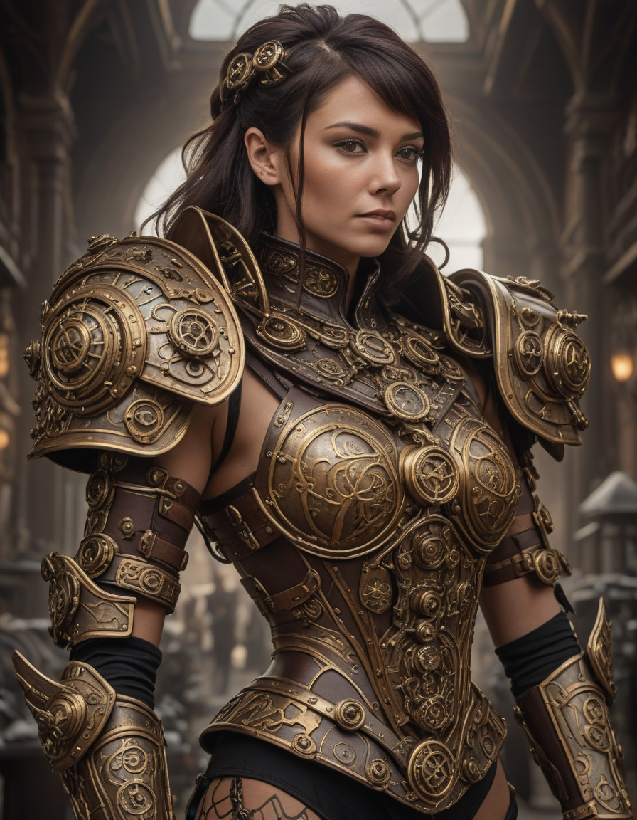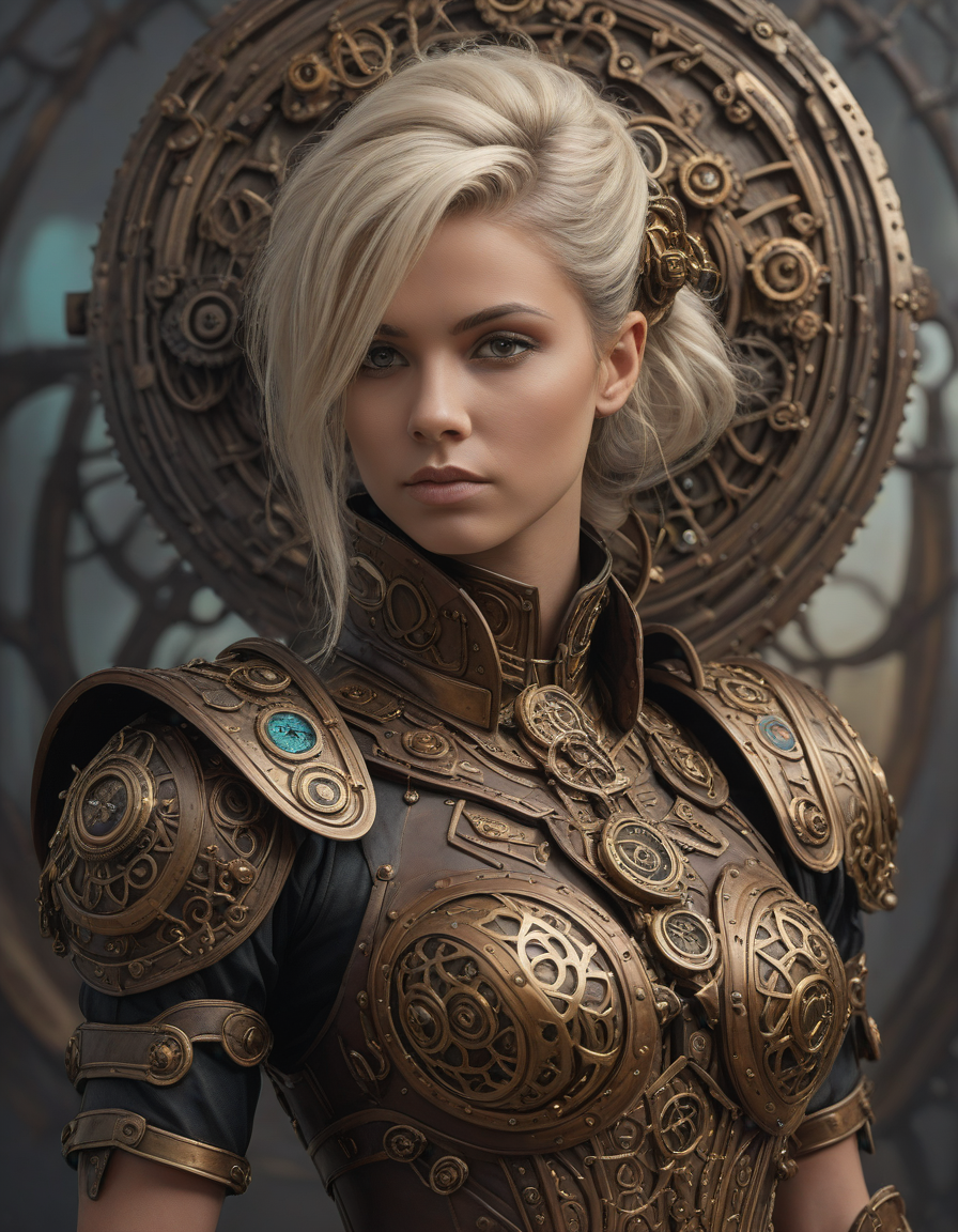 smooth brushstrokes, highly detailed steampunk armor with intricate gears and mechanisms