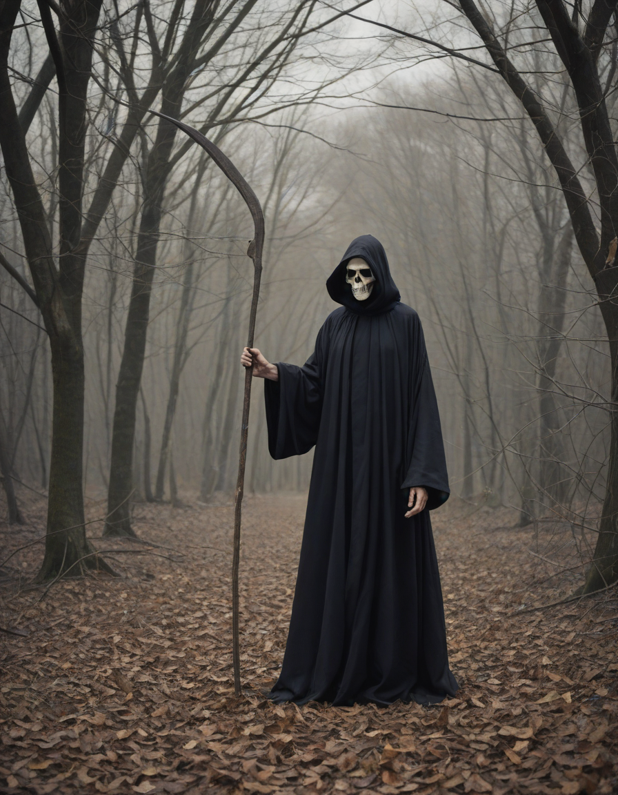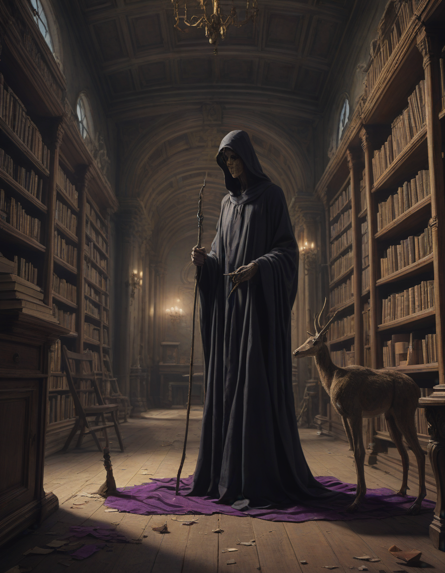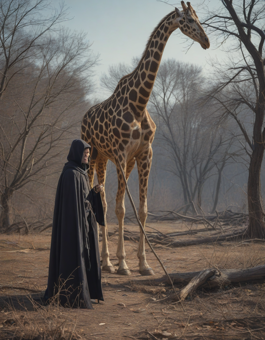 wide angle, grim reaper with a scythe, Cold hard reality, glimmers amethyst, Embarrassment, eerie, expertly blending, mesmerizing color palette, Gargantuan giraffes, Cloaked shadow