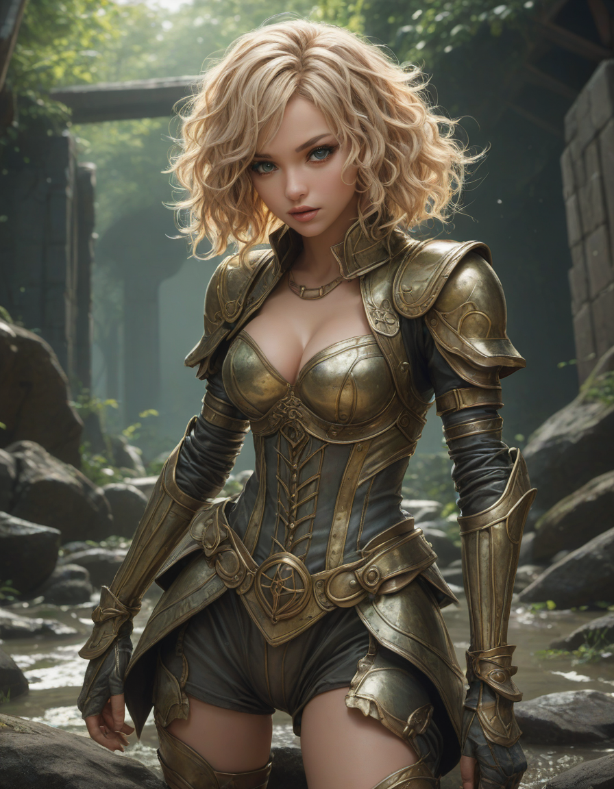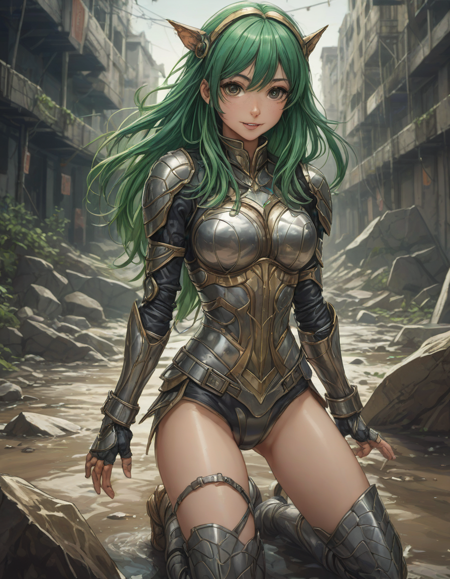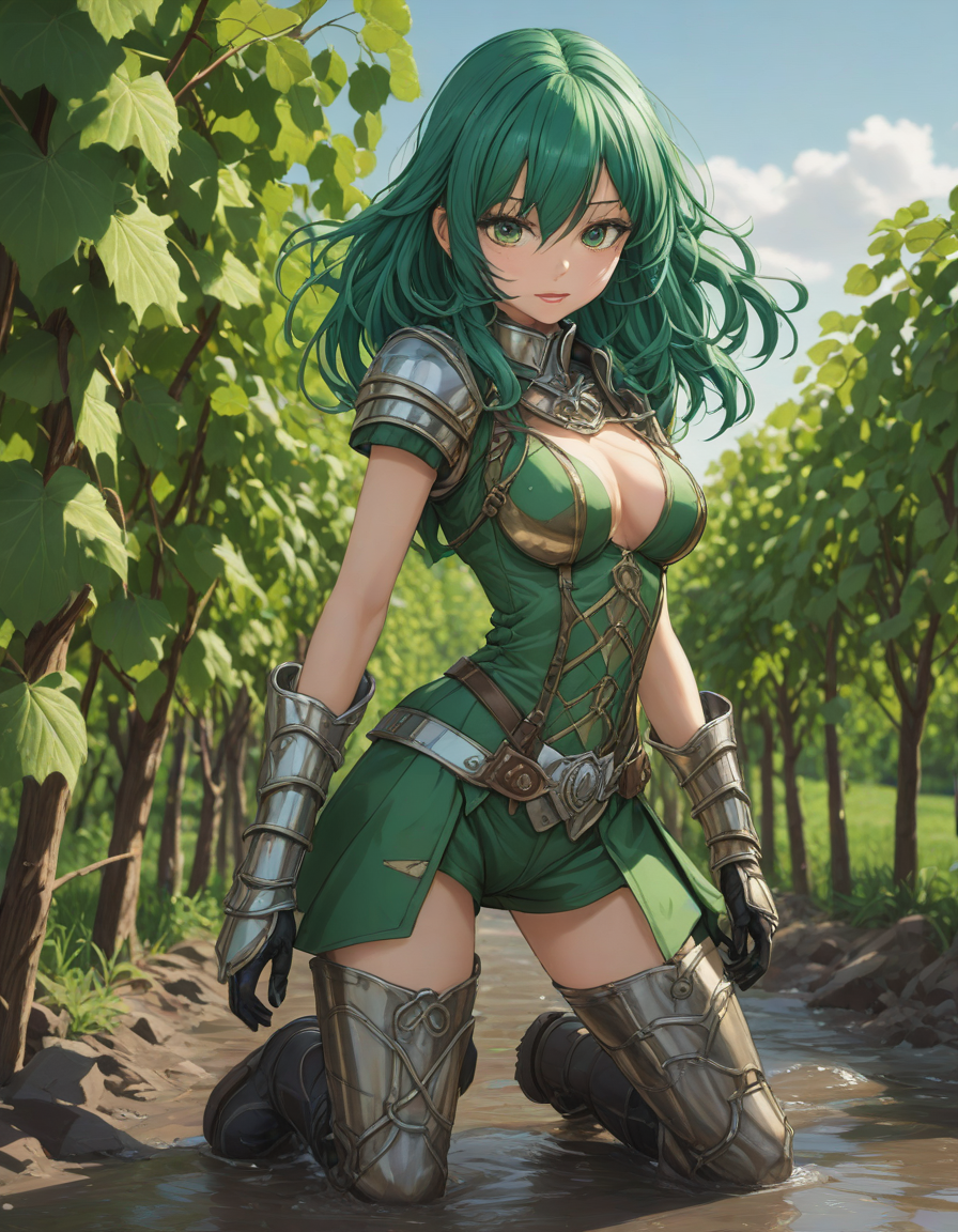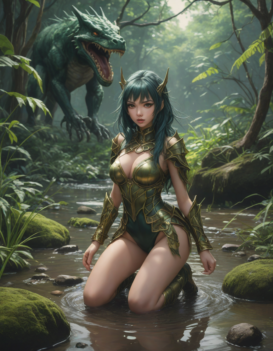 heroic, shining-armored knight, Tattered clothing, Women in vibrant Anime costumes, leprechaun, utterly embarrassed, excited, flood, view from behind, ferocious dragon, cover of a fashion magazine, lustrous hair, mouth opened, Toonlike eyes, kneeling in mud