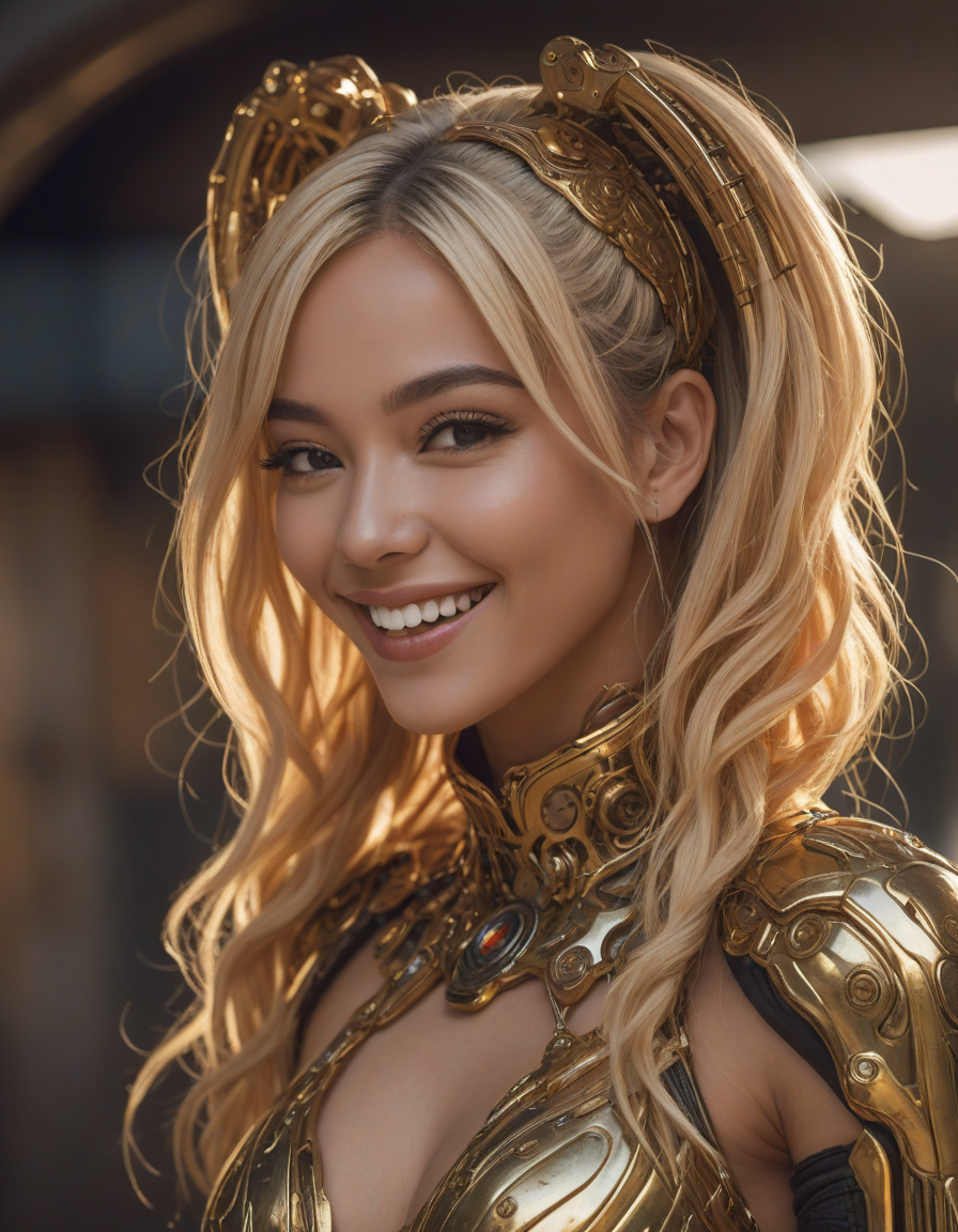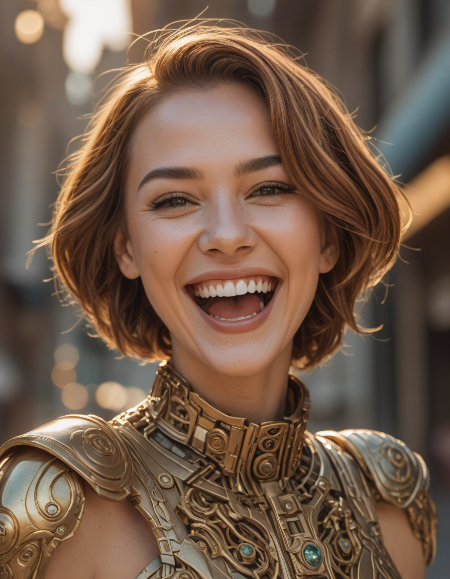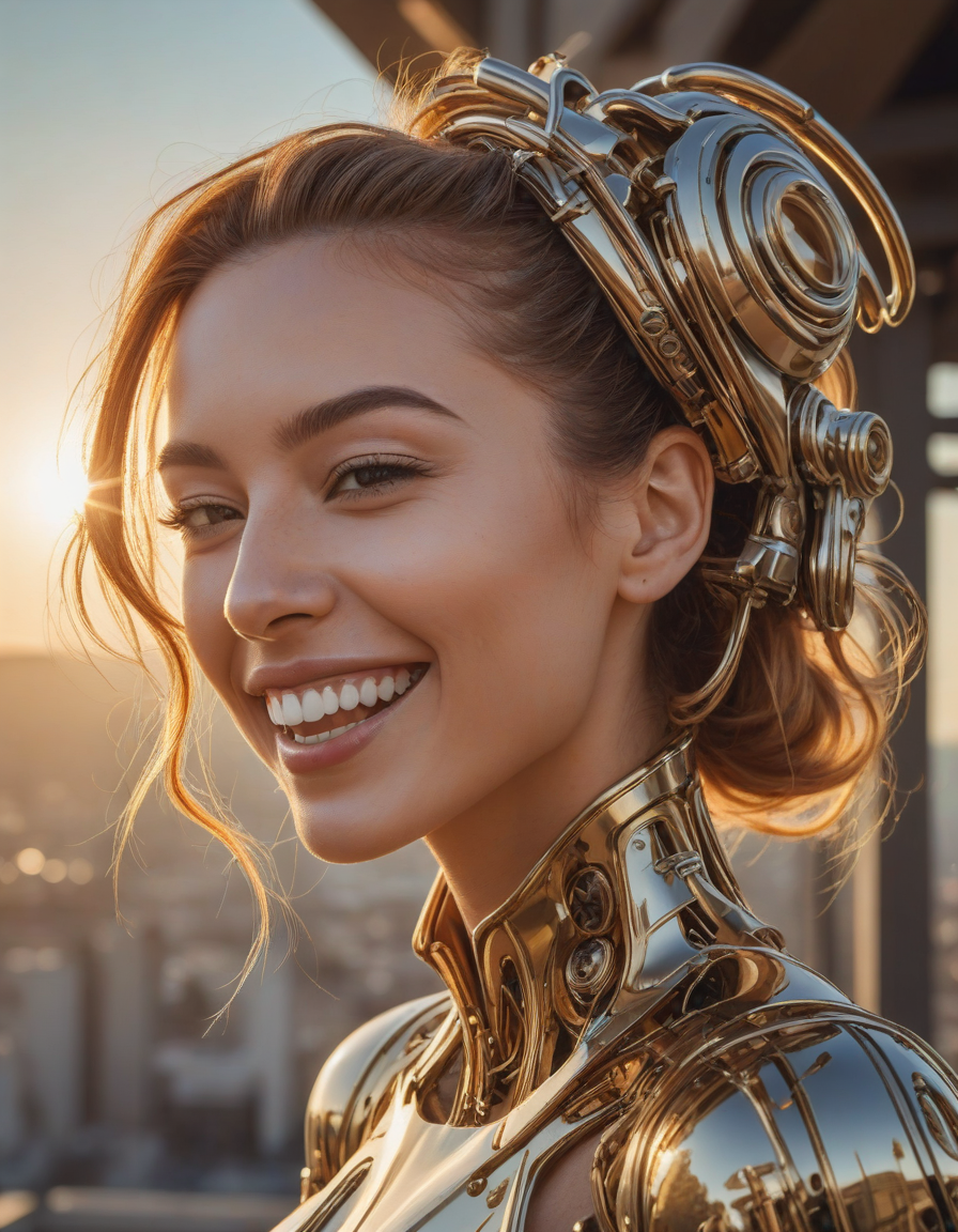 joyful laughing expression, eyes crinkled with mirth, detailed biomechanical elements, futuristic cyborg parts, golden hour lighting, highly stylized, artistic